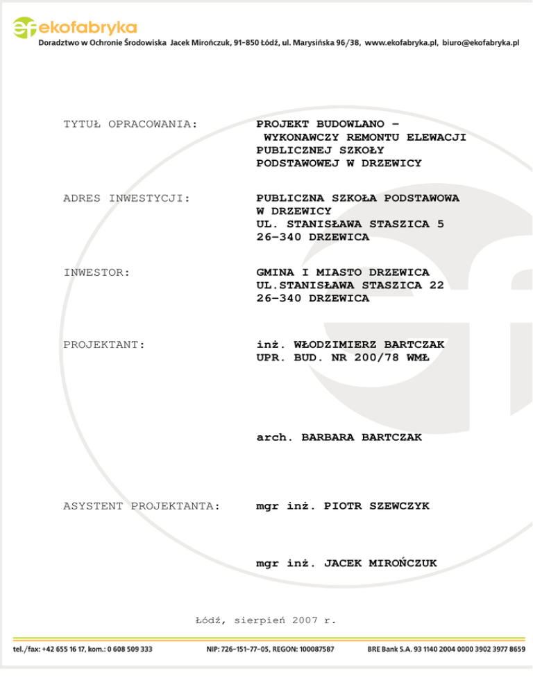 TYTUŁ OPRACOWANIA: PROJEKT BUDOWLANO – WYKONAWCZY REMONTU ELEWACJI PUBLICZNEJ SZKOŁY PODSTAWOWEJ W DRZEWICY ADRES INWESTYCJI: PUBLICZNA SZKOŁA PODSTAWOWA W DRZEWICY UL. STANISŁAWA STASZICA 5 26-340 DRZEWICA INWESTOR: GMINA I MIASTO DRZEWICA UL.STANISŁAWA STASZICA 22 26-340 DRZEWICA PROJEKTANT: inż. WŁODZIMIERZ BARTCZAK UPR. BUD. NR 200/78 WMŁ arch. BARBARA BARTCZAK ASYSTENT PROJEKTANTA: mgr inż. PIOTR SZEWCZYK mgr inż. JACEK MIROŃCZUK Łódź, sierpień 2007 r. Łódź 26.08.2007 r. OŚWIADCZENIE W świetle art. 20 ust. 4 ustawy z dnia 7 lipca 1994 roku – Prawo budowlane (Dz. U. Nr 207, poz. 2016 z 2003 r. z p. zm.) składam oświadczenie, jako projektant projektu pod nazwą: TYTUŁ OPRACOWANIA: PROJEKT BUDOWLANO – WYKONAWCZY REMONTU ELEWACJI PUBLICZNEJ SZKOŁY PODSTAWOWEJ W DRZEWICY ADRES INWESTYCJI: PUBLICZNA SZKOŁA PODSTAWOWA W DRZEWICY UL. STANISŁAWA STASZICA 5 26-340 DRZEWICA o sporządzeniu projektu budowlanego, zgodnie z obowiązującymi przepisami, w tym techniczno-budowlanymi, sanitarnymi, Polskimi Normami oraz zasadami wiedzy technicznej. Projekt budowlano – wykonawczy remontu elewacji Publicznej Szkoły Podstawowej w Drzewicy SPIS TREŚCI: 1. 2. 3. 4. 5. 6. 7. 8. 9. 10. 11. 12. 13. 14. 15. 16. Informacja dotycząca bezpieczeństwa i ochrony zdrowia przy wykonywaniu remontu elewacji budynku Publicznej Szkoły Podstawowej w Drzewicy Stan własności Opis ogólny budynku Podstawa opracowania Materiały i dane do projektu 5.1 Normy Stan istniejący budynku 6.1 Ściany 6.2 Stropodach 6.3 Okna i drzwi Opis techniczny remontu elewacji Docieplenie stropodachu Wykonanie obróbek blacharskich Wykonanie instalacji odgromowej Wymiana stolarki okiennej Wymiana drzwi zewnętrznych Schody wejściowe i zadaszenia Bezpieczeństwo pożarowe Zapewnienie jakości wykonania Część rysunkowa str. 1 z 16 Projekt budowlano – wykonawczy remontu elewacji Publicznej Szkoły Podstawowej w Drzewicy 1. INFORMACJA DOTYCZĄCA BEZPIECZEŃSTWA I OCHRONY ZDROWIA PRZY WYKONYWANIU REMONTU ELEWACJI PUBLICZNEJ SZKOŁY PODSTAWOWEJ W DRZEWICY Zakres robót dla całego zamierzenia budowlanego oraz kolejność realizacji poszczególnych prac Zakres robót przewidzianych „Projektem budowlano – wykonawczym remontu elewacji Publicznej Szkoły Podstawowej w Drzewicy” obejmuje: uzupełnienie ubytków tynku w ścianach, demontaż i ponowny montaż instalacji odgromowej oraz oświetlenia zewnętrznego, czyszczenie i malowanie ścian zewnętrznych, demontaż i montaż rynien i rur spustowych, wykonanie docieplenia stropodachu budynku dydaktycznego płytami styropianowymi, krycie stropodachów łącznika i sali gimnastycznej papą termozgrzewalną, wykonanie nowych obróbek blacharskich, wymianę okien i drzwi wejściowych w budynku dydaktycznym. W/w roboty będą realizowane jednoetapowo tzn. w tym samym czasie dla całego obiektu. Wykaz istniejących obiektów budowlanych podlegających adaptacji Obiekt podlegający adaptacji poprzez wykonanie remontu elewacji składa się z dwóch budynków połączonych ze sobą funkcjonalnie łącznikiem: - budynek dydaktyczny, - łącznik z przedsionkiem, - sala gimnastyczna z zapleczem. Wskazanie elementów zagospodarowania działki lub terenu, które mogą stwarzać zagrożenie bezpieczeństwa i zdrowia ludzi Zagospodarowanie działki składa się z dwóch elementów: - budynków szkoły, - dróg komunikacyjnych i placu sportowego. W budynku nie stwierdzono zagrożeń. Wszelkie usterki i niebezpieczeństwa usuwane są na bieżąco przez zarządcę budynku. W/w obiekt nie stwarza zagrożenia bezpieczeństwa i zdrowia ludzi. str. 2 z 16 Projekt budowlano – wykonawczy remontu elewacji Publicznej Szkoły Podstawowej w Drzewicy Wskazanie dotyczące przewidywanych podczas realizacji robót budowlanych zagrożeń występujących Przewidywane zagrożenia mogące wystąpić podczas realizacji robót, których zakres obejmuje projekt można podzielić na dwie zasadnicze grupy: A zagrożenia wynikające z możliwości dostępu prowadzonych robót osób niezatrudnionych na teren W/w zagrożenie wynika z konieczności funkcjonowania budynku szkolnego. Budynek musi być dostępny dla uczniów oraz pracowników szkoły przez większą część dnia. Nasilenie ruchu uczniów występuje w godzinach rannych i popołudniowych. Czas trwania zagrożenia: 8 - 10 godzin/dobę. Miejsce wystąpienia zagrożenia: pas o szerokości ~ 3,00 m wzdłuż odcinków komunikacyjnych. B zagrożenia związane z prowadzeniem prac na wysokości Prace będą prowadzone na wszystkich ścianach budynku sukcesywnie w czasie postępu prac. Po wykonaniu prac na ścianach będą prowadzone prace na dachu. Czas trwania zagrożenia: czas potrzebny do wykonania robót. Miejsca wystąpienia zagrożenia: pas 6 m od elewacji budynku. Wskazanie sposobu prowadzenia instruktażu pracowników przed przystąpieniem do realizacji robót szczególnie niebezpiecznych Pracownicy, którzy zostali wyznaczeni przez Kierownika do wykonywania robót w strefach niebezpiecznych powinni: - odbyć szkolenie z zakresu BHP na budowie, legitymować się aktualnym zaświadczeniem dopuszczającym do pracy „na wysokościach”. Instruktaż pracowników przed przystąpieniem strefie niebezpiecznej powinien składać się z: - - do Budowy lekarskim realizacji w codziennego omówienia zakresu robót i czynności przewidzianych do wykonania w danym dniu ze szczegółowym omówieniem przewidywanych zagrożeń BHP i pożarowego (mogących wystąpić w trakcie wykonywania robót), sposobu zabezpieczenia się przed nimi oraz ich wyeliminowania; krótkie szkolenie z zakresu bhp na stanowiskach roboczych połączone z kontrolą wyposażenia pracownika w odpowiednią odzież roboczą i osobisty sprzęt ochronny. str. 3 z 16 Projekt budowlano – wykonawczy remontu elewacji Publicznej Szkoły Podstawowej w Drzewicy Kierownicy Robót są zobowiązani do przekazania Kierownikowi Budowy informacji na piśmie o przeszkoleniu pracowników zgod