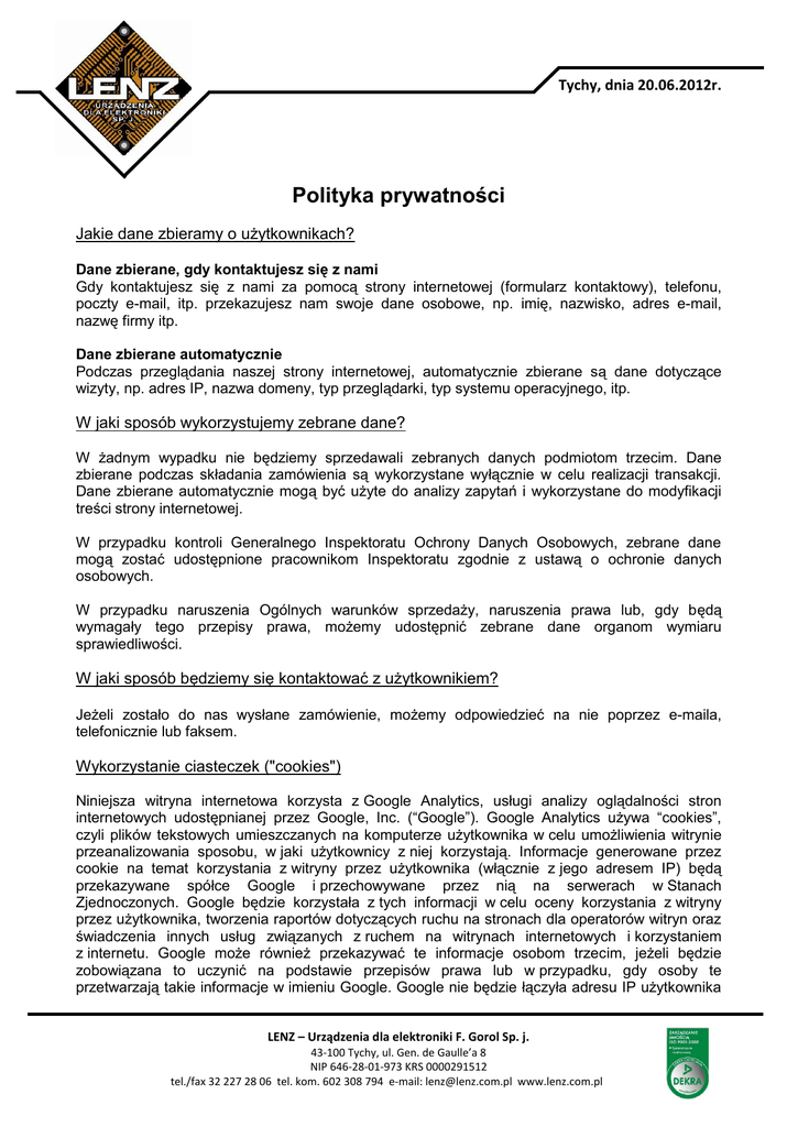 tel./fax 32 227 28 06 tel. kom. 602 308 794 e-mail: [email protected] www.lenz.com.pl