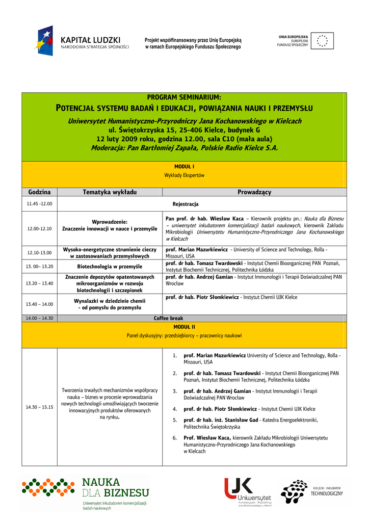 Projekt współfinansowany przez Unię Europejską w ramach Europejskiego Funduszu Społecznego PROGRAM SEMINARIUM: POTENCJAŁ SYSTEMU BADAŃ I EDUKACJI, POWIĄZANIA NAUKI I PRZEMYSŁU Uniwersytet Humanistyczno-Przyrodniczy Jana Kochanowskiego w Kielcach ul. Świętokrzyska 15, 25-406 Kielce, budynek G 12 luty 2009 roku, godzina 12.00, sala C10 (mała aula) Moderacja: Pan Bartłomiej Zapała, Polskie Radio Kielce S.A. MODUŁ I Wykłady Ekspertów Godzina Tematyka wykładu Prowadzący Rejestracja 11.45 -12.00 12.00-12.10 Wprowadzenie: Znaczenie innowacji w nauce i przemyśle Pan prof. dr hab. Wiesław Kaca – Kierownik projektu pn.: Nauka dla Biznesu – uniwersytet inkubatorem komercjalizacji badań naukowych, kierownik Zakładu Mikrobiologii Uniwersytetu Humanistyczno-Przyrodniczego Jana Kochanowskiego w Kielcach 12.10-13.00 Wysoko-energetyczne strumienie cieczy w zastosowaniach przemysłowych 13. 00– 13.20 Biotechnologia w przemyśle 13.20 – 13.40 Znaczenie depozytów opatentowanych mikroorganizmów w rozwoju biotechnologii i szczepionek 13.40 – 14.00 Wynalazki w dziedzinie chemii - od pomysłu do przemysłu 14.00 – 14.30 prof. Marian Mazurkiewicz - University of Science and Technology, Rolla Missouri, USA prof. dr hab. Tomasz Twardowski - Instytut Chemii Bioorganicznej PAN Poznań, Instytut Biochemii Technicznej, Politechnika Łódzka prof. dr hab. Andrzej Gamian - Instytut Immunologii i Terapii Doświadczalnej PAN Wrocław prof. dr hab. Piotr Słomkiewicz - Instytut Chemii UJK Kielce Coffee break MODUŁ II Panel dyskusyjny: przedsiębiorcy – pracownicy naukowi 14.30 – 15.15 Tworzenia trwałych mechanizmów współpracy nauka – biznes w procesie wprowadzania nowych technologii umożliwiających tworzenie innowacyjnych produktów oferowanych na rynku. 1. prof. Marian Mazurkiewicz University of Science and Technology, Rolla Missouri, USA 2. prof. dr hab. Tomasz Twardowski - Instytut Chemii Bioorganicznej PAN Poznań, Instytut Biochemii Technicznej, Politechnika Łódzka 3. prof. dr hab. Andrzej Gamian - Instytut Immunologii i Terapii Doświadczalnej PAN Wrocław 4. prof. dr hab. Piotr Słomkiewicz - Instytut Chemii UJK Kielce 5. prof. dr hab. inż. Stanisław Gad - Katedra Energoelektroniki, Politechnika Świętokrzyska 6. Prof. Wiesław Kaca, kierownik Zakładu Mikrobiologii Uniwersytetu Humanistyczno-Przyrodniczego Jana Kochanowskiego w Kielcach