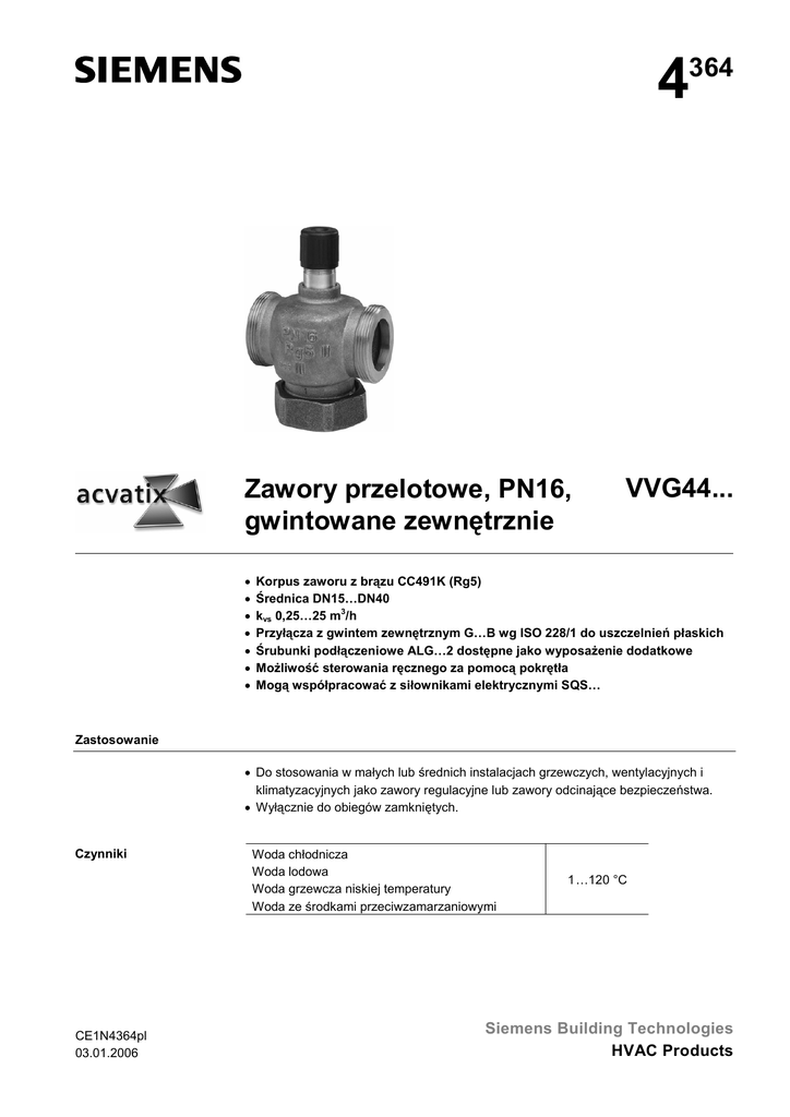 4 Zawory przelotowe, PN16, gwintowane zewnętrznie • • • • • • • 364 VVG44... Korpus zaworu z brązu CC491K (Rg5) Średnica DN15…DN40 kvs 0,25…25 m3/h Przyłącza z gwintem zewnętrznym G…B wg ISO 228/1 do uszczelnień płaskich Śrubunki podłączeniowe ALG…2 dostępne jako wyposażenie dodatkowe Możliwość sterowania ręcznego za pomocą pokrętła Mogą współpracować z siłownikami elektrycznymi SQS… Zastosowanie • Do stosowania w małych lub średnich instalacjach grzewczych, wentylacyjnych i klimatyzacyjnych jako zawory regulacyjne lub zawory odcinające bezpieczeństwa. • Wyłącznie do obiegów zamkniętych. Czynniki CE1N4364pl 03.01.2006 Woda chłodnicza Woda lodowa Woda grzewcza niskiej temperatury Woda ze środkami przeciwzamarzaniowymi 1 …120 °C Siemens Building Technologies HVAC Products Zestawienie typów Oznaczenie typu DN kvs Sv [m3/h] VVG44.15-0.25 0,25 VVG44.15-0.4 0,4 VVG44.15-0.63 0,63 15 VVG44.15-1 > 50 1 VVG44.15-1.6 1,6 VVG44.15-2.5 2,5 VVG44.15-4 4 VVG44.20-6.3 20 6,3 VVG44.25-10 25 10 VVG44.32-16 32 16 VVG44.40-25 40 25 > 100 DN = Średnica nominalna kvs = Nominalne natężenie przepływu zimnej wody (5…30 °C) przez całkowicie otwarty zawór (H100) przy spadku ciśnienia 100 kPa (1 bar) Sv = Iloraz szerokości zakresów kvs / kvr kvr = Najmniejsza wartość kv, dla której mogą być jeszcze utrzymane tolerancje charakterystyki przepływu, przy spadku ciśnienia 100 kPa (1 bar) Wyposażenie dodatkowe Zamawianie Oznaczenie typu Opis ALG…2 Komplet śrubunków gwintowanych (2 szt.) do zaworów przelotowych: - 2 nakrętki łączące - 2 półśrubunki - 2 uszczelki płaskie Przy zamawianiu należy podać ilość, opis i oznaczenie typu urządzenia. Przykład: Dostawa 3 zawory VVG44.25-10 3 komplety śrubunków gwintowanych ALG252 Zawory, siłowniki i wyposażenie dodatkowe pakowane i dostarczane są oddzielnie. Urządzenia współpracujące Zawory Siłowniki SQS… ∆pmax [kPa] Śrubunki ∆ps [kPa] Oznaczenie typu VVG44.15-0.25 1600 VVG44.15-0.4 VVG44.15-0.63 VVG44.15-1 VVG44.15-1.6 400 VVG44.15-2.5 725 ALG152 400 VVG44.15-4 VVG44.20-6.3 750 ALG202 VVG44.25-10 450 ALG252 VVG44.32-16 250 250 ALG322 VVG44.40-25 125 125 ALG402 ∆pmax = Maksymalna dopuszczalna różnica ciśnienia w kanale regulacyjnym zaworu, obowiązująca dla całego zakresu skoku zaworu z siłownikiem ∆ps = Maksymalna dopuszczalna różnica ciśnienia, przy której zawór-z siłownikiem jeszcze niezawodnie się zamyka pokonując ciśnienie (ciśnienie zamykające) 2/6 Siemens Building Technologies HVAC Products Zawory przelotowe, PN16, gwintowane zewnętrznie CE1N4364pl 03.01.2006 Zestawienie siłowników Oznaczenie typu Napięcie zasilania Czas przebiegu Sygnał sterujący SQS35.00 SQS35.03 SQS35.50 Przebieg ze sprężyną nie –– tak 8s tak 8s nie –– 150 s 230 V AC 35 s 3-stawny 150 s SQS35.53 35 s SQS65.5 0…10 V DC SQS65 SQS65.2 Sprężyna powrotna 24 V AC 0…1000 Ω 35 s 2…10 V DC SQS85.00 150 s 3-stawny SQS85.03 35 s Siłowniki SQS… opisane są w karcie katalogowej N4573 Budowa Przekrój zaworu Prowadzony grzyb paraboliczny przymocowany do trzpienia. 4364Z01 Gniazdo zamocowane w korpusie zaworu specjalnym materiałem uszczelniającym. Zawór przelotowy po odkręceniu zaślepki nie staje się zaworem trójdrogowym! Dobór zaworów 4 5 6 3 2 0,4 0,5 0,6 0,8 1 16,8 14 11,2 30 8,4 20 5,8 2,8 2,2 s - kv DN 25 40 6 -1 32 0 -1 25 ,3 -6 20 -4 15 ,5 -2 15 ,6 -1 15 -1 15 ,63 -0 5 1 ,4 -0 15 ,25 -0 15 2 1 0,8 0,6 0,5 0,4 0,3 0,2 0,85 0,6 0,3 0,2 0,175 0,15 0,11 0,08 V100 [l/s] 3 1,7 1,4 1,1 ∆ pmax 6 5 4 0,06 ∆pv100 [kPa] 400 500 600 300 200 80 100 40 50 60 0,006 30 0,02 20 0,0085 8 10 0,03 4 5 6 0,017 0,014 0,011 3 0,06 0,05 0,04 2 0,03 0,02 1 0,1 0,08 4364D01 0,3 0,08 0,1 0,04 0,05 0,06 0,03 0,02 0,01 60 50 40 10 8 V100 [m³/h] 0,2 ∆pv100 [bar] Wykres doboru 3/6 Siemens Building Technologies HVAC Products Zawory przelotowe, PN16, gwintowane zewnętrznie CE1N4364pl 03.01.2006 = ∆pv100 V& 100 100 kPa 1 m3/h = Maksymalna dopuszczalna różnica ciśnienia w kanale regulacyjnym zaworu obowiązująca w całym zakresie skoku zaworu z siłownikiem Spadek ciśnienia w kanale regulacyjnym całkowicie otwartego zaworu przy przepływie V& 100 = Przepływ objętościowy przez całkowicie otwarty zawór (H100) = = 1 bar ≈ 10 m słupa wody 0,278 l/s wody o temperaturze 20 °C Charakterystyka zaworu 4364D02 ∆pmax Przepływ kv / kvs 1 0,8 0,6 0…100 % liniowa wg VDI / VDE 2173 0,4 0,2 0 0 0,2 0,4 0,6 0,8 1 Skok H / H100 Wskazówki Projektowanie Zalecany jest montaż na powrocie, ze względu na niższe temperatury przewodów powrotnych instalacji grzewczych, które korzystnie wpływają na trwałość uszczelnienia trzpienia zaworu. Aby zwiększyć niezawodność działania zaworu, przed zaworem powinien być zainstalowany filtr zanieczyszczeń. Montaż 90° 90° 4716Z16 Położenie Zawór i siłownik można łatwo zmontować bezpośrednio na miejscu w instalacji. Nie są przy tym wymagane żadne specjalne narzędzia ani czynności nastawcze. Zawór dostarczany jest z instrukcją montażu 4 319 9564 0. Kierunek przepływu Przy montażu zwrócić uwagę na znak → oznaczający kierunek przepływu. Uruchomienie Zawór można uruchomić tylko po prawidłowym zamontowaniu siłownika. Trzpień wsuwa się: Trzpień wysuwa się: otwieranie zaworu = zwiększanie przepływu zamykanie zaworu = zmniejszanie przepływu 4/6 Siemens Building Technologies HVAC Products Zawory przelotowe, PN16, gwintowane zewnętrznie CE1N4364pl 03.01.2006 Obsługa Zawory VVG44... nie wymagają obsługi. Uwaga Podczas prac serwisowych przy zaworze / siłowniku należy: • Wyłączyć pompę i napięcie zasilania • Zamknąć zawory odcinające • Spuścić ciśnienie z instalacji i odczekać na jej ostygnięcie W razie potrzeby, odłączyć przewody elektryczne. Przed ponownym uruchomieniem zaworu, upewnić się czy siłownik został prawidłowo zamontowany. Uszczelnienie trzpien