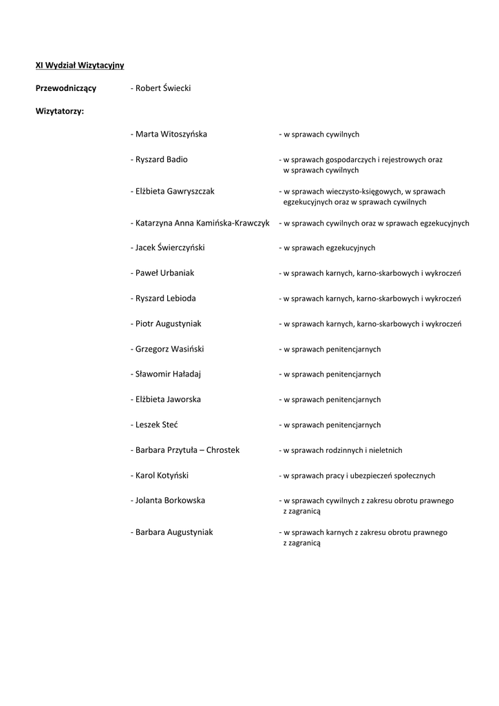 XI Wydział Wizytacyjny Przewodniczący - Robert Świecki Wizytatorzy: - Marta Witoszyńska - w sprawach cywilnych - Ryszard Badio - w sprawach gospodarczych i rejestrowych oraz - w sprawach cywilnych - Elżbieta Gawryszczak - w sprawach wieczysto-księgowych, w sprawach - egzekucyjnych oraz w sprawach cywilnych - Katarzyna Anna Kamińska-Krawczyk - w sprawach cywilnych oraz w sprawach egzekucyjnych - Jacek Świerczyński - w sprawach egzekucyjnych - Paweł Urbaniak - w sprawach karnych, karno-skarbowych i wykroczeń0 - Ryszard Lebioda - w sprawach karnych, karno-skarbowych i wykroczeń - Piotr Augustyniak - w sprawach karnych, karno-skarbowych i wykroczeń - Grzegorz Wasiński - w sprawach penitencjarnych - Sławomir Haładaj - w sprawach penitencjarnych - Elżbieta Jaworska - w sprawach penitencjarnych - Leszek Steć - w sprawach penitencjarnych - Barbara Przytuła – Chrostek - w sprawach rodzinnych i nieletnich - Karol Kotyński - w sprawach pracy i ubezpieczeń społecznych - Jolanta Borkowska - w sprawach cywilnych z zakresu obrotu prawnego - z zagranicą - Barbara Augustyniak - w sprawach karnych z zakresu obrotu prawnego - z zagranicą