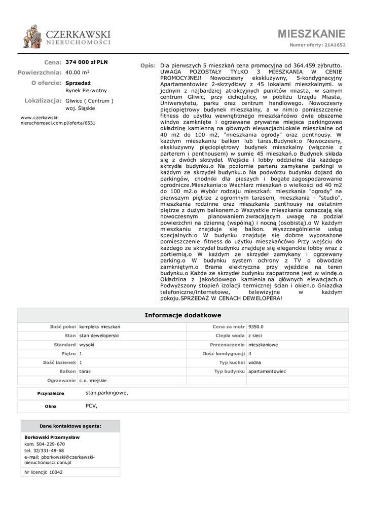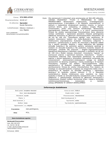 MIESZKANIE Numer oferty: 21A1652 Cena: 374 000 zł PLN Powierzchnia: 40.00 m² O ofercie: Sprzedaż Rynek Pierwotny Lokalizacja: Gliwice ( Centrum ) woj. Śląskie www.czerkawskinieruchomosci.com.pl/oferta/6531 Opis: Dla pierwszych 5 mieszkań cena promocyjna od 364.459 zł/brutto. UWAGA POZOSTAŁY TYLKO 3 MIESZKANIA W CENIE PROMOCYJNEJ! Nowoczesny ekskluzywny, 5-kondygnacyjny Apartamentowiec 2-skrzydłowy z 45 lokalami mieszkalnymi. w jednym z najbardziej atrakcyjnych punktów miasta, w samym centrum Gliwic, przy cichejulicy, w pobliżu Urzędu Miasta, Uniwersytetu, parku oraz centrum handlowego. Nowoczesny pięciopiętrowy budynek mieszkalny, a w nim:o pomieszczenie fitness do użytku wewnętrznego mieszkańcówo dwie obszerne windyo zamknięte i ogrzewane prywatne miejsca parkingoweo okładzinę kamienną na głównych elewacjachLokale mieszkalne od 40 m2 do 100 m2, "mieszkania ogrody" oraz penthousy. W każdym mieszkaniu balkon lub taras.Budynek:o Nowoczesny, ekskluzywny pięciopiętrowy budynek mieszkalny (włącznie z parterem i penthousem) w sumie 45 mieszkań.o Budynek składa się z dwóch skrzydeł. Wejście i lobby oddzielne dla każdego skrzydła budynku.o Na poziomie parteru zamykane parkingi w każdym ze skrzydeł budynku.o Na podwórzu budynku dojazd do parkingów, chodniki dla pieszych i bogate zagospodarowanie ogrodnicze.Mieszkania:o Wachlarz mieszkań o wielkości od 40 m2 do 100 m2.o Wybór rodzaju mieszkań: mieszkania "ogrody" na pierwszym piętrze z ogromnym tarasem, mieszkania - "studio", mieszkania rodzinne oraz mieszkania penthousy na ostatnim piętrze z dużym balkonem.o Wszystkie mieszkania oznaczają się nowoczesnym planowaniem zwracającym uwagę na podział powierzchni na dzienną (wspólną) i nocną (osobistą).o W każdym mieszkaniu znajduje się balkon. Wyszczególnienie usług specjalnych:o W budynku znajduje się dobrze wyposażone pomieszczenie fitness do użytku mieszkańcówo Przy wejściu do każdego ze skrzydeł budynku znajduje się eleganckie lobby wraz z portiernią.o W każdym ze skrzydeł zamykany i ogrzewany parking.o W budynku system ochrony z TV o obwodzie zamkniętym.o Brama elektryczna przy wjeździe na teren budynku.o Każde ze skrzydeł budynku zaopatrzone jest w windę.o Okładzina z jakościowego kamienia na głównych elewacjach.o Podwyższony stopień izolacji termicznej ścian i okien.o Gniazdka telefoniczne/internetowe, telewizyjne w każdym pokoju.SPRZEDAŻ W CENACH DEWELOPERA! Informacje dodatkowe Ilość pokoi kompleks mieszkań Stan stan deweloperski Standard wysoki Piętro 1 Ogrzewanie c.o. miejskie stan.parkingowe, PCV, Dane kontaktowe agenta: Borkowski Przemysław kom. 504-229-670 tel. 32/331-48-68 e-mail: [email protected] Nr licencji: 10042 Przeznaczenie mieszkaniowe Typ kuchni widna Balkon taras Okna Ciepła woda z sieci Ilość kondygnacji 4 Ilość łazienek 1 Przynależne Cena za metr 9350.0 Typ budynku apartamentowiec www.czerkawski-nieruchomosci.com.pl