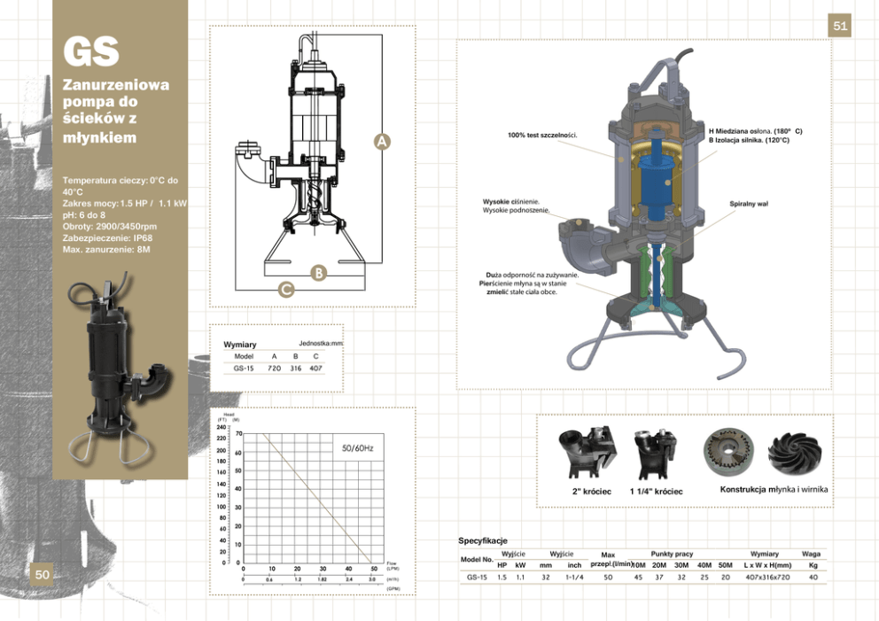 51 GS Zanurzeniowa pompa do ścieków z młynkiem A Temperatura cieczy: 0°C do 40°C Zakres mocy: 1.5 HP / 1.1 kW pH: 6 do 8 Obroty: 2900/3450rpm Zabezpieczenie: IP68 Max. zanurzenie: 8M H Miedziana osłona. (180º C) B Izolacja silnika. (120°C) 100% test szczelności. Wysokie ciśnienie. Wysokie podnoszenie. B C Wymiary Model GS-15 240 220 200 A 720 B Spiralny wał Duża odporność na zużywanie. Pierścienie młyna są w stanie zmielić stałe ciała . obce. Jednostka:mm 316 C 407 70 60 180 160 140 120 100 50 2" króciec 40 Konstrukcja młynka i wirnika 1 1/4" króciec 30 80 60 40 20 0 50 20 Specyfikacje 10 0 0 0 10 0.6 20 30 40 1.2 1.82 2.4 50 3.0 Model No. GS-15 Wyjście HP kW 1.5 1.1 Wyjście mm inch 32 1-1/4 Punkty pracy Max przepł.(l/min)10M 20M 30M 40M 50M 50 45 37 32 25 20 Wymiary L x W x H(mm) 407x316x720 Waga Kg 40