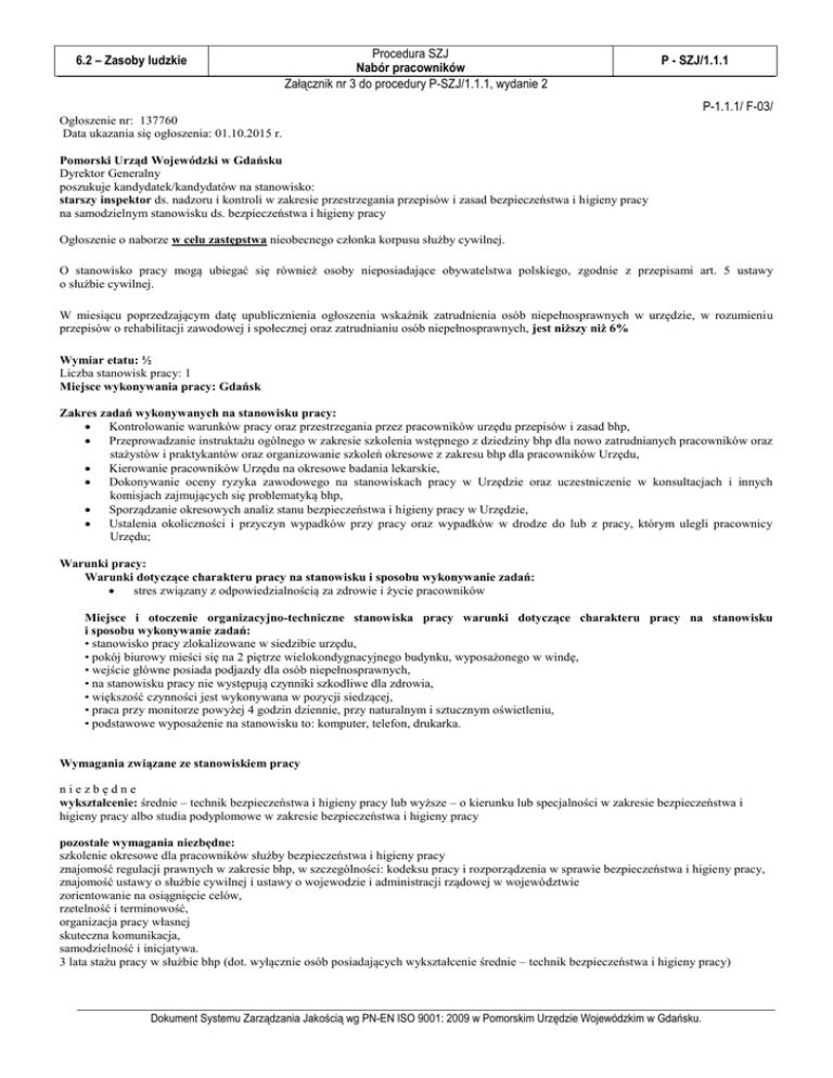 6.2 – Zasoby ludzkie Procedura SZJ Nabór pracowników Załącznik nr 3 do procedury P-SZJ/1.1.1, wydanie 2 P - SZJ/1.1.1 P-1.1.1/ F-03/ Ogłoszenie nr: 137760 Data ukazania się ogłoszenia: 01.10.2015 r. Pomorski Urząd Wojewódzki w Gdańsku Dyrektor Generalny poszukuje kandydatek/kandydatów na stanowisko: starszy inspektor ds. nadzoru i kontroli w zakresie przestrzegania przepisów i zasad bezpieczeństwa i higieny pracy na samodzielnym stanowisku ds. bezpieczeństwa i higieny pracy Ogłoszenie o naborze w celu zastępstwa nieobecnego członka korpusu służby cywilnej. O stanowisko pracy mogą ubiegać się również osoby nieposiadające obywatelstwa polskiego, zgodnie z przepisami art. 5 ustawy o służbie cywilnej. W miesiącu poprzedzającym datę upublicznienia ogłoszenia wskaźnik zatrudnienia osób niepełnosprawnych w urzędzie, w rozumieniu przepisów o rehabilitacji zawodowej i społecznej oraz zatrudnianiu osób niepełnosprawnych, jest niższy niż 6% Wymiar etatu: ½ Liczba stanowisk pracy: 1 Miejsce wykonywania pracy: Gdańsk Zakres zadań wykonywanych na stanowisku pracy: Kontrolowanie warunków pracy oraz przestrzegania przez pracowników urzędu przepisów i zasad bhp, Przeprowadzanie instruktażu ogólnego w zakresie szkolenia wstępnego z dziedziny bhp dla nowo zatrudnianych pracowników oraz stażystów i praktykantów oraz organizowanie szkoleń okresowe z zakresu bhp dla pracowników Urzędu, Kierowanie pracowników Urzędu na okresowe badania lekarskie, Dokonywanie oceny ryzyka zawodowego na stanowiskach pracy w Urzędzie oraz uczestniczenie w konsultacjach i innych komisjach zajmujących się problematyką bhp, Sporządzanie okresowych analiz stanu bezpieczeństwa i higieny pracy w Urzędzie, Ustalenia okoliczności i przyczyn wypadków przy pracy oraz wypadków w drodze do lub z pracy, którym ulegli pracownicy Urzędu; Warunki pracy: Warunki dotyczące charakteru pracy na stanowisku i sposobu wykonywanie zadań: stres związany z odpowiedzialnością za zdrowie i życie pracowników Miejsce i otoczenie organizacyjno-techniczne stanowiska pracy warunki dotyczące charakteru pracy na stanowisku i sposobu wykonywanie zadań: • stanowisko pracy zlokalizowane w siedzibie urzędu, • pokój biurowy mieści się na 2 piętrze wielokondygnacyjnego budynku, wyposażonego w windę, • wejście główne posiada podjazdy dla osób niepełnosprawnych, • na stanowisku pracy nie występują czynniki szkodliwe dla zdrowia, • większość czynności jest wykonywana w pozycji siedzącej, • praca przy monitorze powyżej 4 godzin dziennie, przy naturalnym i sztucznym oświetleniu, • podstawowe wyposażenie na stanowisku to: komputer, telefon, drukarka. Wymagania związane ze stanowiskiem pracy niezbędne wykształcenie: średnie – technik bezpieczeństwa i higieny pracy lub wyższe – o kierunku lub specjalności w zakresie bezpieczeństwa i higieny pracy albo studia podyplomowe w zakresie bezpieczeństwa i higieny pracy pozostałe wymagania niezbędne: szkolenie okresowe dla pracowników służby bezpieczeństwa i higieny pracy znajomość regulacji prawnych w zakresie bhp, w szczególności: kodeksu pracy i rozporządzenia w sprawie bezpieczeństwa i higieny pracy, znajomość ustawy o służbie cywilnej i ustawy o wojewodzie i administracji rządowej w województwie zorientowanie na osiągnięcie celów, rzetelność i terminowość, organizacja pracy własnej skuteczna komunikacja, samodzielność i inicjatywa. 3 lata stażu pracy w służbie bhp (dot. wyłącznie osób posiadających wykształcenie średnie – technik bezpieczeństwa i higieny pracy) Dokument Systemu Zarządzania Jakością wg PN-EN ISO 9001: 2009 w Pomorskim Urzędzie Wojewódzkim w Gdańsku. 6.2 – Zasoby ludzkie Procedura SZJ Nabór pracowników Załącznik nr 3 do procedury P-SZJ/1.1.1, wydanie 2 P - SZJ/1.1.1 P-1.1.1/ F-03/ Wymagane dokumenty i oświadczenia: życiorys i list motywacyjny, kopia dokumentu potwierdzającego posiadane obywatelstwo lub oświadczenie o posiadanym obywatelstwie oświadczenie kandydatki/kandydata o wyrażeniu zgody na przetwarzanie danych osobowych do celów rekrutacji, oświadczenie kandydatki/kandydata o nieskazaniu prawomocnym wyrokiem za umyślne przestępstwo lub umyślne przestępstwo skarbowe, oświadczenie kandydatki/kandydata o korzystaniu z pełni praw publicznych, kopie dokumentów potwierdzających wykształcenie, kopie dokumentów potwierdzających wymagany staż pracy, kopie dokumentów potwierdzających posiadanie szkolenia okresowego dla pracowników służby bezpieczeństwa i higieny pracy, w przypadku osób nieposiadających obywatelstwa polskiego - kopia dokumentu potwierdzającego znajomość języka polskiego zgodnie z rozporządzeniem Prezesa Rady Ministrów w sprawie określenia rodzajów dokumentów potwierdzających znajomość języka polskiego przez osoby nieposiadające obywatelstwa polskiego, ubiegające się o zatrudnienie w służbie cywilnej, kopia dokumentu potwierdzającego niepełnosprawność - w przypadku, gdy kandydatka/kandydat zamierza skorzystać z uprawnienia, o którym mowa w art. 29a ust. 2 ustawy z dnia 21 listopada 2008 r. o służbie cywilnej (Dz. U. Nr 227, poz. 1505 ze zm.). Termin składania dokumentów: 08 – 10 - 2015 r. Miejsce składania dokumentów: Pomorski Urząd Wojewódzki w Gdańsku Punkt przyjęć korespondencji w holu budynku Urzędu przy wejściu „B” ul. Okopowa 21/27 80-810 Gdańsk Na kopercie i liście motywacyjnym należy umieścić dopisek: 48/15 Inne informacje: W ciągu 3 tygodni od terminu składania ofert na stronie BIP Urzędu (http://uwgdansk.ssdip.bip.gov.pl/) w zakładce Praca w PUW/Terminy testów i rozmów zostanie opublikowana informacja zawierająca listę osób zakwalifikowanych do kolejnego etapu procesu naboru wraz ze szczegółami dotyczącymi miejsca i daty przeprowadzenia tego etapu. W ofercie należy podać swoje dane kontaktowe: adres do korespondencji, adres e-m