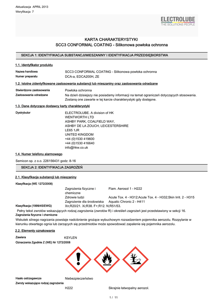 Aktualizacja APRIL 2013 Weryfikacja 7 KARTA CHARAKTERYSTYKI SCC3 CONFORMAL COATING - Silikonowa powłoka ochronna SEKCJA 1: IDENTYFIKACJA SUBSTANCJI/MIESZANINY I IDENTYFIKACJA PRZEDSIĘBIORSTWA 1.1. Identyfikator produktu Nazwa handlowa Numer preparatu SCC3 CONFORMAL COATING - Silikonowa powłoka ochronna DCA-a, EDCA200H, ZE 1.2. Istotne zidentyfikowane zastosowania substancji lub mieszaniny oraz zastosowania odradzane Stwierdzone zastosowania Zastosowania odradzane Powłoka ochronna Na dzień dzisiejszy nie posiadamy informacji na temat ograniczeń dotyczących stosowania. Zostaną one zawarte w tej karcie charakterystyki gdy dostępne. 1.3. Dane dotyczące dostawcy karty charakterystyki Dystrybutor ELECTROLUBE. A division of HK WENTWORTH LTD ASHBY PARK, COALFIELD WAY, ASHBY DE LA ZOUCH, LEICESTERSHIRE LE65 1JR UNITED KINGDOM +44 (0)1530 419600 +44 (0)1530 416640 [email protected] 1.4. Numer telefonu alarmowego Semicon sp. z o.o. 226156431 godz: 8-16 SEKCJA 2: IDENTYFIKACJA ZAGROŻEŃ 2.1. Klasyfikacja substancji lub mieszaniny Klasyfikacja (WE 1272/2008) Zagrożenia fizyczne i Flam. Aerosol 1 - H222 chemiczne Zdrowie ludzi Acute Tox. 4 - H312;Acute Tox. 4 - H332;Skin Irrit. 2 - H315 Zagrożenie dla środowiska Aquatic Chronic 2 - H411 Klasyfikacja (1999/45/EWG) Xn;R20/21. Xi;R38. F+;R12. N;R51/53. Pełny tekst zwrotów wskazujących rodzaj zagrożenia (zwrotów R) i określeń zagrożeń jest przedstawiony w sekcji 16. Zagrożenia fizyczne i chemiczne Wskutek silnego nagrzania powstaje nadciśnienie grożące wybuchowym rozsadzeniem pojemnika aerozolu. Rozpylanie w kierunku otwartego ognia lub żarzących się przedmiotów może spowodować zapalenie się pojemnika aerozolu. 2.2. Elementy oznakowania Zawiera KSYLEN Oznaczenia Zgodnie Z (WE) Nr 1272/2008 Hasło ostrzegawcze Niebezpieczeństwo Zwroty wskazujące rodzaj zagrożenia H222 Skrajnie łatwopalny aerozol. 1 / 11 SCC3 CONFORMAL COATING - Silikonowa powłoka ochronna H312 H315 H332 H411 Działa szkodliwie w przypadku kontaktu ze skórą. Działa drażniąco na skórę. Działa szkodliwie w następstwie wdychania. Działa toksycznie na organizmy wodne, powodując długotrwałe skutki. P102 P210 Przechowywać w miejscu niedostępnym dla dzieci. Przechowywać z dala od źródeł ciepła/iskrzenia/otwar tego ognia/gorących powierzchni. Palenie wzbronione. Stosować rękawice ochronne, ochronę oczu i twarzy. Zwroty wskazujące środki ostrożności P280 Dodatkowe zwroty wskazujące środki ostrożności P211 P251 P261 P410+412 Nie rozpylać nad otwartym ogniem lub innym źródłem zapłonu. Pojemnik pod ciśnieniem. Nie przekłuwać ani nie spalać, nawet po zużyciu. Unikać wdychania par/rozpylonej cieczy. Chronić przed światłem słonecznym. Nie wystawiać na działanie temperatury przekraczającej 50 °C/122 °F. 2.3. Inne zagrożenia Nieklasyfikowany jako PBT / vPvB na podstawie obecnych kryteriów UE. SEKCJA 3: SKŁAD/INFORMACJA O SKŁADNIKACH 3.2. Mieszaniny ETER DIMETYLOWY Numer CAS: 115-10-6 30-60% Numer WE: 204-065-8 Klasyfikacja (WE 1272/2008) Flam. Gas 1 - H220 Klasyfikacja (67/548/EWG) F+;R12 KSYLEN Numer CAS: 1330-20-7 10-30% Numer WE: 215-535-7 Klasyfikacja (WE 1272/2008) Flam. Liq. 3 - H226 Acute Tox. 4 - H312 Acute Tox. 4 - H332 Skin Irrit. 2 - H315 Klasyfikacja (67/548/EWG) R10 Xn;R20/21 Xi;R38 CYKLOHEKSAN Numer CAS: 110-82-7 Klasyfikacja (WE 1272/2008) Flam. Liq. 2 - H225 Skin Irrit. 2 - H315 STOT Single 3 - H336 Asp. Tox. 1 - H304 Aquatic Acute 1 - H400 Aquatic Chronic 1 - H410 10-30% Numer WE: 203-806-2 Klasyfikacja (67/548/EWG) F;R11 Xn;R65 Xi;R38 R67 N;R50/53 2 / 11 SCC3 CONFORMAL COATING - Silikonowa powłoka ochronna 1-METOKSYPROPAN-2-OL Numer CAS: 107-98-2 5-10% Numer WE: 203-539-1 Klasyfikacja (WE 1272/2008) Flam. Liq. 3 - H226 STOT Single 3 - H336 Klasyfikacja (67/548/EWG) R10 R67 ETYLOBENZEN Numer CAS: 100-41-4 1-5% Numer WE: 202-849-4 Klasyfikacja (WE 1272/2008) Flam. Liq. 2 - H225 Acute Tox. 4 - H332 Klasyfikacja (67/548/EWG) F;R11 Xn;R20 HEXANE MIXTURE OF ISOMERS (MAX 5% N-HEXANE (203-777-6)) Numer CAS: - Numer WE: - Klasyfikacja (WE 1272/2008) Flam. Liq. 2 - H225 Skin Irrit. 2 - H315 STOT Single 3 - H336 Asp. Tox. 1 - H304 Aquatic Chronic 2 - H411 Klasyfikacja (67/548/EWG) F;R11 Xn;R65 Xi;R38 R67 N;R51/53 HEPTAN I JEGO IZOMERY Numer CAS: 142-82-5 1-5% Numer WE: 205-563-8 Klasyfikacja (WE 1272/2008) Flam. Liq. 2 - H225 Skin Irrit. 2 - H315 STOT Single 3 - H336 Asp. Tox. 1 - H304 Aquatic Acute 1 - H400 Aquatic Chronic 1 - H410 Klasyfikacja (67/548/EWG) F;R11 Xn;R65 Xi;R38 R67 N;R50/53 HEKSAN (IZOMER O PROSTYM ŁAŃCUCHU WĘGLOWYM TZW. N-HEKSAN) Numer CAS: 110-54-3 Klasyfikacja (WE 1272/2008) Flam. Liq. 2 - H225 Skin Irrit. 2 - H315 Repr. 2 - H361f STOT Single 3 - H336 STOT Rep. 2 - H373 Asp. Tox. 1 - H304 Aquatic Chronic 2 - H411 1-5% Numer WE: 203-777-6 Klasyfikacja (67/548/EWG) F;R11 Repr. Cat. 3;R62 Xn;R48/20,R65 Xi;R38 R67 N;R51/53 3 / 11 <0.5% SCC3 CONFORMAL COATING - Silikonowa powłoka ochronna POCHODNE C10-13-ALKILOWE BENZENU Numer CAS: 67774-74-7 <0.5% Numer WE: 267-051-0 Klasyfikacja (WE 1272/2008) Nie sklasyfikowane. Klasyfikacja (67/548/EWG) N;R50. Pełny tekst zwrotów wskazujących rodzaj zagrożenia (zwrotów R) i określeń zagrożeń jest przedstawiony w sekcji 16. Uwagi względem składu Składniki nie wymienione są zakwalifikowe jako sybstancje nieszkodliwe lub w stężeniu poniżej dopuszczalnego poziomu. SEKCJA 4: ŚRODKI PIERWSZEJ POMOCY 4.1. Opis środków pierwszej pomocy Wdychanie Niezwłocznie wynieść/wyprowadzić osobę narażoną na wdychanie na świeże powietrze. Zapewnić poszkodowanej osobie ciepło i odpoczynek. Zapewnić niezwłoczną opiekę lekarską. Spożycie Dokładnie wypłukać usta. Zapewnić odpoczynek, ciepło i świeże powietrze. Kontakt ze skórą Natychmiast umyć skórę wodą z mydłem. W przypadku utrzymującego się dyskomfortu skontaktować się z lekarzem. Kontakt z oczami Przed płukaniem upewnić się, że ewentualne soczewki kontaktowe zosta