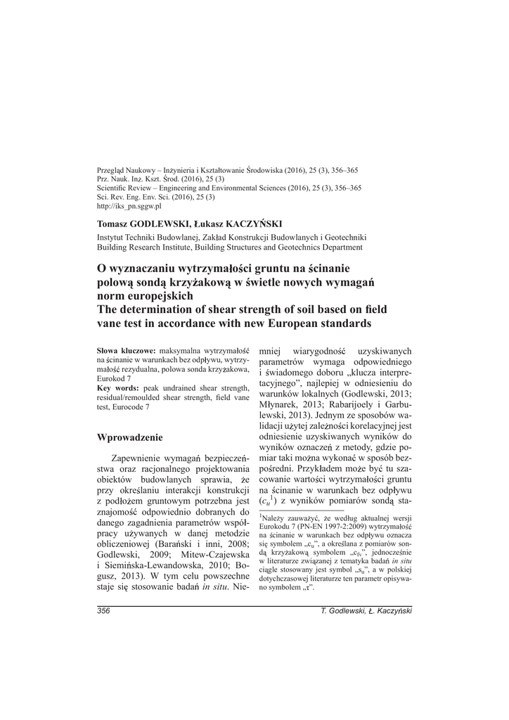 Przegl d Naukowy In ynieria i Kszta towanie rodowiska (2016), 25 (3), 356365 Prz. Nauk. In . Kszt. rod. (2016), 25 (3) Scientic Review Engineering and Environmental Sciences (2016), 25 (3), 356365 Sci. Rev. Eng. Env. Sci. (2016), 25 (3) http://iks_pn.sggw.pl Tomasz GODLEWSKI, ukasz KACZY SKI Instytut Techniki Budowlanej, Zak ad Konstrukcji Budowlanych i Geotechniki Building Research Institute, Building Structures and Geotechnics Department O wyznaczaniu wytrzyma o ci gruntu na cinanie polow sond krzy akow w wietle nowych wymaga norm europejskich The determination of shear strength of soil based on eld vane test in accordance with new European standards S owa kluczowe: maksymalna wytrzyma o na cinanie w warunkach bez odp ywu, wytrzyma o rezydualna, polowa sonda krzy akowa, Eurokod 7 Key words: peak undrained shear strength, residual/remoulded shear strength, eld vane test, Eurocode 7 Wprowadzenie Zapewnienie wymaga bezpiecze stwa oraz racjonalnego projektowania obiektów budowlanych sprawia, e przy okre laniu interakcji konstrukcji z pod o em gruntowym potrzebna jest znajomo odpowiednio dobranych do danego zagadnienia parametrów wspó pracy u ywanych w danej metodzie obliczeniowej (Bara ski i inni, 2008; Godlewski, 2009; Mitew-Czajewska i Siemi ska-Lewandowska, 2010; Bogusz, 2013). W tym celu powszechne staje si stosowanie bada in situ. Nie- 356 mniej wiarygodno uzyskiwanych parametrów wymaga odpowiedniego i wiadomego doboru klucza interpretacyjnego, najlepiej w odniesieniu do warunków lokalnych (Godlewski, 2013; M ynarek, 2013; Rabarijoely i Garbulewski, 2013). Jednym ze sposobów walidacji u ytej zale no ci korelacyjnej jest odniesienie uzyskiwanych wyników do wyników oznacze z metody, gdzie pomiar taki mo na wykona w sposób bezpo redni. Przyk adem mo e by tu szacowanie warto ci wytrzyma o ci gruntu na cinanie w warunkach bez odp ywu (cu1) z wyników pomiarów sond sta1 Nale y zauwa y , e wed ug aktualnej wersji Eurokodu 7 (PN-EN 1997-2:2009) wytrzyma o na cinanie w warunkach bez odp ywu oznacza si symbolem cu, a okre lana z pomiarów sond krzy akow symbolem cfv, jednocze nie w literaturze zwi zanej z tematyka bada in situ ci gle stosowany jest symbol su, a w polskiej dotychczasowej literaturze ten parametr opisywano symbolem . T. Godlewski, . Kaczy ski tyczn CPTU. Istnieje wiele publikacji gdzie, z uwagi na rozpatrywany problem geotechniczny (np. no no i stateczno nasypów drogowych), takie porównania s wykonywane (np. M ynarek i inni, 2012). Porównanie z wynikami z bada sond krzy akow (FVT) pozwala na doprecyzowanie stosowanego wspó czynnika korelacyjnego (Nkt) do interpretacji poszukiwanego parametru z pomiarów sond CPTU (Stefaniak, 2015). Istnieje jednak problem zwi zany z sam metodyk wykonywania pomiarów sond krzy akow oraz bezsprzeczny wp yw pr dko ci prowadzenia badania na uzyskiwane wyniki. W tym kontek cie nowe wymagania podane w propozycji normy EN ISO (prEN ISO 22476-9) stoj niekiedy w sprzeczno ci z dotychczas stosowanymi procedurami krajowymi (PN-B-04452:2002) i praktyk . Metodyka badania FVT W a ciwe oznaczenie parametrów wytrzyma o ciowych próbki gruntu w du ej mierze zale y od w a ciwego pobrania, zabezpieczenia i przetransportowania materia u do bada do laboratorium. Pomimo szerokiego wachlarza dost pnych próbników oraz urz dze wiertniczych, niektóre rodzaje gruntów naturalnych i antropogenicznych zaliczanych do gruntów s abono nych s niezwykle trudne do pobrania, b d jako pobranych próbek nie odpowiada oczekiwanej klasie. Jest to jeden z przypadków, w których najlepszym rozwi zaniem s badania in situ. Jednym z najpopularniejszych bada terenowych gruntów s abych jest sondowanie FVT (Field Vane Test). Procedura badania sond krzy akow na wiecie jest podobna. Na przyk ad normy ameryka ska (ASTM D2573), brytyjska (BS 1377:9), czy niemiecka (DIN 4096), w tym take dotychczasowa polska norma PN-B-04452:2002, podawa y praktycznie identyczne lub bardzo zbli one wymagania co do procedury przeprowadzania badania. Schemat uniwersalnej ogólnej procedury badawczej podano na rysunku 1. Ko cówk sondy nale y zag bi w gruncie mo liwie p ynnie, z pr dkoci nie wi ksz ni 20 mm/s, je eli jest to mo liwe bez uderze i wibracji. Norma dotychczasowa PN-B-04452:2002 przewiduje dwa standardowe rozmiary prostok tnych ko cówek: 100 × 200 mm dla gruntów s abych (mi kkoplastycznych i plastycznych) oraz 40 × 80 mm dla gruntów mocniejszych (twardoplastycznych). Pomiar polega na obracaniu erdzi zako czonych krzy akiem, o odpowiednim dla danych gruntów rozmiarze, ze sta pr dko ci obrotow cinania w zakresie 612°/min. W przypadku s abych gruntów spoistych o maej wra liwo ci pr dko obrotu mo e wynosi 30°/min. W przypadku wykonywania badania bez rur os onowych nale y zmierzy , jaka cz pomierzonego momentu obrotowego wynika z tarcia na erdziach. Po osi gni ciu maksymalnej warto ci momentu obrotowego dokonuje si 10 szybkich (PN-B-04452:2002), pe nych obrotów przewodu badawczego, a nast pnie w opisany wcze niej sposób mierzy si warto rezydualn . Warto wytrzyma o ci na cinanie (cfv obliczana jest po odniesieniu momentu obrotowego do wymiarów u ytego w trakcie badania krzy aka. Badanie sond krzyakow oprócz mo liwo ci oznaczenia maksymalnej i rezydualnej wytrzyma o- O wyznaczaniu wytrzyma o ci gruntu na cinanie polow sond krzy akow ... 357 RYSUNEK 1. Schematyczna uniwersalna procedura badania FVT FIGURE 1. Schematic universal FVT test procedure ci na cinanie w warunkach bez odp ywu pozwala równie na ocen wra liwo ci gruntu oraz oszacowania wspó czynnika prekonsolidacji (Lechowicz i Szyma ski, 2002). W przytoczonej publikacji, jak te w za czniku informacyjnym do Eurokodu 7 (PN-EN 1997-2:2009, za . I), podano równie wspó czynniki poprawkowe2 stosowane w badaniach sond FVT. Podane wspó czynniki s uzale nione od wska nika plastyczno ci (Ip) czy te granicy p ynno ci (wL) badanego gruntu, lub mog by ustalone bezpo rednio dla warunków lokalnych (Wolski, 1988; Lechowicz i Szyma sk