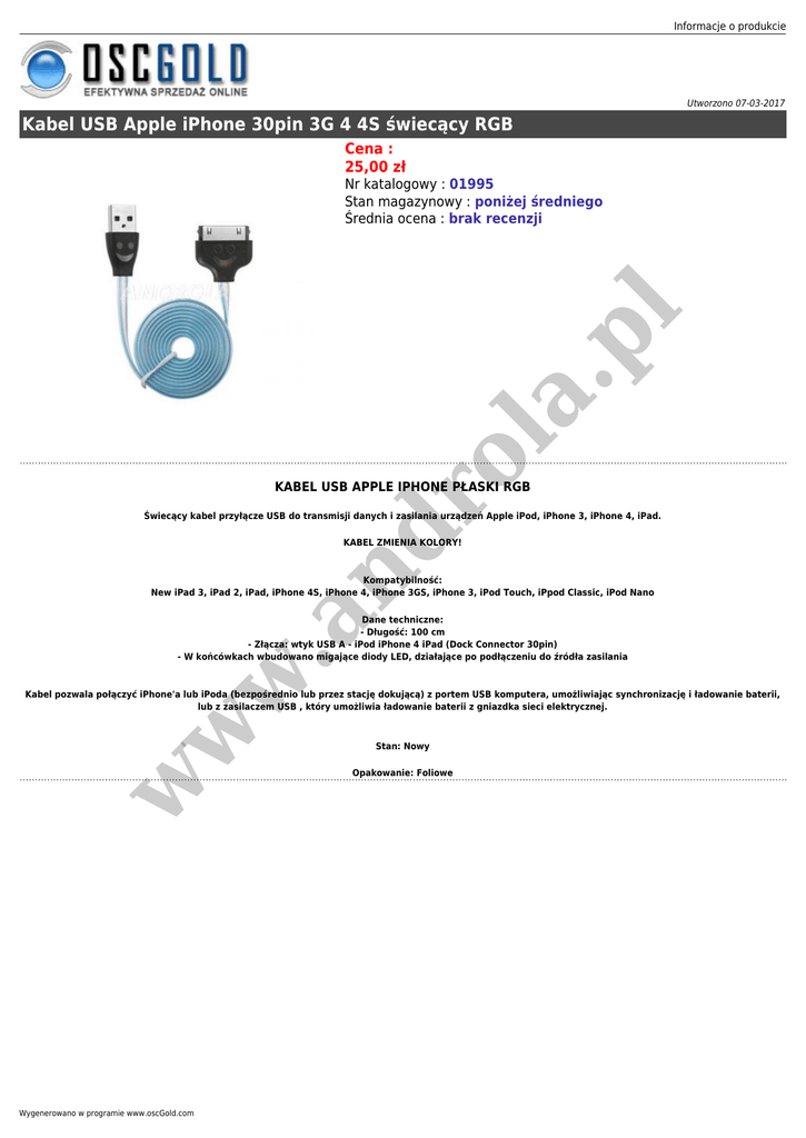 Informacje o produkcie Utworzono 07-03-2017 Kabel USB Apple iPhone 30pin 3G 4 4S świecący RGB Cena : 25,00 zł ro la .p l Nr katalogowy : 01995 Stan magazynowy : poniżej średniego Średnia ocena : brak recenzji KABEL USB APPLE IPHONE PŁASKI RGB nd Świecący kabel przyłącze USB do transmisji danych i zasilania urządzeń Apple iPod, iPhone 3, iPhone 4, iPad. KABEL ZMIENIA KOLORY! Kompatybilność: New iPad 3, iPad 2, iPad, iPhone 4S, iPhone 4, iPhone 3GS, iPhone 3, iPod Touch, iPpod Classic, iPod Nano w .a Dane techniczne: - Długość: 100 cm - Złącza: wtyk USB A - iPod iPhone 4 iPad (Dock Connector 30pin) - W końcówkach wbudowano migające diody LED, działające po podłączeniu do źródła zasilania w w Kabel pozwala połączyć iPhone'a lub iPoda (bezpośrednio lub przez stację dokującą) z portem USB komputera, umożliwiając synchronizację i ładowanie baterii, lub z zasilaczem USB , który umożliwia ładowanie baterii z gniazdka sieci elektrycznej. Wygenerowano w programie www.oscGold.com Stan: Nowy Opakowanie: Foliowe