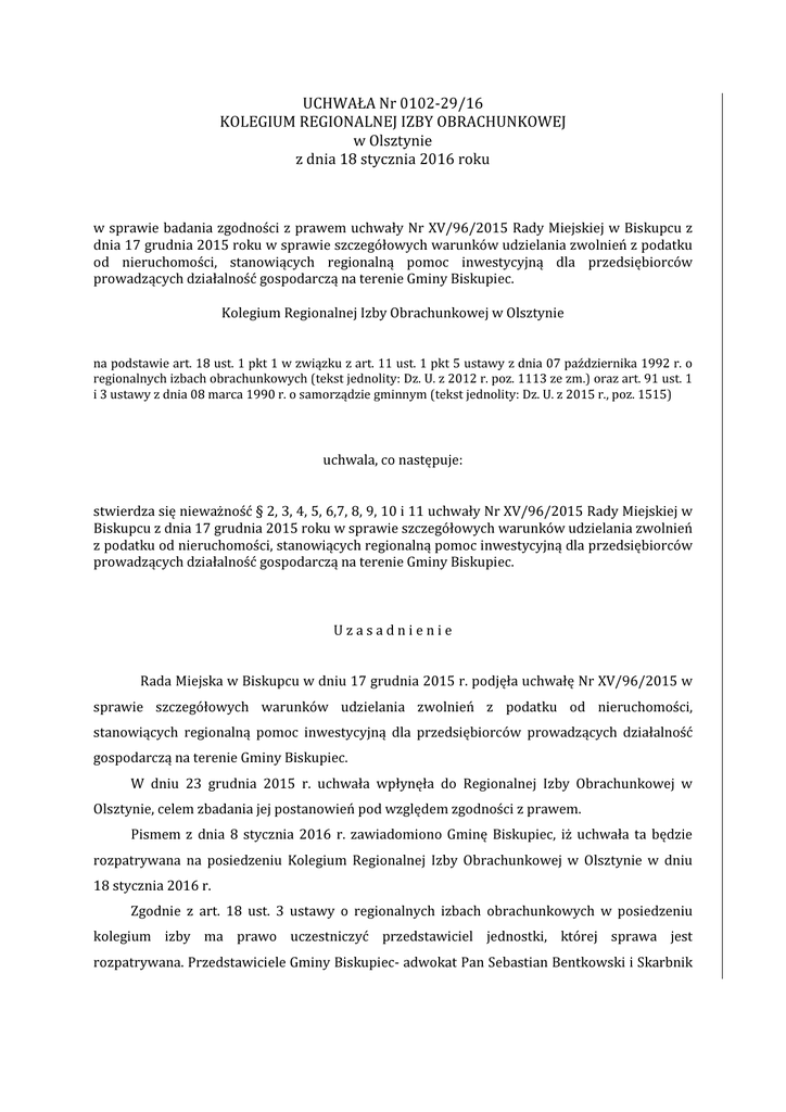 UCHWAŁA Nr 0102-29/16 KOLEGIUM REGIONALNEJ IZBY OBRACHUNKOWEJ w Olsztynie z dnia 18 stycznia 2016 roku w sprawie badania zgodności z prawem uchwały Nr XV/96/2015 Rady Miejskiej w Biskupcu z dnia 17 grudnia 2015 roku w sprawie szczegółowych warunków udzielania zwolnień z podatku od nieruchomości, stanowiących regionalną pomoc inwestycyjną dla przedsiębiorców prowadzących działalność gospodarczą na terenie Gminy Biskupiec. Kolegium Regionalnej Izby Obrachunkowej w Olsztynie na podstawie art. 18 ust. 1 pkt 1 w związku z art. 11 ust. 1 pkt 5 ustawy z dnia 07 października 1992 r. o regionalnych izbach obrachunkowych (tekst jednolity: Dz. U. z 2012 r. poz. 1113 ze zm.) oraz art. 91 ust. 1 i 3 ustawy z dnia 08 marca 1990 r. o samorządzie gminnym (tekst jednolity: Dz. U. z 2015 r., poz. 1515) uchwala, co następuje: stwierdza się nieważność § 2, 3, 4, 5, 6,7, 8, 9, 10 i 11 uchwały Nr XV/96/2015 Rady Miejskiej w Biskupcu z dnia 17 grudnia 2015 roku w sprawie szczegółowych warunków udzielania zwolnień z podatku od nieruchomości, stanowiących regionalną pomoc inwestycyjną dla przedsiębiorców prowadzących działalność gospodarczą na terenie Gminy Biskupiec. Uzasadnienie Rada Miejska w Biskupcu w dniu 17 grudnia 2015 r. podjęła uchwałę Nr XV/96/2015 w sprawie szczegółowych warunków udzielania zwolnień z podatku od nieruchomości, stanowiących regionalną pomoc inwestycyjną dla przedsiębiorców prowadzących działalność gospodarczą na terenie Gminy Biskupiec. W dniu 23 grudnia 2015 r. uchwała wpłynęła do Regionalnej Izby Obrachunkowej w Olsztynie, celem zbadania jej postanowień pod względem zgodności z prawem. Pismem z dnia 8 stycznia 2016 r. zawiadomiono Gminę Biskupiec, iż uchwała ta będzie rozpatrywana na posiedzeniu Kolegium Regionalnej Izby Obrachunkowej w Olsztynie w dniu 18 stycznia 2016 r. Zgodnie z art. 18 ust. 3 ustawy o regionalnych izbach obrachunkowych w posiedzeniu kolegium izby ma prawo uczestniczyć przedstawiciel jednostki, której sprawa jest rozpatrywana. Przedstawiciele Gminy Biskupiec- adwokat Pan Sebastian Bentkowski i Skarbnik 2 Gminy – Pani Elżbieta Kaczmarczyk wzięli udział w posiedzeniu Kolegium Regionalnej Izby Obrachunkowej w Olsztynie (dalej; Kolegium Izby). Stosownie do art. 18 ust. 1 pkt 1 ustawy o regionalnych izbach obrachunkowych, orzekanie o nieważności uchwał i zarządzeń, w sprawach wymienionych w art. 11 ust. 1 w/w ustawy, zastrzeżono dla kolegium regionalnej izby obrachunkowej. Przepis art. 11 ust. 1 pkt 5 ustawy o regionalnych izbach obrachunkowych stanowi, że właściwość rzeczowa regionalnych izb obrachunkowych obejmuje uchwały i zarządzenia podejmowane przez organy jednostek samorządu terytorialnego w sprawach podatków i opłat lokalnych, do których mają zastosowanie przepisy ustawy Ordynacja podatkowa. Kolegium Izby badając przedmiotową uchwałę stwierdziło, co następuje: Zgodnie z art. 7 ust. 3 ustawy z dnia 12 stycznia 1991 r. o podatkach i opłatach lokalnych (tekst jednolity Dz.U. z 2014 r. poz. 849 ze zm.) rada gminy, w drodze uchwały, może wprowadzić inne zwolnienia przedmiotowe niż określone w ust. 1 tego przepisu oraz w art. 10 ust. 1 ustawy z dnia 2 października 2003 r. o zmianie ustawy o specjalnych strefach ekonomicznych i niektórych ustaw (Dz. U. Nr 188, poz. 1840 ze zm.) . Stosownie do art. 20b ust. 1 ustawy o podatkach i opłatach lokalnych, w przypadkach, o których mowa m. in. w art. 7 ust. 3, jeżeli uchwała rady gminy przewiduje udzielenie pomocy publicznej, to powinna być podjęta z uwzględnieniem przepisów dotyczących pomocy publicznej. Art. 20d ustawy o podatkach i opłatach lokalnych stanowi, iż Rada Ministrów określi, w drodze rozporządzenia, warunki udzielania zwolnień stanowiących pomoc publiczną, o których mowa w art. 7 ust. 3 i art. 12 ust. 4, mając na uwadze zapewnienie zgodności udzielania pomocy z warunkami dopuszczalności tej pomocy określonymi w przepisach Unii Europejskiej. Zasady udzielania pomocy publicznej, w tym pomocy dla przedsiębiorców uregulowane zostały między innymi w ustawie z dnia 30 kwietnia 2004 roku o postępowaniu w sprawach dotyczących pomocy publicznej (tekst jednolity Dz. U. z 2007 r. Nr 59 poz.404 ze zm.), rozporządzeniu Rady Ministrów z dnia 9 stycznia 2015 r. w sprawie warunków udzielania zwolnień z podatku od nieruchomości oraz od środków transportowych, stanowiących regionalną pomoc inwestycyjną, pomoc na kulturę i zachowanie dziedzictwa kulturowego, pomoc na infrastrukturę sportową i wielofunkcyjną infrastrukturę rekreacyjną oraz pomoc na infrastrukturę lokalną ( Dz. U. z 2015 r., poz. 174). Rada Miejska w Biskupcu w § 2, 3 i 5 badanej uchwały ustaliła warunki, jakie przedsiębiorca musi spełnić by uzyskać zwolnienie z podatku od nieruchomości. W § 4 uchwały wprowadzony został obowiązek zawiadamiania Burmistrza Biskupca o rozpoczęciu realizacji inwestycji, o stanie realizacji inwestycji i o poniesionych kosztach. W § 6 i § 7 badanej uchwały Rada Miejska w Biskupcu nałożyła na przedsiębiorców obowiązki związane z rozliczeniem 3 inwestycji. Z kolei w § 8, 9, i 10 uchwały uregulowano sprawy utraty prawa do zwolnienia w podatku od nieruchomości. W § 11 uchwały Rada Miejska w Biskupcu wprowadziła zapisy dotyczące kontroli przez organ podatkowy przestrzegania przez beneficjenta warunków zwolnienia w podatku od nieruchomości. Przedstawiciele Gminy Biskupiec wyjaśnili, iż rozporządzenie Rady Ministrów w sprawie warunków udzielania zwolnień z podatku od nieruchomości oraz od środków transportowych, stanowiących regionalną pomoc inwestycyjną, pomoc na kulturę i zachowanie dziedzictwa kulturowego, pomoc na infrastrukturę sportową i wielofunkcyjną infrastrukturę rekreacyjną oraz pomoc na infrastrukturę lokalną ma charakter ogólny i określa tylko ramy udzielenia zwolnienia w podatku od nieruchomości. Dlatego też Rada Gminy B