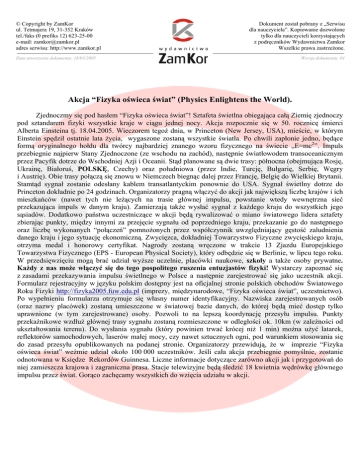 © Copyright by ZamKor ul. Tetmajera 19, 31-352 Kraków tel./faks (0 prefiks 12) 623-25-00 e-mail: [email protected] adres serwisu: http://www.zamkor.pl Dokument został pobrany z „Serwisu dla nauczyciela”. Kopiowanie dozwolone tylko dla nauczycieli korzystających z podręczników Wydawnictwa Zamkor Wszelkie prawa zastrzeżone. Data utworzenia dokumentu: 18/03/2005 Wersja dokumentu: 01 Akcja “Fizyka oświeca świat” (Physics Enlightens the World). Zjednoczmy się pod hasłem “Fizyka oświeca świat”! Sztafeta świetlna obiegająca całą Ziemię zjednoczy pod sztandarem fizyki wszystkie kraje w ciągu jednej nocy. Akcja rozpocznie się w 50. rocznicę śmierci Alberta Einsteina tj. 18.04.2005. Wieczorem tegoż dnia, w Princeton (New Jersey, USA), mieście, w którym Einstein spędził ostatnie lata życia, wygaszone zostaną wszystkie światła. Po chwili zapłonie jedno, będące formą oryginalnego hołdu dla twórcy najbardziej znanego wzoru fizycznego na świecie „E=mc2”. Impuls przebiegnie najpierw Stany Zjednoczone (ze wschodu na zachód), następnie światłowodem transoceanicznym przez Pacyfik dotrze do Wschodniej Azji i Oceanii. Stąd planowane są dwie trasy: północna (obejmująca Rosję, Ukrainę, Białoruś, POLSKĘ, Czechy) oraz południowa (przez Indie, Turcję, Bułgarię, Serbię, Węgry i Austrię). Obie trasy połączą się znowu w Niemczech biegnąc dalej przez Francję, Belgię do Wielkiej Brytanii. Stamtąd sygnał zostanie odesłany kablem transatlantyckim ponownie do USA. Sygnał świetlny dotrze do Princeton dokładnie po 24 godzinach. Organizatorzy pragną włączyć do akcji jak największą liczbę krajów i ich mieszkańców (nawet tych nie leżących na trasie głównej impulsu, powstanie wtedy wewnętrzna sieć przekazująca impuls w danym kraju). Zamierzają także wysłać sygnał z każdego kraju do wszystkich jego sąsiadów. Dodatkowo państwa uczestniczące w akcji będą rywalizować o miano światowego lidera sztafety zbierając punkty, między innymi za przejęcie sygnału od poprzedniego kraju, przekazanie go do następnego oraz liczbę wykonanych “połączeń” pomnożonych przez współczynnik uwzględniający gęstość zaludnienia danego kraju i jego sytuację ekonomiczną. Zwycięzca, dokładniej Towarzystwo Fizyczne zwycięskiego kraju, otrzyma medal i honorowy certyfikat. Nagrody zostaną wręczone w trakcie 13 Zjazdu Europejskiego Towarzystwa Fizycznego (EPS - European Physical Society), który odbędzie się w Berlinie, w lipcu tego roku. W przedsięwzięciu mogą brać udział wyższe uczelnie, placówki naukowe, szkoły a także osoby prywatne. Każdy z nas może włączyć się do tego pospolitego ruszenia entuzjastów fizyki! Wystarczy zapoznać się z zasadami przekazywania impulsu świetlnego w Polsce a następnie zarejestrować się jako uczestnik akcji. Formularz rejestracyjny w języku polskim dostępny jest na oficjalnej stronie polskich obchodów Światowego Roku Fizyki http://fizyka2005.fuw.edu.pl (imprezy, międzynarodowe, “Fizyka oświeca świat”, uczestnictwo). Po wypełnieniu formularza otrzymuje się własny numer identyfikacyjny. Nazwiska zarejestrowanych osób (oraz nazwy placówek) zostaną umieszczone w światowej bazie danych, do której będą mieć dostęp tylko uprawnione (w tym zarejestrowane) osoby. Pozwoli to na lepszą koordynację przesyłu impulsu. Punkty przekaźnikowe wzdłuż głównej trasy sygnału zostaną rozmieszczone w odległości ok. 10km (w zależności od ukształtowania terenu). Do wysłania sygnału (który powinien trwać krócej niż 1 min) można użyć latarek, reflektorów samochodowych, laserów małej mocy, czy nawet sztucznych ogni, pod warunkiem stosowania się do zasad przesyłu opublikowanych na podanej stronie. Organizatorzy przewidują, że w imprezie “Fizyka oświeca świat” weźmie udział około 100 000 uczestników. Jeśli cała akcja przebiegnie pomyślnie, zostanie odnotowana w Księdze Rekordów Guinnesa. Liczne informacje dotyczące zarówno akcji jak i przygotowań do niej zamieszcza krajowa i zagraniczna prasa. Stacje telewizyjne będą śledzić 18 kwietnia wędrówkę głównego impulsu przez świat. Gorąco zachęcamy wszystkich do wzięcia udziału w akcji.