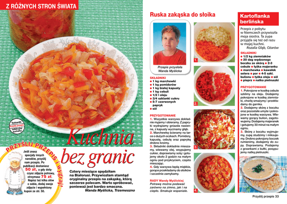 Z RÓŻNYCH STRON ŚWIATA Ruska zakąska do słoika Kartoflanka berlińska Przepis z pobytu w Niemczech przywiozła moja siostra. Ta zupa przyjęła się też od razu w mojej kuchni. Rozalia Głąb, Ożarów 1. Przepis przysłała Wanda Myślicka SKŁADNIKI ● 1 kg marchewki ● 1 kg pomidorów ● 1 kg białej kapusty ● 1 kg cebuli ● 1/2 l oleju ● 3/4 szklanki cukru ● 5-7 czerwonych papryk ● sól Testowała pis Przyślij prze na yj kc da re kucharka Jeśli znasz specjały innych narodów, przyślij nam przepis. Po publikacji dostaniesz 50 zł, a gdy dołączysz zdjęcie potrawy, otrzymasz 75 zł. Napisz też kilka słów o sobie, dodaj swoje zdjęcie i wypełniony kupon ze str. 50. Kuchnia bez granic Cztery miesiące spędziłam na Białorusi. Przywiozłam stamtąd oryginalny przepis na zakąskę, którą szczerze polecam. Warto spróbować, ponieważ jest bardzo smaczna. Wanda Myślicka, Trzemeszno PRZYGOTOWANIE 1. Wszystkie warzywa dokładnie myjemy i obieramy. Z papryki wydrążamy gniazda nasienne, z kapusty wycinamy głąb. 2. Marchewkę ścieramy na tarce o dużych oczkach. Pomidory, kapustę, cebulę oraz paprykę drobno kroimy. 3. Składniki dokładnie mieszamy, wlewamy olej, wsypujemy cukier, doprawiamy solą i gotujemy około 2 godzin na małym ogniu pod przykryciem, często mieszając. 4. Gdy warzywa będą miękkie, gorące przekładamy do słoików i szczelnie zamykamy. RADY Wandy Myślickiej Potrawę można podawać zarówno na zimno, jak i na ciepło. Smakuje wspaniale. 2. 3. SKŁADNIKI ● 1/2 kg ziemniaków ● 20 dag wędzonego boczku ze skórą ● 2-3 cebule ● łyżka majeranku ● marchewka ● kawałek selera ● por ● 4-5 szkl. bulionu ● łyżka oleju ● sól ● pieprz ● natka pietruszki PRZYGOTOWANIE 1. Pokrojone w kostkę cebule szklimy na oleju. Dodajemy pokrojone w kostkę ziemniaki, chwilę smażymy i przekładamy do garnka. 2. Dodajemy skórę z boczku oraz pozostałe umyte i pokrojone w kostkę warzywa. Wlewamy gorący bulion, zagotowujemy. Dodajemy majeranek i gotujemy 30 minut na małym ogniu. 3. Skórę z boczku wyjmujemy, zupę studzimy i miksujemy. Drobno pokrojony boczek rumienimy, dodajemy do zupy. Doprawiamy. Podajemy z grzankami z bułki, posypujemy natką pietruszki. 4. Przyślij przepis 33
