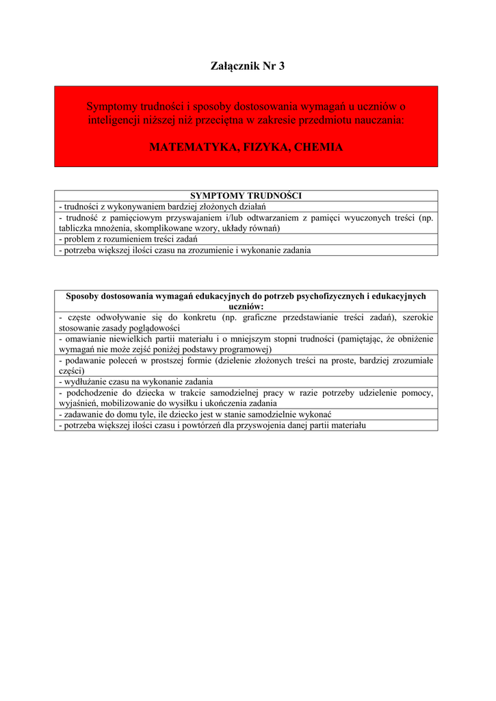 Załącznik Nr 3 Symptomy trudności i sposoby dostosowania wymagań u uczniów o inteligencji niższej niż przeciętna w zakresie przedmiotu nauczania: MATEMATYKA, FIZYKA, CHEMIA SYMPTOMY TRUDNOŚCI - trudności z wykonywaniem bardziej złożonych działań - trudność z pamięciowym przyswajaniem i/lub odtwarzaniem z pamięci wyuczonych treści (np. tabliczka mnożenia, skomplikowane wzory, układy równań) - problem z rozumieniem treści zadań - potrzeba większej ilości czasu na zrozumienie i wykonanie zadania Sposoby dostosowania wymagań edukacyjnych do potrzeb psychofizycznych i edukacyjnych uczniów: - częste odwoływanie się do konkretu (np. graficzne przedstawianie treści zadań), szerokie stosowanie zasady poglądowości - omawianie niewielkich partii materiału i o mniejszym stopni trudności (pamiętając, że obniżenie wymagań nie może zejść poniżej podstawy programowej) - podawanie poleceń w prostszej formie (dzielenie złożonych treści na proste, bardziej zrozumiałe części) - wydłużanie czasu na wykonanie zadania - podchodzenie do dziecka w trakcie samodzielnej pracy w razie potrzeby udzielenie pomocy, wyjaśnień, mobilizowanie do wysiłku i ukończenia zadania - zadawanie do domu tyle, ile dziecko jest w stanie samodzielnie wykonać - potrzeba większej ilości czasu i powtórzeń dla przyswojenia danej partii materiału