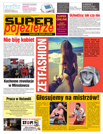BOTOX KWAS HIALURONOWY AQUALYX LIPOLIZA FARMAKOLOGICZNA 78-600 Wałcz, Tęczowa 5-7 +48 67 250 90 18, +48 601 210 010 www.proeste.eu, [email protected] Variable Pulsed LightTM - dowiedziona skuteczność w leczeniu niedoskonałości skóry Weekendowe wydanie „Pojezierza Wałeckiego”. (Nr 47) 27 listopada 2015 SUPER Największe wydawnictwo w powiecie 7500 egz. GAZETA BEZPŁATNA Nie biję kobiet Wałeccy gimnazjaliści wspólnie z policją i Komisją Alkoholową włączyli się do międzynarodowej kampanii "16 dni przeciw przemocy ze względu na płeć". Rozdawali na ulicach ulotki i białe wstążeczki, które są symbolem akcji. Plakaty: „Kocham, lubię, szanuję - nie biję kobiet” oraz „Stop przemocy wobec kobiet” zwracały uwagę przechodniów na poważny społeczny problem. Statystyki policyjne z 2014 roku mówią o 105 332 ofiarach przemocy domowej, wśród których jest aż 72 786 kobiet. W ciągu tygodnia giną w Polsce trzy kobiety, maltretowane i bite przez swoich partnerów. Skala zjawiska jest znacznie większa, bo wiele z ofiar milczy. Kuchenne rewolucje w Mirosławcu Magda Gessler przeprowadzała kuchenne rewolucje w restauracji "Magdalenka" w Mirosławcu. Szczegóły są objęte tajemnicą, nie jest też jeszcze znana data emisji programu. Wcześniej znana restauratorka gościła w naszych okolicach dwukrotnie. Ratowała lokale w Jastrowiu i w Pile. Praca w Holandii od zaraz: dla młodych kobiet w szklarniach przy kwiatach oraz na produkcji sera i pakowaniu mięsa od 07-12-2015 na 6 tygodni z możliwością przedłużenia zatrudnienia do roku: dla kobiet przy zbiorze pieczarek od nowego roku w I kwartale: dla kobiet i mężczyzn z doświadczeniem w pracy przy papryce, ogórkach, pomidorach, kwiatach doniczkowych i ciętych, sadzonkach Aktualne oferty również na stronie: www.posrednictwoholandia.pl Rekrutację prowadzi pośrednik dla ABOost w Holandii Wałcz, Kościuszki 12A, tel. 67 258 41 08 Licencja 4933 SUPER Uchodźcy: tak czy nie ONLINE „Super Pojezierze” w wersji elektronicznej na stronie www.pojezierze.com.pl ZETFASHION ISBN 1426-4366 • USUWANIE OWŁOSIENIA • ODMŁADZANIE SKÓRY • USUWANIE I REDUKCJA ZMIAN NACZYNIOWYCH • LECZENIE TRĄDZIKU AKTYWNEGO I ZMIAN POTRĄDZIKOWYCH Na prośbę Ministerstwa Pracy wojewodowie pytali gminy o to, czy i ile rodzin uchodźców są w stanie przyjąć. "Rzeczpospolita" ustaliła, że gminy zadeklarowały pomoc łącznie 435 uchodźcom, w tym aż 179 – 10 gmin w naszym województwie. Z terenu powiatu wałeckiego tylko Wałcz. W wywiadzie dla TV Asta burmistrz Bogusława Towalewska mówiła: - Jeśli byłaby taka konieczność, to jedna rodzina schronienie i opiekę mogłaby znaleźć. Uchodźcy, którzy do Polski przyjadą to ci, na których losie waży bardzo trudna sytuacja w krajach Bliskiego Wschodu. To są osoby po prostu pokrzywdzone. Zdziwiło nas, że deklaracji na "tak" nie złożyła Człopa, chociaż kilka tygodni temu na łamach "Super Pojezierza" burmistrz Zdzisław Kmieć mówił, że osobiście mógłby przyjąć jakąś rodzinę. Wójt Gminy Wałcz zapytany o zdanie w tej sprawie odpowiada dyplomatycznie: Moglibyśmy przyjąć jedną rodzinę i to po wnikliwej weryfikacji i zapytaniu naszych mieszkańców. Badanie miało charakter jedynie orientacyjny. Sabina Zborała ze Szwecji pod Wałczem od zawsze marzyła o karierze modelki. Kiedy okazało się, że na wybieg jest za niska, miała dwie opcje. Mogła albo się załamać, albo... Głosujemy na mistrzów! Aż trzech wałczan jest wśród 20 sportowców nominowanych Plebiscycie PS i TVP. Krzysztof Głowacki, Michał Kubiak oraz Magda Fularczyk (kajakarka, która u nas trenowała) będą walczyć o tytuł najlepszego sportowca roku obok takich sław jak Agnieszka Radwańska czy Robert Lewandowski. - To dla mnie niesamowite uczucie. Do tej pory takie wydarzenia oglądałem, a teraz sam w nich uczestniczę - powie powiedział Krzysztof Głowacki w rozmowie z dziennikarzem PS. Dodał, że warto walczyć o marzenia, chociaż ta walka jest okupiona wieloma wyrzeczeniami: - Na 360 dni w roku, 300 spędzam z dala od rodziny. Mimo to warto - podkreślał. O wyborze 10 najlepszych sportowców zadecydują fani. Głosowanie internetowe już się zaczęło i potrwa do 8 stycznia 2016 roku. Raz na 24 godziny można oddać jeden głos. Dodatkowo istnieje możliwość głosowania za pomocą kuponów z Przeglądu Sportowego (do 4 stycznia 2016 r.) oraz SMS (w dniu Gali - 9 stycznia 2016 r.). Szczegóły w regulaminie na stronie internetowej PS. Na fanpage'u Krzysztofa Głowackiego i Michała Kubiaka są już ak aktywne linki do głosowania internetowego. Fani na start! ZETFASHION Sabina Zborała ze Szwecji pod Wałczem od zawsze marzyła o karierze modelki. Kiedy okazało się, że na wybieg jest za niska, miała dwie opcje. Mogła albo się załamać, albo spróbować wejść do świata mody... tylnymi drzwiami. Ryzyko się opłaciło: dziś prowadzi bloga ZETFASHION i rozpoczyna współpracę z takimi markami jak Venezia czy Pierre Cardin. Prawdziwa historia o tym, że marzenia się spełniają. Coś w Tobie pękło? W moim życiu osobistym trochę się pozmieniało. Pojawił się Patryk. Facet z tysiącem pomysłów na minutę, który nie przyjmuje odpowiedzi: "NIE", "NIE DAM RADY", "NIE UDA MI SIĘ". Jest zawsze pozytywnie nastawiony do WSZYSTKIEGO. Dziś to on wspiera mnie najbardziej i pcha mnie ku realizacji marzeń. To mój życiowy partner, najlepszy przyjaciel i Manager w jednym. :) Manager? Tak – Patryk zajął się kwestiami technicznymi i dopilnował, by przed premierą wszystko było dopięte na ostatni guzik. 13 listopada oficjalnie ruszył mój blog, moja strona zetfashion.pl. Przyznam szczerze, że nie spodziewaliśmy się, że w ciągu 30 minut odmówi nam posłuszeństwa, ze względu na przeciążony serwer. To nie jedyny sukces, który odniosłaś w ostatnim czasie. Właśnie zaczynam współpracę z takimi markami jak Venezia, Tamaris