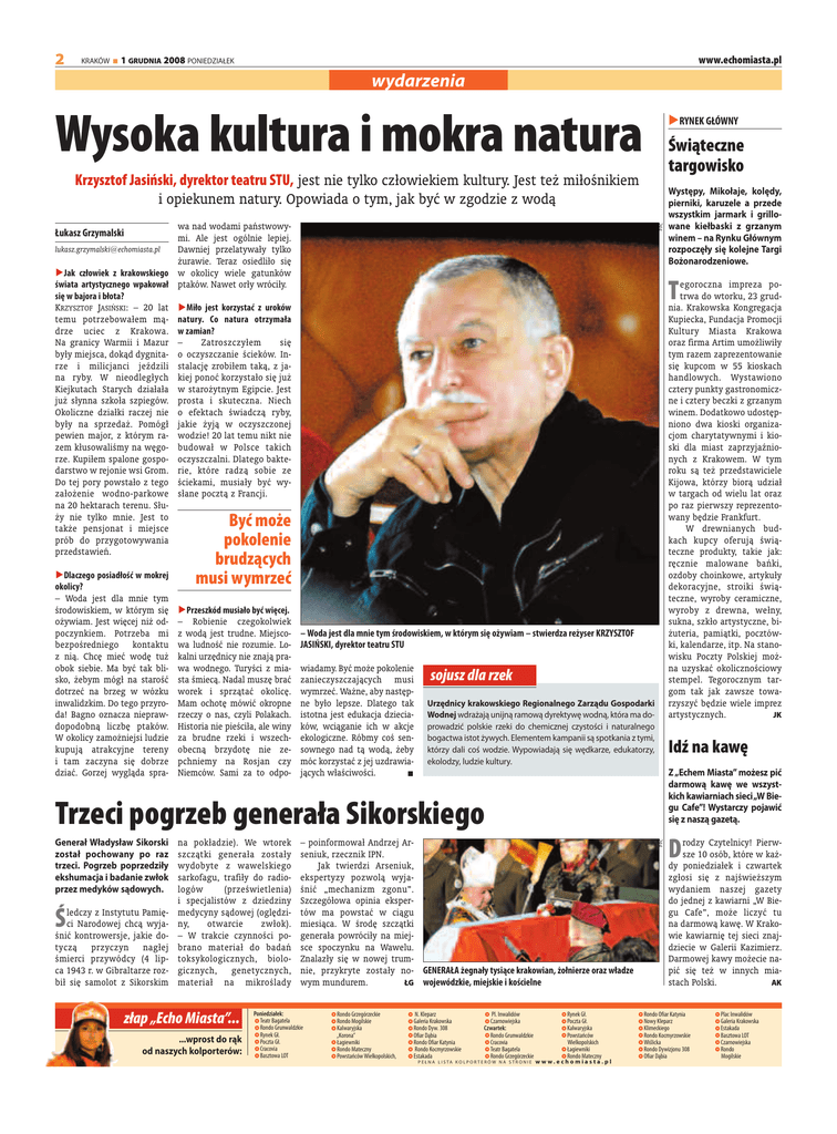 2 KRAKÓW www.echomiasta.pl 1 GRUDNIA 2008 PONIEDZIAŁEK wydarzenia Wysoka kultura i mokra natura RYNEK GŁÓWNY Świąteczne targowisko PPC Krzysztof Jasiński, dyrektor teatru STU, jest nie tylko człowiekiem kultury. Jest też miłośnikiem i opiekunem natury. Opowiada o tym, jak być w zgodzie z wodą wa nad wodami państwowymi. Ale jest ogólnie lepiej. [email protected] Dawniej przelatywały tylko żurawie. Teraz osiedliło się Jak człowiek z krakowskiego w okolicy wiele gatunków świata artystycznego wpakował ptaków. Nawet orły wróciły. się w bajora i błota? KRZYSZTOF JASIŃSKI: – 20 lat Miło jest korzystać z uroków temu potrzebowałem mą- natury. Co natura otrzymała drze uciec z Krakowa. w zamian? Zatroszczyłem się Na granicy Warmii i Mazur – były miejsca, dokąd dygnita- o oczyszczanie ścieków. Inrze i milicjanci jeździli stalację zrobiłem taką, z jana ryby. W nieodległych kiej ponoć korzystało się już Kiejkutach Starych działała w starożytnym Egipcie. Jest już słynna szkoła szpiegów. prosta i skuteczna. Niech Okoliczne działki raczej nie o efektach świadczą ryby, były na sprzedaż. Pomógł jakie żyją w oczyszczonej pewien major, z którym ra- wodzie! 20 lat temu nikt nie zem kłusowaliśmy na węgo- budował w Polsce takich rze. Kupiłem spalone gospo- oczyszczalni. Dlatego baktedarstwo w rejonie wsi Grom. rie, które radzą sobie ze Do tej pory powstało z tego ściekami, musiały być wyzałożenie wodno-parkowe słane pocztą z Francji. na 20 hektarach terenu. Służy nie tylko mnie. Jest to także pensjonat i miejsce prób do przygotowywania przedstawień. Łukasz Grzymalski Dlaczego posiadłość w mokrej okolicy? – Woda jest dla mnie tym środowiskiem, w którym się ożywiam. Jest więcej niż odpoczynkiem. Potrzeba mi bezpośredniego kontaktu z nią. Chcę mieć wodę tuż obok siebie. Ma być tak blisko, żebym mógł na starość dotrzeć na brzeg w wózku inwalidzkim. Do tego przyroda! Bagno oznacza nieprawdopodobną liczbę ptaków. W okolicy zamożniejsi ludzie kupują atrakcyjne tereny i tam zaczyna się dobrze dziać. Gorzej wygląda spra- T egoroczna impreza potrwa do wtorku, 23 grudnia. Krakowska Kongregacja Kupiecka, Fundacja Promocji Kultury Miasta Krakowa oraz firma Artim umożliwiły tym razem zaprezentowanie się kupcom w 55 kioskach handlowych. Wystawiono cztery punkty gastronomiczne i cztery beczki z grzanym winem. Dodatkowo udostępniono dwa kioski organizacjom charytatywnymi i kioski dla miast zaprzyjaźnionych z Krakowem. W tym roku są też przedstawiciele Kijowa, którzy biorą udział w targach od wielu lat oraz po raz pierwszy reprezentowany będzie Frankfurt. W drewnianych budkach kupcy oferują świąteczne produkty, takie jak: ręcznie malowane bańki, ozdoby choinkowe, artykuły dekoracyjne, stroiki świąteczne, wyroby ceramiczne, wyroby z drewna, wełny, sukna, szkło artystyczne, biżuteria, pamiątki, pocztówki, kalendarze, itp. Na stanowisku Poczty Polskiej można uzyskać okolicznościowy stempel. Tegorocznym targom tak jak zawsze towarzyszyć będzie wiele imprez artystycznych. JK Być może pokolenie brudzących musi wymrzeć Przeszkód musiało być więcej. – Robienie czegokolwiek z wodą jest trudne. Miejscowa ludność nie rozumie. Lokalni urzędnicy nie znają prawa wodnego. Turyści z miasta śmiecą. Nadal muszę brać worek i sprzątać okolicę. Mam ochotę mówić okropne rzeczy o nas, czyli Polakach. Historia nie pieściła, ale winy za brudne rzeki i wszechobecną brzydotę nie zepchniemy na Rosjan czy Niemców. Sami za to odpo- – Woda jest dla mnie tym środowiskiem, w którym się ożywiam – stwierdza reżyser KRZYSZTOF JASIŃSKI, dyrektor teatru STU wiadamy. Być może pokolenie zanieczyszczających musi wymrzeć. Ważne, aby następne było lepsze. Dlatego tak istotna jest edukacja dzieciaków, wciąganie ich w akcje ekologiczne. Róbmy coś sensownego nad tą wodą, żeby móc korzystać z jej uzdrawiających właściwości. sojusz dla rzek Urzędnicy krakowskiego Regionalnego Zarządu Gospodarki Wodnej wdrażają unijną ramową dyrektywę wodną, która ma doprowadzić polskie rzeki do chemicznej czystości i naturalnego bogactwa istot żywych. Elementem kampanii są spotkania z tymi, którzy dali coś wodzie. Wypowiadają się wędkarze, edukatorzy, ekolodzy, ludzie kultury. Idź na kawę Z „Echem Miasta” możesz pić darmową kawę we wszystkich kawiarniach sieci„W Biegu Cafe”! Wystarczy pojawić się z naszą gazetą. Ś ledczy z Instytutu Pamięci Narodowej chcą wyjaśnić kontrowersje, jakie dotyczą przyczyn nagłej śmierci przywódcy (4 lipca 1943 r. w Gibraltarze rozbił się samolot z Sikorskim na pokładzie). We wtorek szczątki generała zostały wydobyte z wawelskiego sarkofagu, trafiły do radiologów (prześwietlenia) i specjalistów z dziedziny medycyny sądowej (oględziny, otwarcie zwłok). – W trakcie czynności pobrano materiał do badań toksykologicznych, biologicznych, genetycznych, materiał na mikroślady złap „Echo Miasta”... ...wprost do rąk od naszych kolporterów: – poinformował Andrzej Arseniuk, rzecznik IPN. Jak twierdzi Arseniuk, ekspertyzy pozwolą wyjaśnić „mechanizm zgonu”. Szczegółowa opinia ekspertów ma powstać w ciągu miesiąca. W środę szczątki generała powróciły na miejsce spoczynku na Wawelu. Znalazły się w nowej trumnie, przykryte zostały no- GENERAŁA żegnały tysiące krakowian, żołnierze oraz władze wym mundurem. ŁG wojewódzkie, miejskie i kościelne Poniedziałek: Teatr Bagatela Rondo Grunwaldzkie Rynek Gł. Poczta Gł. Cracovia Basztowa LOT Rondo Grzegórzeckie Rondo Mogilskie Kalwaryjska „Korona” Łagiewniki Rondo Mateczny Powstańców Wielkopolskich, N. Kleparz Galeria Krakowska Rondo Dyw. 308 Ofiar Dąbia Rondo Ofiar Katynia Rondo Kocmyrzowskie Estakada Pl. Inwalidów Czarnowiejska Czwartek: Rondo Grunwaldzkie Cracovia Teatr Bagatela Rondo Grzegórzeckie P E Ł N 