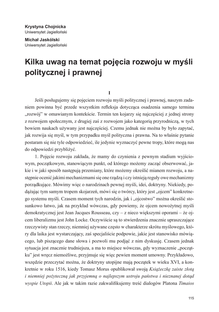 Krystyna Chojnicka Uniwersytet Jagielloński Michał Jaskólski Uniwersytet Jagielloński Kilka uwag na temat pojęcia rozwoju w myśli politycznej i prawnej I Jeśli posługujemy się pojęciem rozwoju myśli politycznej i prawnej, naszym zadaniem powinna być przede wszystkim refleksja dotycząca osadzenia samego terminu „rozwój” w omawianym kontekście. Termin ten kojarzy się najczęściej z jednej strony z rozwojem społecznym, z drugiej zaś z rozwojem jako kategorią przyrodniczą, w tych bowiem naukach używany jest najczęściej. Czemu jednak nie można by było zapytać, jak rozwija się myśl, w tym przypadku myśl polityczna i prawna. Na to właśnie pytanie postaram się nie tyle odpowiedzieć, ile jedynie wyznaczyć pewne tropy, które mogą nas do odpowiedzi przybliżyć. 1. Pojęcie rozwoju zakłada, że mamy do czynienia z pewnym stadium wyjściowym, początkowym, stanowiącym punkt, od którego możemy zacząć obserwować, jakie i w jaki sposób następują przemiany, które możemy określić mianem rozwoju, a następnie ocenić jakimi mechanizmami się one rządzą i czy istnieją reguły owe mechanizmy porządkujące. Mówimy więc o narodzinach pewnej myśli, idei, doktryny. Niekiedy, podążając tym samym tropem skojarzeń, mówi się o twórcy, który jest „ojcem” konkretnego systemu myśli. Czasem moment tych narodzin, jak i „ojcostwo” można określić stosunkowo łatwo, jak na przykład wówczas, gdy powiemy, że ojcem nowożytnej myśli demokratycznej jest Jean Jacques Rousseau, czy – z nieco większymi oporami – że ojcem liberalizmu jest John Locke. Oczywiście są to stwierdzenia znacznie upraszczające rzeczywisty stan rzeczy, niemniej używane często w charakterze skrótu myślowego, który dla laika jest wystarczający, zaś specjaliście podpowie, jakie jest stanowisko mówiącego, lub piszącego dane słowa i pozwoli mu podjąć z nim dyskusję. Czasem jednak sytuacja jest znacznie trudniejsza, a ma to miejsce wówczas, gdy wyznaczenie „początku” jest wręcz niemożliwe, przyjmuje się więc pewien moment umowny. Przykładowo, wszędzie przeczytać można, że doktryny utopijne mają początek w wieku XVI, a konkretnie w roku 1516, kiedy Tomasz Morus opublikował swoją Książeczkę zaiste złotą i niemniej pożyteczną jak przyjemną o najlepszym ustroju państwa i nieznanej dotąd wyspie Utopii. Ale jak w takim razie zakwalifikujemy treść dialogów Platona Timaios 115 Krystyna Chojnicka, Michał Jaskólski i Kritiasz i zawartą w tych dialogach wizję Atlantydy? Dopiero dwa tysiące lat po ich napisaniu można było określić tę wizję mianem utopijnej. Stało się to tylko dlatego, że Morus nadał nazwę temu gatunkowi pisarstwa. W tej sytuacji mamy do czynienia ze zjawiskiem nienazwanym, chociaż znanym i określonym, a nawet dość łatwym do zdefiniowania. Ale podobna sytuacja daje nam również możliwość dokonywania zabiegów w zakresie poszukiwania początków danej myśli, które nie są powszechnie akceptowane, a przez wielu wręcz określane jako ahistoryczne. Często bowiem dochodzi do ekstrapolacji, i klasyfikowania zjawisk z odległej przeszłości według kategorii współczesnych. Przykłady? Totalitaryzm Platona jest tu przykładem najwyrazistszym. Ta popperowska wizja „społeczeństwa zamkniętego”, która została wywiedziona z dialogów Platona i odniesiona wprost do dwudziestowiecznego totalitaryzmu, zdaniem konserwatywnych krytyków jest nie dość, że ahistoryczna, to jeszcze oderwana od założeń etycznych filozofii Platona. Czy jednak nie posiada fundamentalnego znaczenia dla określenia specyfiki europejskiej myśli politycznej w jej historycznym rozwoju? 2. Ustalenie początków danej myśli nie jest jak widać łatwe, trudno tu o jednoznaczność, stąd wyznaczany przez badaczy i komentatorów „początek” bywa najczęściej co najwyżej umowny. Jednak, jak przekonuje przykład Poppera, nie można z niego zrezygnować, tak z uwagi na walory porządkujące, jak i ze względu na przydatność w budowaniu struktur modelowych. W naszym systemie postrzegania historii w jej ujęciu chronologicznym, nieodzowne jest wyznaczanie początków i końców. Wychodząc więc od punktu początkowego, o którym mówiłam wcześniej, kiedy sformułowana została lub/i zyskała odbiorców i komentatowów jakaś doktryna czy myśl, możemy zacząć śledzić dalszy ich rozwój. Najpierw jednak dokonać należy rozstrzygnięcia, czy możliwe jest mówienie o rozwoju myśli politycznej i prawnej w ogóle, w obrębie konkretnej cywilizacji, lub chociażby epoki. Byłaby wówczas mowa o tendencjach rozwojowych myśli europejskiej, lub – w drugim przypadku – o tendencjach rozwojowych myśli renesansu lub oświecenia. Wtedy już w tytule zostanie zawarte istotne rozstrzygnięcie. Dajemy w nim bowiem wyraz przekonaniu, że cywilizacja, czy epoka są pewnym monolitem, że brak w ich obrębie wewnętrznych podziałów i sprzeczności, lub przynajmniej, że nie posiadają one istotnego znaczenia, że rozwój przybiera w nich model linearny, albo co najwyżej dialektyczny, i w końcu, że nie ma wątpliwości dotyczących momentu, od którego możemy mówić o początku danej cywilizacji, czy epoki. Postępując w myśl tych założeń starożytność kończymy wraz upadkiem Rzymu i z tą datą dekretujemy początek średniowiecza. Takie stanowisko, choć już na pierwszy rzut oka budzi zasadnicze wątpliwości, jest jednak powszechnie w literaturze wykorzystywane. Postępując podobnie, nadajemy datę końca średniowiecza i początku nowożytności, wyznaczając go pomiędzy upadkiem Konstantynopola (1453), „odkryciem” Ameryki (1492), a wystąpieniem 116 Kilka uwag na temat pojęcia rozwoju w myśli politycznej i prawnej Marcina Lutra (1517). Nawet jeśli przyjmiemy te umowne daty, to czy oznacza to, że starożytność, a w naszym przypadku myśl starożytna, przestała się rozwijać w 476 roku? Niep