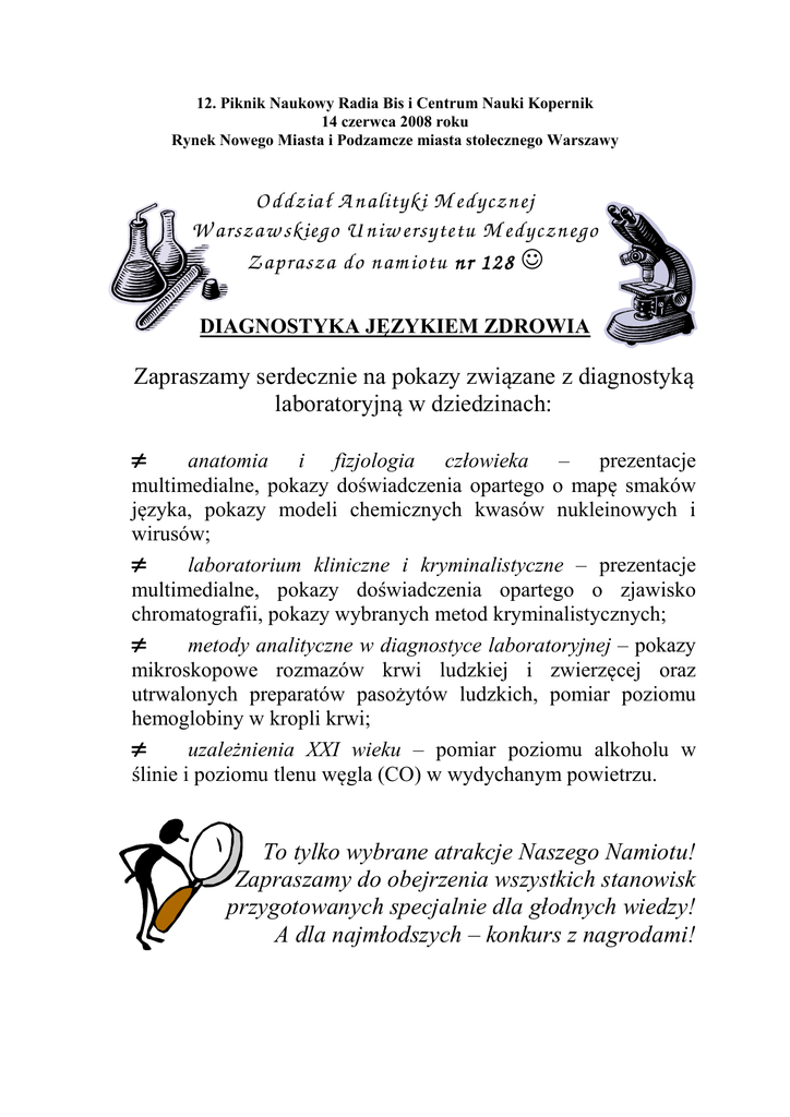 12. Piknik Naukowy Radia Bis i Centrum Nauki Kopernik 14 czerwca 2008 roku Rynek Nowego Miasta i Podzamcze miasta stołecznego Warszawy Oddział A nalityki M edycznej W arszaw skiego U niw ersytetu M edycznego Z aprasza do nam iotu nr 128 ☺ DIAGNOSTYKA JĘZYKIEM ZDROWIA Zapraszamy serdecznie na pokazy związane z diagnostyką laboratoryjną w dziedzinach: π anatomia i fizjologia człowieka – prezentacje multimedialne, pokazy doświadczenia opartego o mapę smaków języka, pokazy modeli chemicznych kwasów nukleinowych i wirusów; π laboratorium kliniczne i kryminalistyczne – prezentacje multimedialne, pokazy doświadczenia opartego o zjawisko chromatografii, pokazy wybranych metod kryminalistycznych; π metody analityczne w diagnostyce laboratoryjnej – pokazy mikroskopowe rozmazów krwi ludzkiej i zwierzęcej oraz utrwalonych preparatów pasożytów ludzkich, pomiar poziomu hemoglobiny w kropli krwi; π uzależnienia XXI wieku – pomiar poziomu alkoholu w ślinie i poziomu tlenu węgla (CO) w wydychanym powietrzu. To tylko wybrane atrakcje Naszego Namiotu! Zapraszamy do obejrzenia wszystkich stanowisk przygotowanych specjalnie dla głodnych wiedzy! A dla najmłodszych – konkurs z nagrodami!