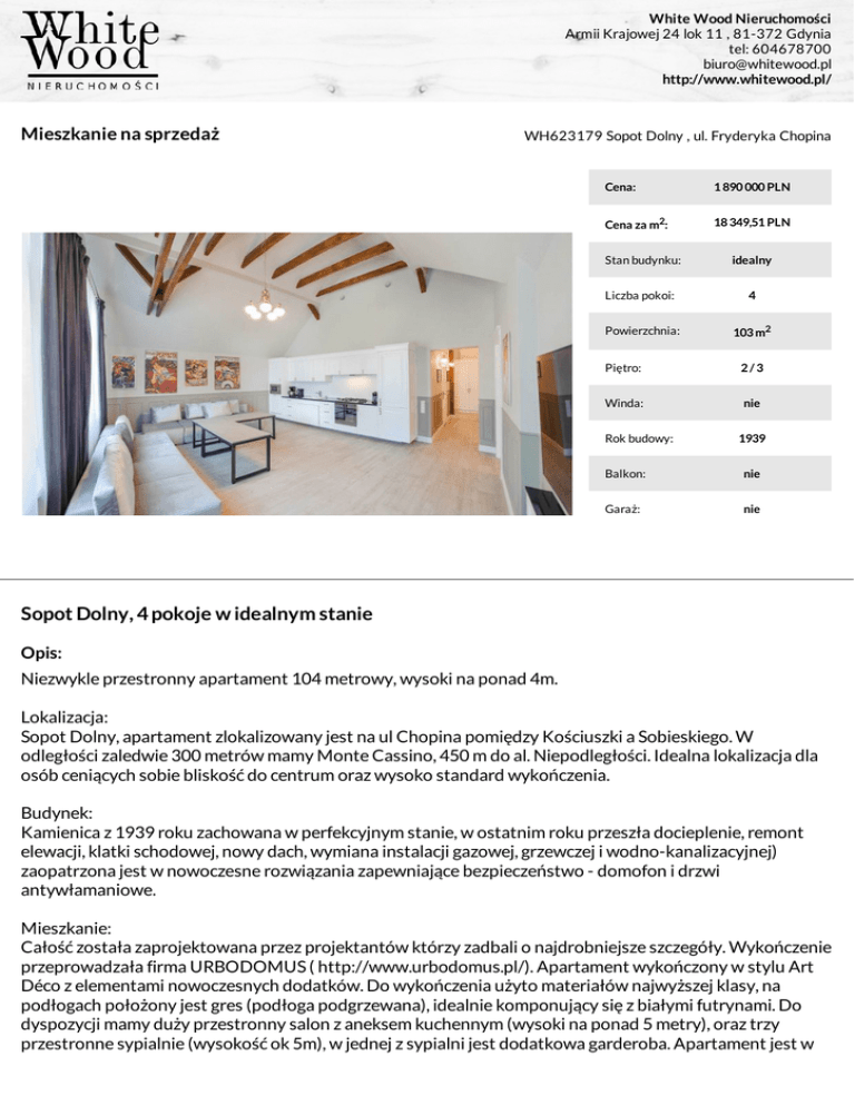 White Wood Nieruchomości Armii Krajowej 24 lok 11 , 81-372 Gdynia tel: 604678700 [email protected] http://www.whitewood.pl/ Mieszkanie na sprzedaż WH623179 Sopot Dolny , ul. Fryderyka Chopina Cena: 1 890 000 PLN Cena za m2: 18 349,51 PLN Stan budynku: idealny Liczba pokoi: 4 Powierzchnia: 103 m2 Piętro: 2/3 Winda: nie Rok budowy: 1939 Balkon: nie Garaż: nie Sopot Dolny, 4 pokoje w idealnym stanie Opis: Niezwykle przestronny apartament 104 metrowy, wysoki na ponad 4m. Lokalizacja: Sopot Dolny, apartament zlokalizowany jest na ul Chopina pomiędzy Kościuszki a Sobieskiego. W odległości zaledwie 300 metrów mamy Monte Cassino, 450 m do al. Niepodległości. Idealna lokalizacja dla osób ceniących sobie bliskość do centrum oraz wysoko standard wykończenia. Budynek: Kamienica z 1939 roku zachowana w perfekcyjnym stanie, w ostatnim roku przeszła docieplenie, remont elewacji, klatki schodowej, nowy dach, wymiana instalacji gazowej, grzewczej i wodno-kanalizacyjnej) zaopatrzona jest w nowoczesne rozwiązania zapewniające bezpieczeństwo - domofon i drzwi antywłamaniowe. Mieszkanie: Całość została zaprojektowana przez projektantów którzy zadbali o najdrobniejsze szczegóły. Wykończenie przeprowadzała firma URBODOMUS ( http://www.urbodomus.pl/). Apartament wykończony w stylu Art Déco z elementami nowoczesnych dodatków. Do wykończenia użyto materiałów najwyższej klasy, na podłogach położony jest gres (podłoga podgrzewana), idealnie komponujący się z białymi futrynami. Do dyspozycji mamy duży przestronny salon z aneksem kuchennym (wysoki na ponad 5 metry), oraz trzy przestronne sypialnie (wysokość ok 5m), w jednej z sypialni jest dodatkowa garderoba. Apartament jest w White Wood Nieruchomości Armii Krajowej 24 lok 11 , 81-372 Gdynia tel: 604678700 [email protected] http://www.whitewood.pl/ pełni wyposażony w sprzęt i meble z najwyższej półki. Opłaty ok 700 zł. Rozkład: Salon z aneksem kuchennym- 40m2 Sypialnia - 10m2 Sypialnia - 12m2 Sypialnia - 12m2 Łazienka - 6m2 Łazienka - 3m2 Garderoba - 3m2 Do dyspozycji mieszkańców są miejsca postojowe na terenie posesji. Paweł Podbielski +48-604-678-700 Paweł Podbielski +48-604-678-700 White Wood Nieruchomości Paweł Podbielski Armii Krajowej 24 lok 11 , 81-372 Gdynia +48-604-678-700 [email protected] http://www.whitewood.pl/