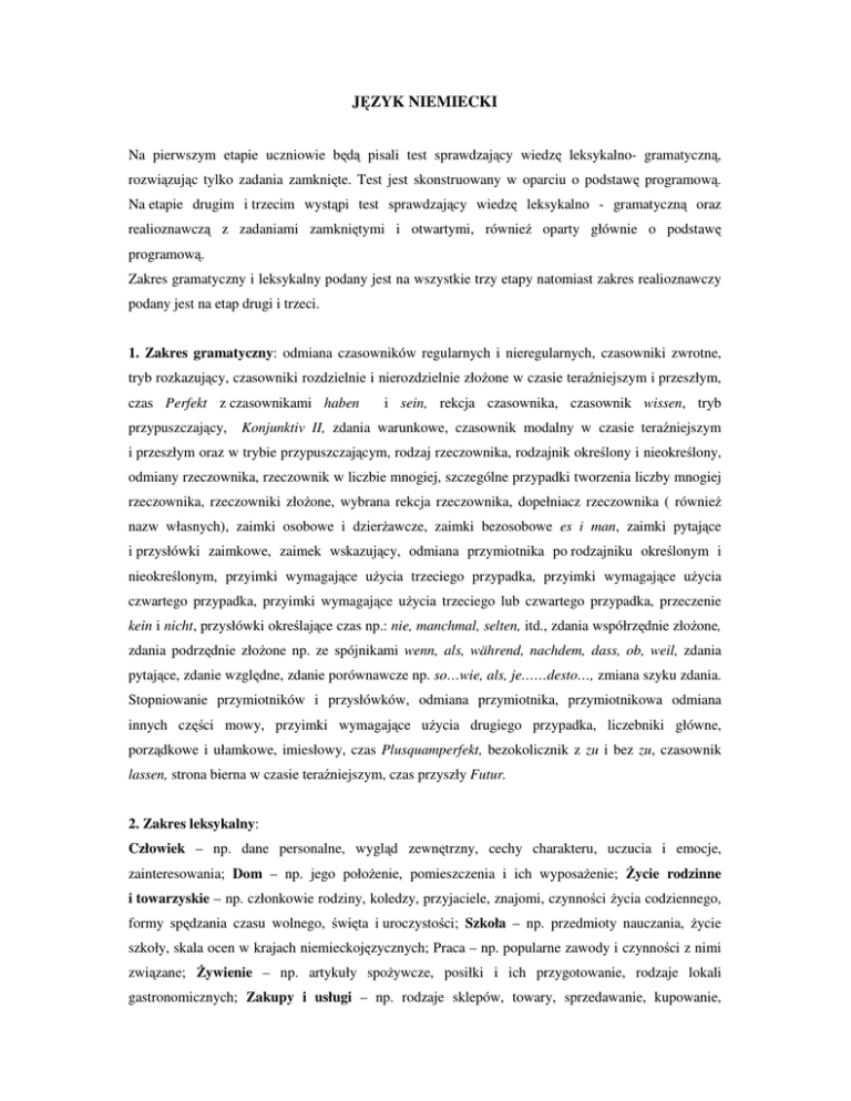 JĘZYK NIEMIECKI Na pierwszym etapie uczniowie będą pisali test sprawdzający wiedzę leksykalno- gramatyczną, rozwiązując tylko zadania zamknięte. Test jest skonstruowany w oparciu o podstawę programową. Na etapie drugim i trzecim wystąpi test sprawdzający wiedzę leksykalno - gramatyczną oraz realioznawczą z zadaniami zamkniętymi i otwartymi, również oparty głównie o podstawę programową. Zakres gramatyczny i leksykalny podany jest na wszystkie trzy etapy natomiast zakres realioznawczy podany jest na etap drugi i trzeci. 1. Zakres gramatyczny: odmiana czasowników regularnych i nieregularnych, czasowniki zwrotne, tryb rozkazujący, czasowniki rozdzielnie i nierozdzielnie złożone w czasie teraźniejszym i przeszłym, czas Perfekt z czasownikami haben przypuszczający, i sein, rekcja czasownika, czasownik wissen, tryb Konjunktiv II, zdania warunkowe, czasownik modalny w czasie teraźniejszym i przeszłym oraz w trybie przypuszczającym, rodzaj rzeczownika, rodzajnik określony i nieokreślony, odmiany rzeczownika, rzeczownik w liczbie mnogiej, szczególne przypadki tworzenia liczby mnogiej rzeczownika, rzeczowniki złożone, wybrana rekcja rzeczownika, dopełniacz rzeczownika ( również nazw własnych), zaimki osobowe i dzierżawcze, zaimki bezosobowe es i man, zaimki pytające i przysłówki zaimkowe, zaimek wskazujący, odmiana przymiotnika po rodzajniku określonym i nieokreślonym, przyimki wymagające użycia trzeciego przypadka, przyimki wymagające użycia czwartego przypadka, przyimki wymagające użycia trzeciego lub czwartego przypadka, przeczenie kein i nicht, przysłówki określające czas np.: nie, manchmal, selten, itd., zdania współrzędnie złożone, zdania podrzędnie złożone np. ze spójnikami wenn, als, während, nachdem, dass, ob, weil, zdania pytające, zdanie względne, zdanie porównawcze np. so…wie, als, je……desto…, zmiana szyku zdania. Stopniowanie przymiotników i przysłówków, odmiana przymiotnika, przymiotnikowa odmiana innych części mowy, przyimki wymagające użycia drugiego przypadka, liczebniki główne, porządkowe i ułamkowe, imiesłowy, czas Plusquamperfekt, bezokolicznik z zu i bez zu, czasownik lassen, strona bierna w czasie teraźniejszym, czas przyszły Futur. 2. Zakres leksykalny: Człowiek – np. dane personalne, wygląd zewnętrzny, cechy charakteru, uczucia i emocje, zainteresowania; Dom – np. jego położenie, pomieszczenia i ich wyposażenie; Życie rodzinne i towarzyskie – np. członkowie rodziny, koledzy, przyjaciele, znajomi, czynności życia codziennego, formy spędzania czasu wolnego, święta i uroczystości; Szkoła – np. przedmioty nauczania, życie szkoły, skala ocen w krajach niemieckojęzycznych; Praca – np. popularne zawody i czynności z nimi związane; Żywienie – np. artykuły spożywcze, posiłki i ich przygotowanie, rodzaje lokali gastronomicznych; Zakupy i usługi – np. rodzaje sklepów, towary, sprzedawanie, kupowanie, reklama, korzystanie z usług, reklamacja; Podróżowanie i turystyka – np. wycieczki, zwiedzanie, środki transportu, informacja turystyczna, orientacja w terenie – kierunki, nazwy krajów i kontynentów; Środki masowego przekazu; Sport – np. dyscypliny sportu, obiekty i sprzęt sportowy, imprezy sportowe; Zdrowie – np. zdrowy tryb życia, samopoczucie, dolegliwości, choroby i ich leczenie; Nauka i technika – np. wynalazki, podstawowe urządzenia techniczne i ich obsługa, komputer i Internet; Świat przyrody – np. pogoda, rośliny, zwierzęta, krajobraz, ochrona środowiska naturalnego; Przysłowia Sprawdzane w testach intencje językowe będą odnosić się do powyżej podanej tematyki: np. określenie czasu przy opisie dnia codziennego. 3. Zakres realioznawczy: system szkolnictwa w Niemczech, opis położenia geograficznego Niemiec, Szwajcarii i Austrii, stolice i ich zabytki. Ważne miasta w Niemczech, Szwajcarii i Austrii, najważniejsze obiekty w miastach. Różne dziedziny kultury, twórcy i ich dzieła np. wybitni kompozytorzy Mozart, Beethoven i inni. Uczestniczenie w różnych imprezach kulturalnych, ważne wydarzenia historyczne pod koniec XX wieku w Niemczech, postacie z legend – np. Lorelei, Wilhelm Tell. Państwo Niemieckie w Unii Europejskiej. Największe Landy w Niemczech. Języki w Szwajcarii. 4. Sprawność pisania: będzie sprawdzana na drugim i trzecim etapie. Na drugim etapie będzie to krótka forma a na trzecim dłuższa forma np. długi list. Tematyka wypowiedzi pisemnej obejmuje podany powyżej zakres leksykalny. Literatura: 1. Podręczniki do nauczania języka niemieckiego dla szkół gimnazjalnych dopuszczone przez MENiS. 2. Repetytoria tematyczno-leksykalne. 3. Przewodniki turystyczne. 4. Słowniki tematyczne. 5. Gramatyki języka niemieckiego. (Każdy uczestnik II i III etapu powinien posiadać kartę do kodowania opracowaną komputerowo. Dyrektor szkoły odpowiada za przygotowanie karty według załączonego wzoru załącznik nr 21)