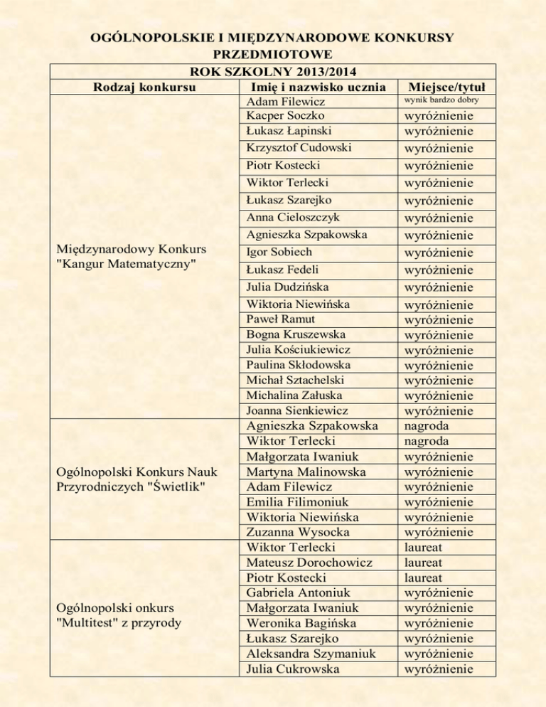 OGÓLNOPOLSKIE I MIĘDZYNARODOWE KONKURSY PRZEDMIOTOWE ROK SZKOLNY 2013/2014 Rodzaj konkursu Imię i nazwisko ucznia Miejsce/tytuł Międzynarodowy Konkurs "Kangur Matematyczny" Ogólnopolski Konkurs Nauk Przyrodniczych "Świetlik" Ogólnopolski onkurs "Multitest" z przyrody Adam Filewicz Kacper Soczko Łukasz Łapinski Krzysztof Cudowski Piotr Kostecki Wiktor Terlecki Łukasz Szarejko Anna Cieloszczyk Agnieszka Szpakowska Igor Sobiech Łukasz Fedeli Julia Dudzińska Wiktoria Niewińska Paweł Ramut Bogna Kruszewska Julia Kościukiewicz Paulina Skłodowska Michał Sztachelski Michalina Załuska Joanna Sienkiewicz Agnieszka Szpakowska Wiktor Terlecki Małgorzata Iwaniuk Martyna Malinowska Adam Filewicz Emilia Filimoniuk Wiktoria Niewińska Zuzanna Wysocka Wiktor Terlecki Mateusz Dorochowicz Piotr Kostecki Gabriela Antoniuk Małgorzata Iwaniuk Weronika Bagińska Łukasz Szarejko Aleksandra Szymaniuk Julia Cukrowska wynik bardzo dobry wyróżnienie wyróżnienie wyróżnienie wyróżnienie wyróżnienie wyróżnienie wyróżnienie wyróżnienie wyróżnienie wyróżnienie wyróżnienie wyróżnienie wyróżnienie wyróżnienie wyróżnienie wyróżnienie wyróżnienie wyróżnienie wyróżnienie nagroda nagroda wyróżnienie wyróżnienie wyróżnienie wyróżnienie wyróżnienie wyróżnienie laureat laureat laureat wyróżnienie wyróżnienie wyróżnienie wyróżnienie wyróżnienie wyróżnienie Ogólnopolska olimpiada przedmiotowa z przyrody OLIMPUS Sesja zimowa Ogólnopolska olimpiada przedmiotowa z przyrody OLIMPUS Sesja wiosenna Ogólnopolska olimpiada przedmiotowa z historii OLIMPUS Wiktor Terlecki Małgorzata Iwaniuk Igor Sobiech laureat laureat wyróżnienie Wiktor Terlecki laureat Wiktor Terlecki laureat Ogólnopolski Konkurs Języka Angielskiego "Fox" Agnieszka Szpakowska Ogólnopolski Konkurs Języka Angielskiego "Olimpusek" Gabriela Kowalczuk Dudel Wiktoria Kościukiewicz Julia Sienkiewicz Sebastian Kacper Sztabińska Zofia Kopczuk Julia ROK SZKOLNY 2012/2013 Rodzaj konkursu Imię i nazwisko ucznia Wiktor Terlecki Marcin Paczkowski Wiktor Zbieć Jakub Jakacki Międzynarodowy Konkurs "Kangur Matematyczny" Małgorzata Iwaniuk Mateusz Pietrzycki Adam Filewicz Krzysztof Cudowski Wiktor Terlecki Agnieszka Szpakowska Ogólnopolski Konkurs Nauk Igor Sobiech Przyrodniczych "Świetlik" Kamila Kruk Marcin Paczkowski Agnieszka Szpakowska Wiktor Terlecki Ogólnopolski onkurs Magdalena Salmanowicz "Multitest" z przyrody Igor Sobiech Kamila Maliszewska Agnieszka Szpakowska Ogólnopolska olimpiada przedmiotowa z przyrody Wiktor Terlecki OLIMPUS Sesja zimowa Igor Sobiech wynik bardzo dobry wynik bardzo dobry laureat laureat laureat laureat laureat Miejsce/tytuł wynik bardzo dobry wyróżnienie wyróżnienie wyróżnienie wyróżnienie wyróżnienie wyróżnienie wyróżnienie laureat nagroda wyróżnienie wyróżnienie wyróżnienie laureat laureat wyróżnienie wyróżnienie wyróżnienie laureat laureat wyróżnienie OLIMPUS Sesja wiosenna Ogólnopolski Konkurs Języka Angielskiego "Fox" Ogólnopolski konkurs polonistyczny „Z poprawną polszczyzną na co dzień” Wiktor Terlecki Agnieszka Szpakowska Krzysztof Cudowski Agnieszka Szpakowska ROK SZKOLNY 2011/2012 Rodzaj konkursu Imię i nazwisko ucznia Adam Filewicz Piotr Ciszewski Marcin Abramowicz Międzynarodowy Aleksandra Gwiazdowska Konkurs "Kangur Małgorzata Iwaniuk Matematyczny" Igor Sobiech Anna Cieloszczyk Agnieszka Szpakowska Julia Sienicka Kinga Gołąbiewska Kacper Falkowski Ogólnopolski Konkurs Kamila Trembowska Nauk Przyrodniczych Mateusz Pietrzycki "Świetlik" Kinga Gołąbiewska Julia Sienicka Agnieszka Szpakowska Ogólnopolski Konkurs Języka Angielskiego Agnieszka Szpakowska "Fox" ROK SZKOLNY 2010/2011 Rodzaj konkursu Imię i nazwisko ucznia Bondaruk Małgorzata Paula Grabowska Kacper Zajkowski Kajetan Zarzycki Piotr Kostecki Międzynarodowy Krzysztof Cudowski Konkurs "Kangur Krzysztof Gąsiorowski Matematyczny" Adrian Grajewski Marcin Abramowicz Karolina Zińczuk Julia Sienicka Joanna Pskowska laureat wynik bardzo dobry finalista finalista Miejsce/tytuł wyróżnienie wyróżnienie wyróżnienie wyróżnienie wyróżnienie wyróżnienie wyróżnienie wyróżnienie wyróżnienie wyróżnienie wyróżnienie wyróżnienie wyróżnienie wyróżnienie wyróżnienie wyróżnienie wynik bardzo dobry Miejsce/tytuł wynik bardzo dobry wynik bardzo dobry wyróżnienie wyróżnienie wyróżnienie wyróżnienie wyróżnienie wyróżnienie wyróżnienie wyróżnienie wyróżnienie wyróżnienie Bartłomiej Gaca Paweł Majtas Anna Karpowicz Agnieszka Szpakowska Ogólnopolski Konkurs Nauk Przyrodniczych "Świetlik" Ogólnopolski Konkurs Języka Angielskiego "Fox" Kamila Trembowska Julia Sienicka Anna Karpowicz Katarzyna Kiryluk Mateusz Pietrzycki Agnieszka Szpakowska ROK SZKOLNY 2009/2010 Imię i nazwisko ucznia Kacper Zajkowski Igor Buchowiec Kajetan Zarzycki Mateusz Ościłowski Tomasz Bukłaho Karolina Zińczuk Paulina Miller Kamil Fiedoruk Maciej Mucha Międzynarodowy Konkurs "Kangur Patryk Maliszewski Matematyczny" Jacek Antypiuk Anna Lubaszewska Adam Sulima Dolina Paweł Majtas Tomasz Michrowski Sienicka Julia Rutkowski Marcin Abramowicz Marcin Ciszewski Piotr Agnieszka Szpakowska Julia Sienicka Ogólnopolski Konkurs Nauk Przyrodniczych Gabriela Czyżewska "Świetlik" Katarzyna Kiryluk Jakub Twarowski Rodzaj konkursu wyróżnienie wyróżnienie wyróżnienie I miejsce/ nagroda głów. nagroda nagroda nagroda wyróżnienie wyróżnienie wynik bardzo dobry Miejsce/tytuł wynik bardzo dobry wynik bardzo dobry wynik bardzo dobry wynik bardzo dobry wynik bardzo dobry wynik bardzo dobry wyróżnienie wyróżnienie wyróżnienie wyróżnienie wyróżnienie wyróżnienie wyróżnienie wyróżnienie wyróżnienie wyróżnienie wyróżnienie wyróżnienie wyróżnienie nagroda nagroda wyróżnienie wyróżnienie wyróżnienie Mateusz Pietrzycki Marcin Abramowicz Dominika Drygiel Małgorzata Kiślak Anna Karpowicz ROK SZKOLNY 2008/2009 I