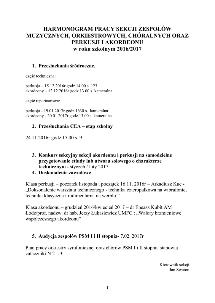 HARMONOGRAM PRACY SEKCJI ZESPOŁÓW MUZYCZNYCH, ORKIESTROWYCH, CHÓRALNYCH ORAZ PERKUSJI I AKORDEONU w roku szkolnym 2016/2017 1. Przesłuchania śródroczne, część techniczna: perkusja – 15.12.2016r godz.14.00 s. 123 akordeony – 12.12.2016r godz.13.00 s. kameralna część repertuarowa: perkusja - 19.01.2017r godz.1630 s. kameralna akordeony - 20.01.2017r godz.13.00 s. kameralna 2. Przesłuchania CEA – etap szkolny 24.11.2016r godz.15.00 s. 9 3. Konkurs sekcyjny sekcji akordeonu i perkusji na samodzielne przygotowanie etiudy lub utworu solowego o charakterze technicznym - styczeń / luty 2017 4. Doskonalenie zawodowe Klasa perkusji – początek listopada i początek 16.11. 2016r – Arkadiusz Kuc „Doksonalenie warsztatu technicznego - technika czteropałkowa na wibrafonie, technika klasyczna i rudimentarna na werblu.” Klasa akordeonu – grudzień 2016/kwiecień 2017 – dr Eneasz Kubit AM Łódź/prof. nadzw. dr hab. Jerzy Łukasiewicz UMFC : „Walory brzmieniowe współczesnego akordeonu” 5. Audycja zespołów PSM I i II stopnia- 7.02. 2017r Plan pracy orkiestry symfonicznej oraz chórów PSM I i II stopnia stanowią załączniki N 2 i 3. Kierownik sekcji Jan Swaton 1 Hubert Prochota Rok szkolny 2016/2017 PLAN PRACY ORKIESTRY I ZESPOŁÓW KAMERALNYCH WRZESIEŃ Praca z orkiestrą kameralną (Koncert w ramach Europejskich Dni Dziedzictwa) G. B. Pergolesi: Stabat Mater Orkiestra Symfoniczna J. S. Bach Oratorium na Boże Narodzenie Zespół Instrumentów Dętych Program do koncertu „Zaduszki jazzowe” PAŹDZIERNIK Praca z orkiestrą kameralną Eryk Brikner: Vesperae de Beatae Mariae Virginis Orkiestra Symfoniczna J. S. Bach Oratorium na Boże Narodzenie Zespół Instrumentów Dętych Program do koncertu w Chróścicach LISTOPAD 3 XI występ z Zespołem Instrumentów Dętych Orkiestra Symfoniczna J. S. Bach Oratorium na Boże Narodzenie GRUDZIEŃ 1-5 XII wyjazd Orkiestry Symfonicznej do Mainz Program: J. S. Bach Oratorium na Boże Narodzenie 17 XII Koncert na Jasnej Górze 18 XII Koncert w kościele NMP w Nowej Wsi Królewskiej w Opolu Program: J. S. Bach Oratorium na Boże Narodzenie 2 STYCZEŃ Orkiestra Symfoniczna Przygotowanie programu do Koncertu Noworocznego 25 -29 I Warsztaty Orkiestrowe z udziałem Willigis Sinfonie Orchester Mainz LUTY Orkiestra Symfoniczna Przygotowanie programu do koncertów w ramach Jubileuszu 70lecia PSM MARZEC Orkiestra Symfoniczna Przygotowanie programu do koncertów w ramach Jubileuszu 70lecia PSM KWIECIEŃ Orkiestra Symfoniczna Przygotowanie programu do koncertów w ramach Jubileuszu 70lecia PSM MAJ Orkiestra Symfoniczna Przygotowanie programu do koncertów w ramach Jubileuszu 70lecia PSM CZERWIEC Orkiestra Symfoniczna Przygotowanie programu do Mainz Wyjazd do Mainz (termin do ustalenia) 3