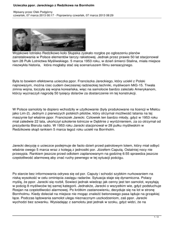 Ucieczka ppor. Jareckiego z Redzikowa na Bornholm Wpisany przez Olek Podgórny czwartek, 07 marca 2013 00:17 - Poprawiony czwartek, 07 marca 2013 08:29 Wojskowe lotnisko Redzikowo koło Słupska zyskało rozgłos po ogłoszeniu planów zainstalowania w Polsce elementów tarczy rakietowej. Jednak przez prawie 50 lat stacjonował tam 28 Pułk Lotnictwa Myśliwskiego. 5 marca 1953 roku, w dzień śmierci Stalina, miała miejsce niezwykła historia, która mogłaby stać się scenariuszem filmu sensacyjnego. Była to bowiem efektowna ucieczka ppor. Franciszka Jareckiego, który uciekł z Polski najnowszym, można rzec cudem ówczesnej radzieckiej techniki, myśliwcem MiG-15. Trwała zimna wojna, toczyła się wojna koreańska, więc na samolocie bardzo zależało Amerykanom, którzy wyznaczyli nagrodę 50 tysięcy dolarów za dostarczenie im tej konstrukcji. W Polsce samoloty te dopiero wchodziły w użytkowanie (były produkowane na licencji w Mielcu jako Lim-2). Jednym z pierwszych polskich pilotów, który otrzymał możliwość latania na tej maszynie był właśnie ppor. Franciszek Jarecki. Człowiek ten bardzo młody, gdyż w 1953 roku miał zaledwie 22 lata, ukończył szkolenie lotnicze w Dęblinie z wyróżnieniem, za co otrzymał od prezydenta Bieruta radio. W 1953 roku Jarecki stacjonował w 28 pułku myśliwskim w Redzikowie skąd rankiem 5 marca tegoż roku uciekł na Bornholm. Jarecki decyzję o ucieczce podejmuje de facto dzień przed patrolowym lotem, który miał odbyć właśnie owego 5 marca wraz z kolegą z jednostki por. Józefem Caputą. Ostatniej nocy nie przesypia. Rankiem jeszcze przed odlotem zaplanowanym na godzinę 6:55 sprawdza jeszcze częstotliwość alarmową aby znać ruchy pewnego w tej sytuacji pościgu. Po starcie bez informowania odrywa się od por. Caputy i schodzi szybkim nurkowaniem na niską wysokość w celu ominięcia zasięgu radarów. Sytuacja staje się dynamiczna. Polacy myślą, że ppor. Jarecki się rozbił, Sowieci jednak wiedząc jak cenny jest ten samolot, wysyłają w pościg 8 myśliwców tej samej kategorii. Jednakże, Jarecki o wszystkim wie, gdyż podsłuchuje Rosjan na częstotliwości alarmowej. Po krótkim zastanowieniu, decyduje się na lot w stronę Bornholmu. Kiedy doleciał na miejsce nie mogąc znaleźć betonowego pasa ląduje na grząskiej łące. Podczas lądowania samolot ulega nieznacznym uszkodzeniom, zaś ppor. Jarecki wychodzi bez szwanku. Wysiadając z samolotu jest jednak w szoku, gdyż widzi, że na 1/3 Ucieczka ppor. Jareckiego z Redzikowa na Bornholm Wpisany przez Olek Podgórny czwartek, 07 marca 2013 00:17 - Poprawiony czwartek, 07 marca 2013 08:29 ogrodzeniu są rosyjskie napisy (efekt okupacji sowieckiej), wyjmuje pistolet, ale widzi, że nadchodzący żołnierze mają inne mundury, że są to mundury duńskie. Wypowiada standardowe wtedy słowa dla każdego uciekającego: "Komunizm kaput, asylum". Gazety na całym świecie huczą z powodu śmierci Stalina i wyczynu Polaka sugerując między wierszami wpływ tej sytuacji na śmierć sowieckiego dyktatora. Natomiast Jarecki po kilkudniowym pobycie w Danii wyjeżdża do Wielkiej Brytanii, gdzie otrzymuje Krzyż Zasługi z Mieczami z rąk gen. Władysława Andersa. Potem wyrusza do USA gdzie otrzymuje wspomnianą nagrodę 50 tysięcy dolarów z rąk Amerykanów a także dosłownie z rąk prezydenta Eisenhowera obywatelstwo amerykańskie. Wracając do momentu lądowania na Bornholmie natychmiast po nim pojawiają się również amerykańscy i brytyjscy agenci, którzy badają samolot robiąc specjalne odlewy, po czym odsyłają go na mocy prawa międzynarodowego do Polski. Zmierzając do końca, wyczyn ppor. Jareckiego jest czymś niesamowitym w tamtym czasie. Ale niestety miał on też swoje negatywne konsekwencje w kraju. Do więzienia na 3 lata po ciężkim okaleczeniu w trakcie aresztowania i śledztwa trafia matka Jareckiego, w to samo miejsce trafia również por. Caputa, który nic nie wiedział o planach Jareckiego. Następują czystki w jednostce. Sam Jarecki zostaje skazany zaocznie przez sąd wojskowy PRL na karę śmierci. Podporucznik ten pozostał na stałe zagranicami Polski. Zmarł w wieku 79 lat w stanie Pensylwania w 2010 roku. W Polsce pojawił się raz na zaproszenie stacji telewizyjnej w celu nagrania reportażu na temat jego wyczynu. Na koniec warto wspomnieć, że ppor. Franciszek Jarecki został bohaterem zachodu, w USA na lekcjach historii wspomina się jego wyczyn, a w Muzeum Lotnictwa i Astronautyki w Waszyngtonie do dziś wisi jego kombinezon. Olek Podgórny Studenci dla Rzeczypospolitej Pierwotnie tekst ukazał sie pod tytułem "Brawurowa ucieczka oficera LWP w dniu śmierci Stalina". Na zdjęciu: ppor. Franciszek Jarecki i jego samolot na Bornholmie, w chwilę po wylądowaniu (Ole Nikolajsen, A Cold War Defection). 2/3 Ucieczka ppor. Jareckiego z Redzikowa na Bornholm Wpisany przez Olek Podgórny czwartek, 07 marca 2013 00:17 - Poprawiony czwartek, 07 marca 2013 08:29 KRESY.PL - największe w Polsce medium poświęconym fenomenowi dawnych Kresów Rzeczypospolitej. Na bieżąco informujemy o wydarzeniach mających znaczenie dla pamięci, teraźniejszości i przyszłości Kresów. To dzięki nam polskie społeczeństwo dowiedziało się m.in. o sprawie Rajdu Bandery. Jednak Kresy.pl to nie tylko informacje i publicystyka, ale także zakrojone na szeroką skalę przedsięwzięcia archiwizacyjne, inwentaryzacyjne i digitalizacyjne. Dzięki naszym działaniom powstała największa baza kresowych miejscowości, stale przez nas uzupełniana i weryfikowana (Ponad 20.000 miejsc z podziałem na powiaty i województwa – zarówno przedrozbiorowej, jak i przedwojennej Rzeczypospolitej). Jako pierwsi, bazując na pracy p.p. Ewy i Władysława Siemaszków, stworzyliśmy osobowy indeks ofiar ludobójstwa OUN-UPA na Wołyniu (Ponad 30.000 rekordów, indeks jest wciąż powiększany i weryfikowany). Rozpoczęliśmy proces badania i inwentaryzacji osi