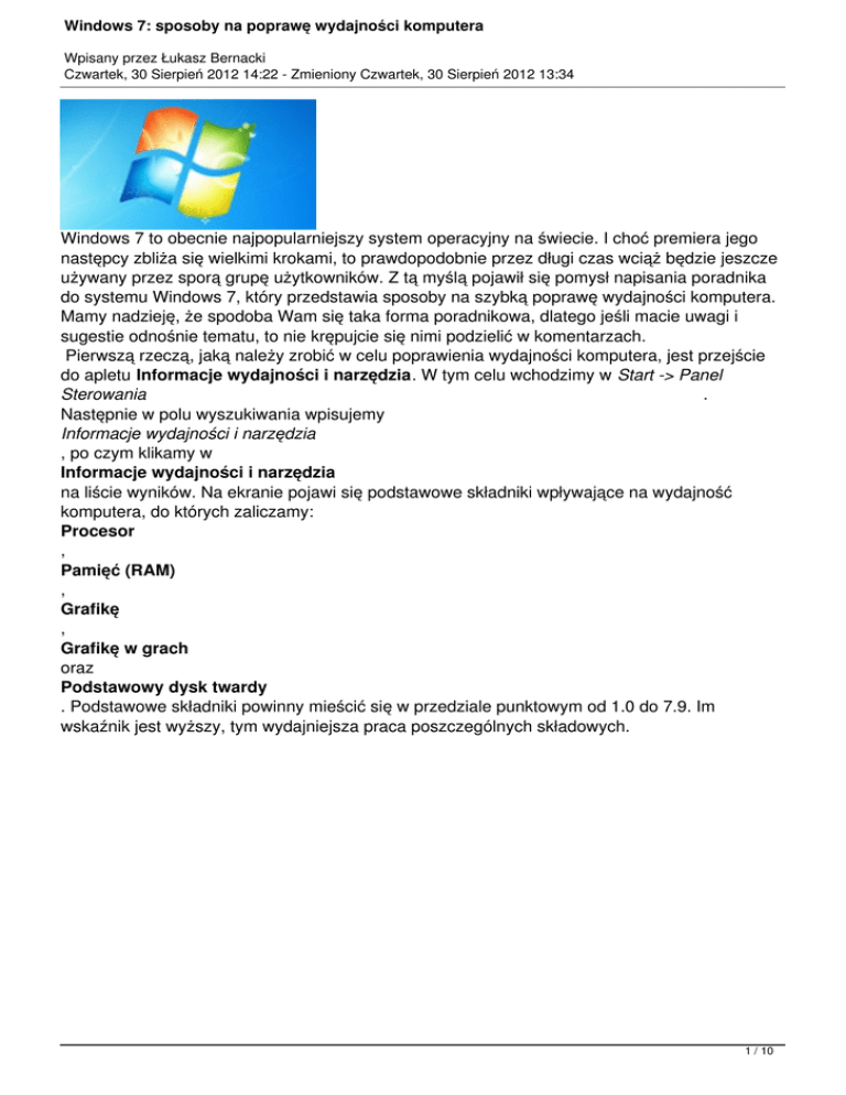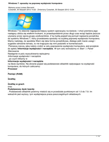 Windows 7: sposoby na poprawę wydajności komputera Wpisany przez Łukasz Bernacki Czwartek, 30 Sierpień 2012 14:22 - Zmieniony Czwartek, 30 Sierpień 2012 13:34 Windows 7 to obecnie najpopularniejszy system operacyjny na świecie. I choć premiera jego następcy zbliża się wielkimi krokami, to prawdopodobnie przez długi czas wciąż będzie jeszcze używany przez sporą grupę użytkowników. Z tą myślą pojawił się pomysł napisania poradnika do systemu Windows 7, który przedstawia sposoby na szybką poprawę wydajności komputera. Mamy nadzieję, że spodoba Wam się taka forma poradnikowa, dlatego jeśli macie uwagi i sugestie odnośnie tematu, to nie krępujcie się nimi podzielić w komentarzach. Pierwszą rzeczą, jaką należy zrobić w celu poprawienia wydajności komputera, jest przejście do apletu Informacje wydajności i narzędzia. W tym celu wchodzimy w Start -> Panel Sterowania . Następnie w polu wyszukiwania wpisujemy Informacje wydajności i narzędzia , po czym klikamy w Informacje wydajności i narzędzia na liście wyników. Na ekranie pojawi się podstawowe składniki wpływające na wydajność komputera, do których zaliczamy: Procesor , Pamięć (RAM) , Grafikę , Grafikę w grach oraz Podstawowy dysk twardy . Podstawowe składniki powinny mieścić się w przedziale punktowym od 1.0 do 7.9. Im wskaźnik jest wyższy, tym wydajniejsza praca poszczególnych składowych. 1 / 10 Windows 7: sposoby na poprawę wydajności komputera Wpisany przez Łukasz Bernacki Czwartek, 30 Sierpień 2012 14:22 - Zmieniony Czwartek, 30 Sierpień 2012 13:34 sprzętowych. (GB) 5,9. skutecznej Trzeba Na pamięci pasku jednak poprawy RAM, Jeśli po pamiętać, lewej komputer wynik wydajności. stronie że cząstkowy jest maksymalny znajduje W wyposażony kolejności pamięci sięwynik ponadto RAM mamy: w 64-bitowy czątkowy dla kilka tego opcji, zależny procesor komputera których jest (CPU) od zmiana wyniesie parametrów i dodysku przyczyni 4 maksymalnie gigabajtów się do opcje indeksowania, Dopasuj ustawienia zasilania, Dopasuj Otwórz efekty oczyszczanie wizualne, Dopasuj Narzędzia zaawansowane .oraz Dopasuj efekty wizualne 2 / 10 Windows 7: sposoby na poprawę wydajności komputera Wpisany przez Łukasz Bernacki Czwartek, 30 Sierpień 2012 14:22 - Zmieniony Czwartek, 30 Sierpień 2012 13:34 Ta część dzieli się na 3 podgrupy. Pierwsza znanich to Efekty Wizualne. odznaczenie dopasowaniem wydajności), możemy wybranych (optymalne także opcji. skorzystać W zakładce zustawienia indywidualnych najlepszego ustawień wyglądu poprzez Poza lub zaznaczenie najlepszej standardowym lub Zaawansowane możemy Po wszystkich ilość kliknięciu orazustalić Zalecane, dysków, na Planowanie Zmień agdyż przede warto wustawienia, każdym użycia zwrócić wszystkim procesora, przypadku uwagę na Dopuszczalne awartości Całkowity także poniżej te rozmiar minimum, będą zarządzać różne. plików Aktualnie stronicowania pamięcią przydzieloną wirtualną. dla 3 / 10 Windows 7: sposoby na poprawę wydajności komputera Wpisany przez Łukasz Bernacki Czwartek, 30 Sierpień 2012 14:22 - Zmieniony Czwartek, 30 Sierpień 2012 13:34 Ostatnia zakładka tomusimy Zapobieganie wykonywaniu danych wszystkie (DEP). ustawiona jednak wybierając na z zmiany listy Włącz indywidualnie tych, funkcję które DEP nie dopasować uwzględniać tylko tęistotnych funkcję, (opcja dodając programów i usług Domyślnie poniżej systemu i powinna ewentualnie Windows, być Dodaj ). Wszystkie zatwierdzić przyciskiem ,Zastosuj zaś w można każdej chwili możemy wrócić dodla ustawień domyślnych. 4 / 10 Windows 7: sposoby na poprawę wydajności komputera Wpisany przez Łukasz Bernacki Czwartek, 30 Sierpień 2012 14:22 - Zmieniony Czwartek, 30 Sierpień 2012 13:34 Dopasuj indeksowania funkcji zoptymalizować najczęściej komputera duży doprowadzić Funkcja indeks wskazane taopcje w używanych służy lub do celu uwzględnienie znacznego tę do jest szybszego funkcję, ustawienia kolejno: plików wskazane spowolnienia wyszukiwania, lub lokalizacji szybkiego folderów. jest plików wyszukiwania. ograniczenie wyszukiwania Warto gdyż systemowych efekt pamiętać, będzie się W plików do celu żeustawienia (np. odwrotny na nie optymalnego folder komputerze. należy od Program wyszukiwania indeksować zamierzonego. wykorzystania Aby Files) całego może Zbyt tej Dopasuj Opcje Indeksowania -> Zaawansowane. wybrać przechodząc lokalizację zakładki indeksowania poniżej wybierając odpowiednie miejsce na dysku, Teraz a ponadto możemy plików ,Typy zaznaczyć odznaczyć interesujące nas rodzaje plików. 5 / 10 Windows 7: sposoby na poprawę wydajności komputera Wpisany przez Łukasz Bernacki Czwartek, 30 Sierpień 2012 14:22 - Zmieniony Czwartek, 30 Sierpień 2012 13:34 Dopasuj ustawienia zewnętrzny). określać ilość zrównoważyć energii, jasność Po ekran, zintegrowanych odłączenie W sekcji drugie energii gdyż to ekranu, będą tej warto warto innych może zużywanej możemy Często wymienione sposób urządzeń gdyż maksymalnie także to nieużywanych znacząco ozasilania/plan zmienić wyświetlacz zużywania zastosować tym przez bezprzewodowych, składowe. zapominamy, komputer, rozmaite skrócić zaoszczędzić urządzeń energii może sięzasilania Jeśli czas, do ustawienia zużywać zmaksymalizować przez akilku zależy urządzenia podłączanych poenergię. jeśli którym wskazówek. komputer. nam więcej ich dla Po aktualnie sprzętu system przede teenergii również trzecie np. Możemy wydajność Popoprzez Windows wszystkim i pierwsze ustawień nie niż wskazane dodatkowo tutaj używamy, procesor USB komputera przyciemnia zarówno warto na systemowych, jest (pendrive, oszczędzaniu czy pobierają azmniejszyć odłączenie także dysk zmniejszyć lubi wyłącza dysk twardy. energię. które 6 / 10 Windows 7: sposoby na poprawę wydajności komputera Wpisany przez Łukasz