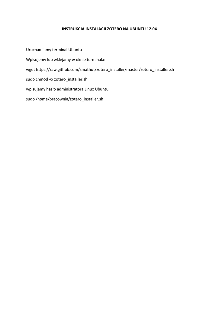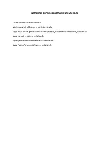 INSTRUKCJA INSTALACJI ZOTERO NA UBUNTU 12.04 Uruchamiamy terminal Ubuntu Wpisujemy lub wklejamy w oknie terminala: wget https://raw.github.com/smathot/zotero_installer/master/zotero_installer.sh sudo chmod +x zotero_installer.sh wpisujemy hasło administratora Linux Ubuntu sudo /home/pracownia/zotero_installer.sh