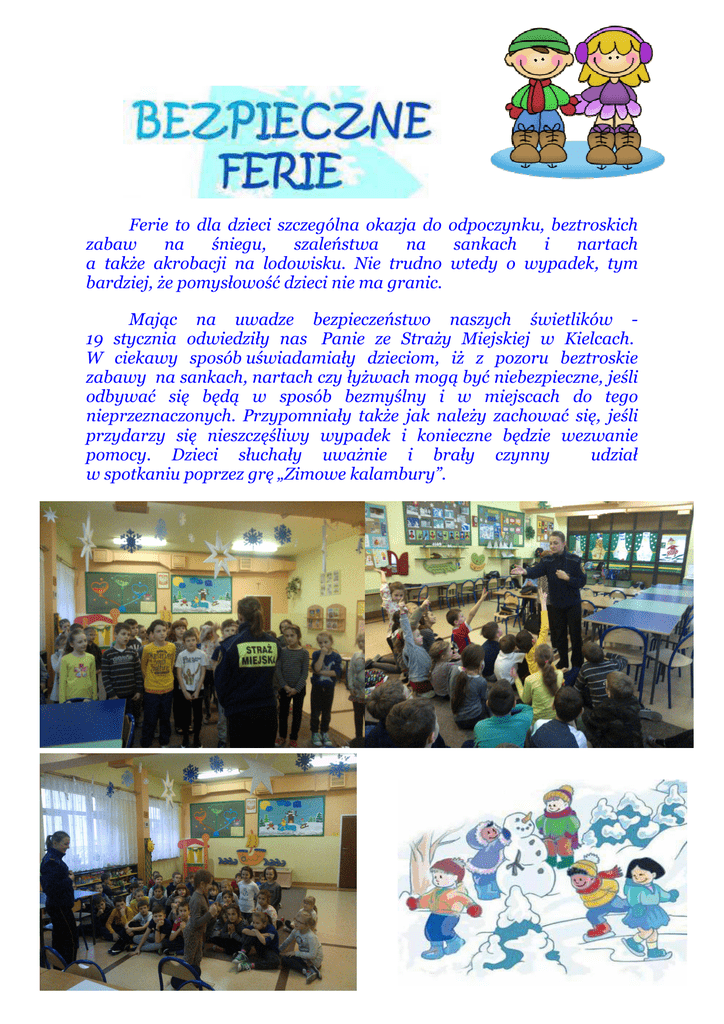 Ferie to dla dzieci szczególna okazja do odpoczynku, beztroskich zabaw na śniegu, szaleństwa na sankach i nartach a także akrobacji na lodowisku. Nie trudno wtedy o wypadek, tym bardziej, że pomysłowość dzieci nie ma granic. Mając na uwadze bezpieczeństwo naszych świetlików 19 stycznia odwiedziły nas Panie ze Straży Miejskiej w Kielcach. W ciekawy sposób uświadamiały dzieciom, iż z pozoru beztroskie zabawy na sankach, nartach czy łyżwach mogą być niebezpieczne, jeśli odbywać się będą w sposób bezmyślny i w miejscach do tego nieprzeznaczonych. Przypomniały także jak należy zachować się, jeśli przydarzy się nieszczęśliwy wypadek i konieczne będzie wezwanie pomocy. Dzieci słuchały uważnie i brały czynny udział w spotkaniu poprzez grę „Zimowe kalambury”.