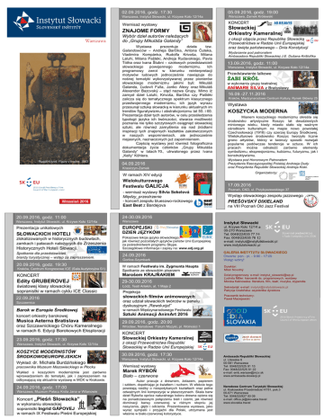 02.09.2016, godz. 17:30 Warszawa, Instytut Słowacki, ul. Krzywe Koło 12/14a ZNAJOME FORMY Wybór dzieł autorów należących do „Grupy Mikuláša Galandy” Wystawa prezentuje dzieła tzw. Galandowców – Andreja Barčíka, Antona Čuteka, Vladimíra Kompánka, Rudolfa Krivoša, Milana Laluhi, Milana Paštéki, Andreja Rudavskiego, Pavla Tótha oraz Ivana Štubni – czołowych przedstawicieli słowackiego powojennego modernizmu. Ich programowy zwrot w kierunku reinterpretacji motywów ludowych jednocześnie nawiązuje do nośnej tematyki wykorzystywanej przez pionierów słowackiego modernizmu jakimi byli: Mikuláš Galanda, Ľudovít Fulla, Janko Alexy oraz Mikuláš Alexander Bazovský – stąd nazwa Grupy. Mimo iż zamysł dzieł Laluhi, Krivoša, Barčíka czy Paštéki zalicza się do tematycznego spektrum klasycznego przedwojennego modernizmu, ich język wyrazu przesunął sztukę słowacką w kierunku aktualnych im trendów figuratywizmu i abstrakcjonizmu lat 50. i 60. Prezentacja dzieł tych autorów, w celu prześledzenia typologii języka ich twórczości, stwarza możliwość poznania nie tylko szczytowych osiągnięć słowackiej sztuki, ale również zamyślenia się nad źródłami inspiracji tych znajomych kształtów zakotwiczonych w naszych wspomnieniach, ale jednocześnie niejasnych, naznaczonych już zapomnieniem. Częścią wystawy jest również fotograficzna dokumentacja życia członków „Grupy Mikuláša Galandy” w latach 70., utrwalonego przez Ivana „Kelly“ Köhlera. Rudolf Krivoš, Figúry v krajine, 1963 Warszawa, Zamek Królewski KONCERT Wernisaż wystawy Warszawa 05.09.2016, godz. 19:00 Warszawa, Biblioteka Publiczna Dzielnicy Ochota, ul. Grójecka 109 Słowackiej Orkiestry Kameralnej z okazji objęcia przez Republikę Słowacką Przewodnictwa w Radzie Unii Europejskiej oraz święta państwowego – Dnia Konstytucji Wydarzenie pod patronatem Ambasadora Republiki Słowackiej J.E. Dušana Krištofíka 13.09.2016, godz. 11:00 Warszawa, Instytut Słowacki, ul. Krzywe Koło 12/14a Przedstawienie lalkowe ŻABI KRÓL w wykonaniu grupy teatralnej ANIMARE SILVA z Bratysławy 16.09.-27.11.2016 Kraków, Międzynarodowe Centrum Kultury, Rynek Główny 25 Wystawa KOSZYCKA MODERNA Mianem koszyckiego modernizmu określa się środowisko artystyczne Koszyc lat dwudziestych minionego wieku, kiedy miasto stało się ważnym ośrodkiem kulturalnym na mapie nowo powstałej Czechosłowacji (1918) czy szerzej Europy Środkowej. Wielokulturowe środowisko Koszyc tworzyło liczne grono artystów, którzy w twórczy sposób rozwijali popularne podówczas tendencje w sztuce. W ich pracach można odnaleźć zarówno elementy symbolizmu, ekspresjonizmu, kubizmu, futuryzmu, jak i konstruktywizmu. Wystawa pod Honorowym Patronatem Prezydenta Rzeczypospolitej Polskiej Andrzeja Dudy oraz Prezydenta Republiki Słowackiej Andreja Kiski. 04.09.2016 Krasiczyn-Zamek Organizatorzy: W ramach XIV edycji Wielokulturowego Festiwalu GALICJA Wrzesień 2016 - wernisaż wystawy Silvia Sekelová Między_przestrzenie - koncert zespołu bluesowo-rockowego East Beat z Bardejova 20.09.2016, godz. 11:00 24-30.09.2016 Warszawa, Ochota, Grójecka 68 Warszawa,Biblioteka Instytut Publiczna Słowacki,Dzielnicy ul. Krzywe Kołoul.12/14a Warszawa Prezentacja unikatowych EUROPEJSKI DZIEŃ JĘZYKÓW SŁOWACKICH HOTELI zlokalizowanych w historycznych budowlach, zamkach i pałacach należących do Zrzeszenia Historycznych Hoteli Słowacji. www.filmdependent.pl Pokazowe lekcje języka słowackiego, jak również pozostałych języków państw Unii Europejskiej za pośrednictwem programu Skype. Szczegółowe informacje i zapisy na: www.edj.org.pl 17.09.2016 Poznań, CKD, ul. Przybyszewskiego 37 Występ słowackiego zespołu jazzowego PREŠOVSKÝ DIXIELAND na VIII Poznań Old Jazz Festival Instytut Słowacki ul. Krzywe Koło 12/14 a 00-270 Warszawa Tel: 0048/22/635 77 74 Fax: 0048/22/635 76 12 e-mail: [email protected] www.instytutslowacki.pl Gorlice-Szymbark GALERIA INSTYTUTU SŁOWACKIEGO Otwarta: pon - pt. - 9:00 - 17:00 Wstęp wolny! Kraków, Centrum Kongresowe ICE (Sala Audytoryjna S1) W ramach Festiwalu im. Zygmunta Haupta Spotkanie ze słowackim pisarzem Dyrektor: Milan Novotný KONCERT Marošem KRAJŇAKIEM Edity GRUBEROVEJ 29-30.09.2016 Dział programowy: e-mail: [email protected] Ľudmila Miller: kierownik ds. programowych, wystawy Monika Kalinowska: literatura, film, teatr, muzyka, stypendia światowej klasy słowackiej sopranistki w ramach cyklu ICE Classic Łódź, Teatr Arlekin, al. 1 Maja 2 22.09.2016 słowackich filmów animowanych Spotkanie dla przedstawicieli branży turystycznej – wstęp za zaproszeniem. 20.09.2016, godz. 19:30 24.09.2016 Projekcja Szczawnica oraz udział słowackich twórców w panelu dyskusyjnym „Rewolucje!” Barok w Europie Środkowej w ramach Międzynarodowego Festiwalu koncert orkiestry barokowej Sztuki Animacji AnimArt 2016 Musica Aeterna Bratislava 29.09.2016, godz. 20:00 oraz Szczawnickiego Chóru Kameralnego w ramach 6. Edycji Barokowych Eksploracji 23.09.2016, godz. 17:30 Warszawa, Instytut Słowacki, ul. Krzywe Koło 12/14a KOSZYCE MODERNISTÓW ŚRODKOWOEUROPEJSKICH Wykład: dr. Michała Burdzińskiego pracownika Muzeum Mazowieckiego w Płocku Wykład o koszyckim modernizmie jest zarówno wprowadzeniem do tematyki, jak i zaproszeniem na odbywającą się aktualnie wystawę w MCK w Krakowie. 24.09.2016, godz. 17:00 Warszawa, Muzeum Pałacu Króla Jana w Wilanowie Koncert „Pieśń Słowacka” w wykonaniu słowackiej sopranistki Ingrid GÁPOVEJ w ramach IX Festiwalu Pieśni Europejskiej Sekretariat: e-mail: [email protected] Patrycja Grabińska: asystentka dyrektora Pracownik techniczny: Paweł Maciejewski Wrocław, Narodowe Forum Muzyki, pl. Wolności 1 KONCERT Słowackiej Orkiestry Kameralnej z okazji Przewodnictwa Republiki Słowackiej w Radzie Unii Europejskiej 30.09.2016, godz. 17:30 Warszawa, Instytut Słowacki, ul. Krzywe Koło 12/14a Wernisaż wystawy