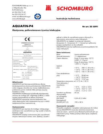 SCHOMBURG Polska sp. z o. o. ul. Sklęczkowska 18a PL-99-300 Kutno tel. 024 254 73 42 fax 024 253 64 27 e-mail: [email protected] www.schomburg.pl Instrukcja techniczna ASOCRET-P/HB AQUAFIN-P4 Nr art. Nr art. 20Nr 5091 5515 art. Mineralna warstwa Elastyczna, poliuretanowa sczepnażywica iniekcyjna SCHOMBURG GmbH & Co. KG Aquafinstr. 2-8 D-32760 Detmold Niemcy 13 205091 PN-EN 1504-5 AQUAFIN-P4 Przeznaczony jest do trwałego i elastycznego zamknięcia oraz uszczelnienia rys, fug i pustek w betonie. U(D1) W(1) (1/2) (6/40) ≥ 0,1 N/mm2 Przyczepność i zdolność do wydłużenia : ≥ 10% Wodoszczelność: D1 Temperatura zeszklenia: -25oC Iniekowalność w suchy materiał: Klasa iniekowalności 0,1 przy 6o C, 21o C i 30o C Iniekowalność w wilgotny materiał: Klasa iniekowalności 0,1 przy 6o C, 21o C i 30o C Lepkość: Tmin: 6°C 288 mPa*s Tnorm: 21°C 148 mPa*s Tmax: 40°C 95 mPa*s Czas urabialności : T: 5°C > 40 min T: 18°C > 30 min Właściwości: AQUAFIN-P4 jest bezrozpuszczalnikową, płynną, dwukomponentową żywicą poliuretanową. AQUAFIN-P4 wolno reagując utwardza się i tworzy miękkoelastyczny, pozbawiony porów materiał, lekko pieniący się przy kontakcie z wodą. AQUAFIN-P4 charakteryzuje się doskonałą przyczepnością, zarówno do suchego jak i wilgotnego podłoża, a także wysoką wytrzymałością na dalsze rozrywanie. AQUAFIN-P4 wytrzymuje zimowe temperatury bez utraty elastyczności oraz rozszerzanie się rysy w niskich temperaturach bez rozerwania się Zastosowanie: AQUAFIN-P4 jest używany do trwałego i elastycznego zamknięcia oraz uszczelnienia rys, fug i pustek w betonie, kamieniu i cegle. AQUAFIN-P4 znajduje zastosowanie jako uszczelnienie stropów, betonowych wanien, ścian, dylatacji, szczelin i pęknięć a także do uszczelniania przerw roboczych w betonowaniu, przy pomocy węży iniekcyjnych. AQUAFIN-P4, ze względu na proporcje mieszania (komponent. A : Komponent. B = 1:1)może być aplikowany pompą z podajnikiem na dwa składniki. AQUAFIN-P4 może być aplikowany za pomocą pakerów lub węży iniekcyjnych. Dane techniczne: Baza: żywica poliuretanowa Stosunek mieszania: 1:1 objętościowo Ciężar właściwy: Komp. A, przy temp. +25°C: 0,985 +/- 15 g/ml Komp. B, przy temp. +25°C: 1,092 +/- 15 g/ml Lepkość: przy: + 6°C: 290 +/- 50 m Pa s + 15°C: 170 +/- 40 m Pa s + 25°C: 150 +/- 30 m Pa s Czas obrabialności: przy: + 5°C: 30-40 min + 18°C: 25-35 min + 23°C: 17-27 min Temperatura stosowania: od + 5°C do + 30°C Czas żelowania / twardnienia: przy: + 6°C: 15,0 +/- 2,0 h + 15°C: 14,5 +/- 1,5 h + 25°C: 11,5 +/- 1,5 h Twardość wg Shoreía: 55 ±3 Wytrzymałość na rozciąganie EN1504-5: 0,58 ±0,12 MPa Rozciągliwość EN ISO 527-1/2: 192 ± 38 % Czyszczenie narzędzi: Wszystkie urządzenia i narzędzia wykorzystywane do iniekcji żywicą AQUAFIN-P4 muszą być starannie oczyszczone zaraz po użyciu, zarówno przy dłuższych przerwach jak i po zakończeniu pracy. Należy przemyć także dyszę urządzenia iniekcyjnego. AQUAFIN®®-EMB -P4 ASODUR Nie można dopuścić do zaschnięcia resztek materiału wewnątrz dysz, węży i zbiorników urządzenia iniekcyjnego. Rozpuszczalnik użyty do czyszczenia powinien mieć punkt zapłonu powyżej +21°C. AQUAFIN-P4 dostarczany jest w opakowaniach: 2,10 kg (1,00 kg Komp. A i 1,10 kg Komp B) 10,5 kg (5,00 kg Komp. A i 5,50 kg Komp B) Komponenty A i B są dostarczane w proporcjach gotowych do mieszania. Składowanie: W zamkniętym orginalnie opakowaniu, w chłodnym i suchym pomieszczeniu przez okres 24 miesięcy w temperaturze między +10°C i 30°C. Magazynować zgodnie z zasadami obowiązującymi dla materiałów niebezpiecznych dla wód gruntowych. Podłoża: Podłoża powinny spełniać następujące wymagania: - Klasa betonu: min. C20/25 - Wytrzym. na ściskanie jastrychu: min. CT-C25-F4 - Wytrzym. na ściskanie tynku: min. 10MPa - Wiek: min 28 dni - Wytrzym. na rozerwanie: min 1,5 MPa Sposób stosowania: Komponent A i komponent B są dostarczane w odpowiednio dobranych porcjach i przygotowane do zmieszania ze sobą. Komponent B jest dodawany do komponentu A. Należy uważac aby Komponent B (utwardzacz) dokładnie wypłynął z opakowania. Mieszanie składników należy przeprowadzić odpowiednim sprzętem (np. wiertarką z mieszadłem) z prędkością ok. 300 obr/min. Ważne jest, aby materiał wymieszać dokładnie przy bokach i na spodzie pojemnika. Mieszanie prowadzić w sposób ciągły, aż do uzyskania jednorodnej, homogenicznej masy. Narzędzia: Pompa iniekcyjna ręczna, nożna, mechaniczna, jedno lub dwu komponentowa (zapewniająca dokładne dozowanie obu komponentów). Aplikacja / zużycie: Wymieszana żywica iniekcyjna jest wprowadzana z reguły przez otwory i pakery do uszczelnianej rysy, aż do wypłynięcia jej z otworów kontrolnych. Przykładowo: 1. W istniejących rysach (szerokość rozwarcia ok. 0,2 mm) wykonać otwory w odstępie ok. 20-30 cm. 2. Otwory przedmuchać czystym sprężonym powietrzem. 3. Obsadzić pakery 4. Zamocowane pakery i strefę zarysowania doszczelnić np. przy pomocy żywicy ASODUR-EK , szerokość pasa ok. 15cm zużycie ok.300 g/m 5. Po stwardnieniu uszczelnienia wtłoczyć dokładnie wymieszany AQUAFIN-P4. Rysy pionowe: wtłaczać zaczynając od dołu. Rysy poziome: wtłaczać zaczynając od lewej strony. Zużycie ok. 1000 g/l wypełnionej pustki. 6. Po stwardnieniu żywicy, należy usunąć pakery i wypełnić pustki po nich zaprawą np. SOLOCRET-15. Oddziaływanie psychofizyczne i BHP: AQUAFIN-P4 po stwardnieniu jest nie szkodliwy dla zdrowia. W stanie płynnym jest szkodliwy: Symbol Xn. Podczas stosowania należy przestrzegać odpowiednich przepisów BHP, oraz przestrzegać zaleceń podanych na opakowaniu Ważne wskazówki: - Powierzchnie nie przeznaczone do aplikacji AQUAFIN-P4 należy chronić przez przekrycie - Przed zastosowaniem materiału, które nie jest opisane w tej karcie technicznej, należy skontaktować się z działem doradztwa t