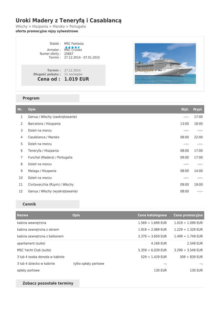 Uroki Madery z Teneryfą i Casablancą Włochy > Hiszpania > Maroko > Portugalia oferta promocyjna rejsy sylwestrowe Statek : Armator : Numer oferty : Termin : Termin : Długość pobytu : MSC Fantasia MSC Cruises 25667 27.12.2014 - 07.01.2015 27.12.2014 11 noclegów Cena od : 1.019 EUR Program Nr. Opis Wpł. Wypł. --:-- 17:00 13:00 18:00 --:-- --:-- 08:00 22:00 --:-- --:-- 1 Genua / Włochy (zaokrętowanie) 2 Barcelona / Hiszpania 3 Dzień na morzu 4 Casablanca / Maroko 5 Dzień na morzu 6 Teneryfa / Hiszpania 08:00 17:00 7 Funchal (Madera) / Portugalia 09:00 17:00 8 Dzień na morzu --:-- --:-- 9 Malaga / Hiszpania 08:00 14:00 --:-- --:-- 10 Dzień na morzu 11 Civitavecchia (Rzym) / Włochy 09:00 19:00 12 Genua / Włochy (wyokrętowanie) 08:00 --:-- Cennik Nazwa Opis Cena katalogowa Cena promocyjna kabina wewnętrzna 1.569 ÷ 1.699 EUR 1.019 ÷ 1.099 EUR kabina zewnętrzna z oknem 1.919 ÷ 2.089 EUR 1.229 ÷ 1.329 EUR kabina zewnętrzna z balkonem 2.379 ÷ 3.659 EUR 1.499 ÷ 1.749 EUR 4.169 EUR 2.549 EUR 5.359 ÷ 6.039 EUR 3.299 ÷ 3.549 EUR 529 ÷ 1.429 EUR 309 ÷ 839 EUR --; --; 130 EUR 130 EUR apartament (suite) MSC Yacht Club (suite) 3 lub 4 osoba dorosła w kabinie 3 lub 4 dziecko w kabinie opłaty portowe Zobacz pozostałe terminy tylko opłaty portowe 05.12.2014 27.12.2014 07.01.2015 29.01.2015 09.02.2015 03.03.2015 06.12.2015 28.12.2015 19.01.2016 10.02.2016 03.03.2016 05.04.2016 14.03.2015 08.04.2015 Informacje dodatkowe cena obejmuje: zakwaterowanie w kabinie wybranej kategorii (11 noclegów); serwis bagażowy i kabinowy; wyżywienie – 3 główne posiłki, przekąski między posiłkami, bufet lub przekąski o północy; korzystanie z basenu i innych urządzeń sportowo-rekreacyjnych; udział we wszystkich imprezach organizowanych na statku. cena nie obejmuje: opłat portowych; kosztów dojazdu do portu; ewentualnych noclegów w hotelu przed/po rejsie i transferów (na zapytanie); wycieczek fakultatywnych; korzystania z punktów usługowych (pralnia, fotograf, salon piękności i odnowy biologicznej, internet); napojów do obiadów i kolacji, drinków oraz napiwków obowiązkowych dla obsługi statku (ok. 8,5€/dzień/osobę dorosłą; 4,25€/dzień/dziecko); ubezpieczenia KL, NW i bagażu. uwagi: kabiny 3/4 osobowe nie są dostępne we wszystkich kategoriach, a ich liczba jest ograniczona – sprzedaż tylko po potwierdzeniu; ceny wycieczek fakultatywnych, propozycje dojazdu do portu, hoteli przed/po rejsie na zapytanie. ALL INCLUSIVE (opcja) istnieje możliwość wykupienia pakietu ALL INCLUSIVE obejmującego wybrane napoje alkoholowe i bezalkoholowe dostępne bez ograniczeń we wszystkich barach. Cena pakietu 26€/dzień/ osoba dorosła i 12€/dzień/dziecko. Warunkiem skorzystania z pakietu all inclusive jest wykupienie pakietu przez wszystkich pasażerów podróżujących w jednej kabinie na czas całego rejsu.