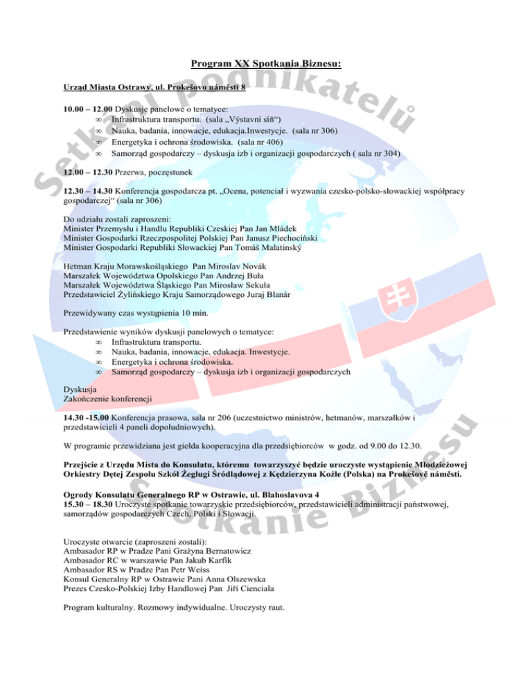 Program XX Spotkania Biznesu: Urząd Miasta Ostrawy, ul. Prokešovo náměstí 8 10.00 – 12.00 Dyskusje panelowe o tematyce: • Infrastruktura transportu. (sala „Výstavní síň“) • Nauka, badania, innowacje, edukacja.Inwestycje. (sala nr 306) • Energetyka i ochrona środowiska. (sala nr 406) • Samorząd gospodarczy – dyskusja izb i organizacji gospodarczych ( sala nr 304) 12.00 – 12.30 Przerwa, poczęstunek 12.30 – 14.30 Konferencja gospodarcza pt. „Ocena, potenciał i wyzwania czesko-polsko-słowackiej współpracy gospodarczej“ (sala nr 306) Do udziału zostali zaproszeni: Minister Przemysłu i Handlu Republiki Czeskiej Pan Jan Mládek Minister Gospodarki Rzeczpospolitej Polskiej Pan Janusz Piechociński Minister Gospodarki Republiki Słowackiej Pan Tomáš Malatinský Hetman Kraju Morawskośląskiego Pan Miroslav Novák Marszałek Województwa Opolskiego Pan Andrzej Buła Marszałek Województwa Śląskiego Pan Mirosław Sekuła Przedstawiciel Żylińskiego Kraju Samorządowego Juraj Blanár Przewidywany czas wystąpienia 10 min. Przedstawienie wyników dyskusji panelowych o tematyce: • Infrastruktura transportu. • Nauka, badania, innowacje, edukacja. Inwestycje. • Energetyka i ochrona środowiska. • Samorząd gospodarczy – dyskusja izb i organizacji gospodarczych Dyskusja Zakończenie konferencji 14.30 -15.00 Konferencja prasowa, sala nr 206 (uczestnictwo ministrów, hetmanów, marszałków i przedstawicieli 4 paneli dopołudniowych). W programie przewidziana jest giełda kooperacyjna dla przedsiębiorców w godz. od 9.00 do 12.30. Przejście z Urzędu Mista do Konsulatu, któremu towarzyszyć będzie uroczyste wystąpienie Młodzieżowej Orkiestry Dętej Zespołu Szkół Żeglugi Śródlądowej z Kędzierzyna Koźle (Polska) na Prokešově náměstí. Ogrody Konsulatu Generalnego RP w Ostrawie, ul. Blahoslavova 4 15.30 – 18.30 Uroczyste spotkanie towarzyskie przedsiębiorców, przedstawicieli administracji państwowej, samorządów gospodarczych Czech, Polski i Słowacji. Uroczyste otwarcie (zaproszeni zostali): Ambasador RP w Pradze Pani Grażyna Bernatowicz Ambasador RC w warszawie Pan Jakub Karfík Ambasador RS w Pradze Pan Petr Weiss Konsul Generalny RP w Ostrawie Pani Anna Olszewska Prezes Czesko-Polskiej Izby Handlowej Pan Jiří Cienciala Program kulturalny. Rozmowy indywidualne. Uroczysty raut.