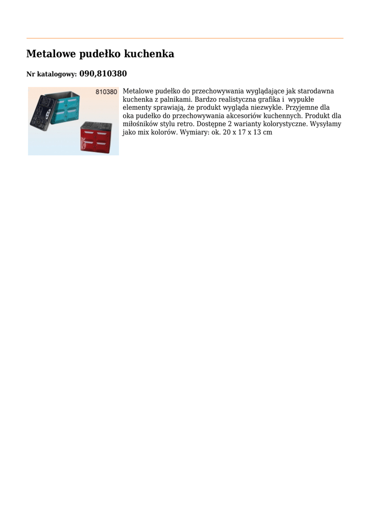 Metalowe pudełko kuchenka Nr katalogowy: 090,810380 Metalowe pudełko do przechowywania wyglądające jak starodawna kuchenka z palnikami. Bardzo realistyczna grafika i wypukłe elementy sprawiają, że produkt wygląda niezwykle. Przyjemne dla oka pudełko do przechowywania akcesoriów kuchennych. Produkt dla miłośników stylu retro. Dostępne 2 warianty kolorystyczne. Wysyłamy jako mix kolorów. Wymiary: ok. 20 x 17 x 13 cm
