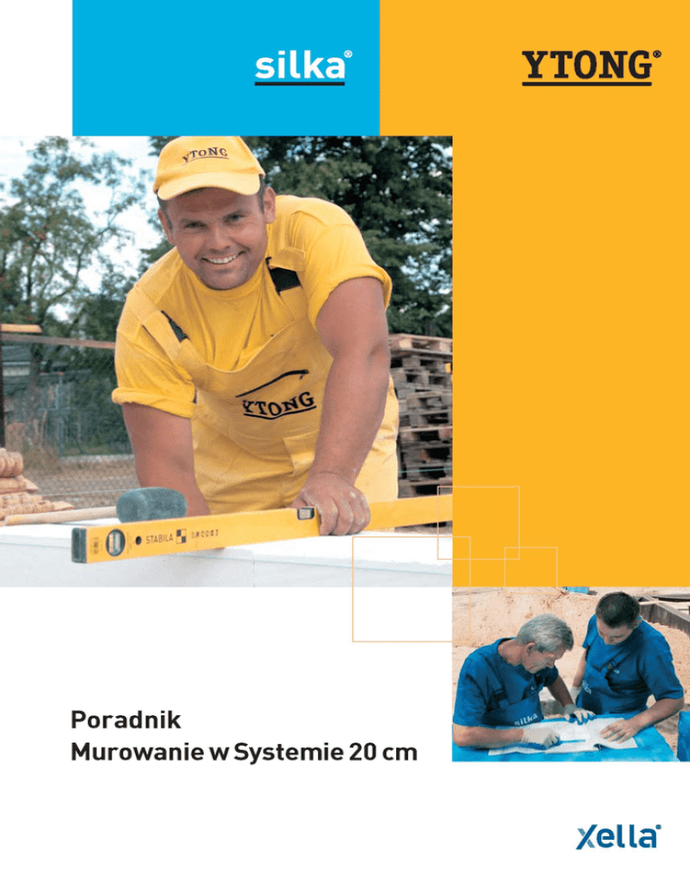 silka YTONG* Poradnik Murowanie w Systemie 20 cm Xella' Copyright © by Xella Polska sp. z o.o. Warszawa 2008 Znaki SILKA i YTONG są zarejestrowanymi znakami towarowymi. Prawa ochronne na te znaki przysługują Xella Polska Sp. z o.o. z siedzibą w Warszawie. Żadna część tej pracy nie może być powielana i rozpowszechniana bez pisemnej zgody wydawcy. Wstęp Doświadczenie zawodowe naszych pracowników przyczyniło się do powstania nowej technologii konstrukcji ścian zwanej Systemem 20 cm. System 20 cm to połączenie dwóch, doskonale Państwu znanych technologii budowlanych: SILKA i YTONG. Ponieważ każdy z materiałów charakteryzuje się innymi parametrami technicznymi i jednocześnie oba produkty posiadają cechy wspólne, powstała idea optymalizacji parametrów ścian w zależności od ich przeznaczenia, poprzez odpowiedni dobór materiałów SILKA i YTONG. Cechy wspólne umożliwiające współdziałanie systemów SILKA i YTONG to: jednakowa modularna wysokość elementów, dokładność wykonania bloków, naturalne pochodzenie surowców użytych do produkcji, trwałość, doskonała odporność ogniowa, szybkość murowania i przede wszystkim stałość parametrów. Ściany zewnętrzne to przede wszystkim termoizolacja, ściany wewnętrzne to wytrzymałość, izolacja akustyczna i akumulacja cieplna. System 20 cm pozwala rozwiązać te problemy. Jednowarstwowa ściana zewnętrzna z bloczków YTONG gwarantuje komfort cieplny, a ściana wewnętrzna z bloczków SILKA to gwarancja wytrzymałości i bezpieczeństwa. Ten zeszyt, jest praktycznym poradnikiem skierowanym do wykonawców oraz osób prywatnych planujących budowę domu. Znajdziecie w nim Państwo odpowiedzi na pytania, jak i z czego budować oraz szczegółowo opisane i zilustrowa ne etapy budowy domu w Systemie 20 cm. Podpowiadamy na co zwrócić uwagę dokonując wyboru materiałów do budowy ścian, w zależności od ich przeznaczenia. Poza tym uzyskacie informacje o tym, jak korzyści oferowane przez bloki SILKA i YTONG znacznie ułatwią proces wykonawczy. Budowanie w Systemie 20 cm nie zmienia zasad wznoszenia murów lecz przyśpiesza prace budowlane, co w konsekwencji wpływa na zmniejszenie kosztów całej inwestycji. Proponowane w Poradniku rozwiązania systemowe nie tylko pomagają sprawnie zorganizować budowę, ale też wpływają na oszczędność zużywanej energii i materiałów. Komplet narzędzi SILKA i YTONG ułatwia wykonawcom na budowie prowadzenie prac, a co najważniejsze zapewnia poprawne murowanie. Wkrótce przekonają się Państwo sami, że budowa w Systemie 20 cm jest szybka i prosta. Firma Xella, jako jeden z nielicznych producentów materiałów ściennych organizuje regularne, nieodpłatne szkolenia dla wykonawców. Dbamy o to, aby nasze produkty były poprawnie stosowane i aby przyszli mieszkańcy mieli pewność, że dobrze zainwestowali swoje pieniądze. Spis treści Prezentacje Fundamenty, ściany fundamentowe i piwniczne Pierwsza warstwa Docinanie Kolejne warstwy Łączenie ściany zewnętrznej i wewnętrznej nośnej Zbrojenia pod okna Nadproża Ścianki działowe Montaż stropów YTONG Docieplenie wieńca Ściana kolankowa Instalacje Narzędzia murarskie Dane techniczne 4–7 8 10 15 18 23 25 28 32 35 39 41 44 48 53 20 cm zmienia punkt widzenia System białych bloków ścien nych SILKA i YTONG, o jedna kowej wysokości 20 cm, połączonych cienkimi spoinami, wykorzystujący najlepsze cechy Gwarancja najlepszego rozwiązania Tylko w Systemie 20 cm istnie je możliwość optymalizacji pa rametrów ścian w zależności od ich przeznaczenia, poprzez odpowiedni dobór materiałów SILKA i YTONG. Jednowarstwowa ściana ze wnętrzna z bloczków YTONG gwarantuje komfort cieplny, a ściana wewnętrzna z bloków SILKA to gwarancja doskonałej izolacyjności akustycznej, wy trzymałości i bezpieczeństwa. produktów SILKA i YTONG, po zwala stworzyć dom dostoso wany do potrzeb mieszkańców. Gwarancja bezpieczeństwa Tylko bloki o wysokości 20 cm za pewniają pełne bezpieczeństwo w Twoim domu. Zaoszczędzony czas i gwarancja najnowocześniejszych rozwiązań Tylko w Systemie 20 cm 15 0 m 2 ścian powstaje ponad czterokrotnie szybciej niż przy zastosowaniu in nych technologii. Stale wprowadzamy innowacje w naszych produktach. Jako pierw si wprowadziliśmy system pióro-wpust i uchwyty montażowe w blocz kach YTONG i SILKA, jako pierwsi zastosowaliśmy cienką spoinę, ja ko pierwsi pakowaliśmy produkty na palety i zabezpieczaliśmy je fo lią. J ako jed y ni w pro w a dzili ś m y w e wnętrzne kanały elektryczne. Nasz System 20 cm to gwarancja najno wocześniejszych rozwiązań. Unikalny system gotowych ka nałów elektrycznych w blokach SILKA E pozwala na prowadze nie instalacji wewnątrz ścian. Domy zbudowane z naszych bloczków są przyjazne i bez pieczne dla przyszłych miesz kańców. Gwarancja trwałości YTONG to pierwszy markowy ma teriał budowlany na świecie. W tym zakresie mamy największe doświadczenie. YTONG i SILKA dostępne są w ponad 20 krajach, ich niezawodność potwierdzają inwestorzy z całego świata. To produkty stosowane z powodze niem od 80 lat. Ściany piwniczne i fundamentowe z bloków SILKA E-S Pion wentylacyjny z bloków SILKA EW Ściany działowe z bloczków YTONG lub bloków SILKA E Stropy i dachy z płyt stropowych i dachowych YTONG Elementy nadprożowe YTONG Ściany wewnętrzne nośne z bloków SILKA E Ściany zewnętrzne z bloczków YTONG Ściany działowe z bloczków YTONG lub bloków SILKA E Fundamenty, ściany fundamentowe i piwniczne Fundamenty w budynkach zaprojektowanych technologii System 20 cm wykonuje się najczęściej w postaci betonowych ław fundamentowych. Przed przystąpieniem do murowania ścian fundamentowych lub piwnicznych na fundamencie wykonujemy izolację przeciwwilgociową np. z papy. Dzięki temu zapewnimy murom ochronę przed podciąganiem wilgoci. Ściany fundamentowe i piwniczne zaleca się wykonywać z bloków pełnyc