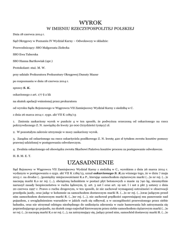 WYROK W IMIENIU RZECZYPOSPOLITEJ POLSKIEJ Dnia 18 czerwca 2014 r. Sąd Okręgowy w Poznaniu IV Wydział Karny – Odwoławczy w składzie: Przewodniczący: SSO Małgorzata Ziołecka SSO Ewa Taberska SSO Hanna Bartkowiak (spr.) Protokolant: staż. M. W. przy udziale Prokuratora Prokuratury Okręgowej Danuty Mazur po rozpoznaniu w dniu 18 czerwca 2014 r. sprawy S. K. oskarżonego z art. 177 § 2 kk na skutek apelacji wniesionej przez prokuratora od wyroku Sądu Rejonowego w Wągrowcu VII Zamiejscowy Wydział Karny z siedzibą w C. z dnia 26 marca 2014 r. sygn. akt VII K 1189/13 1. Zmienia zaskarżony wyrok w punkcie 4 w ten sposób, że podwyższa orzeczoną od oskarżonego na rzecz pokrzywdzonego Z. N. nawiązkę do kwoty 30 000 (trzydzieści tysięcy) zł. 2. W pozostałym zakresie utrzymuje w mocy zaskarżony wyrok. 3. Zasądza od oskarżonego na rzecz oskarżyciela posiłkowego Z. N. kwotę 420 zł tytułem zwrotu kosztów pomocy prawnej udzielonej w postępowaniu odwoławczym. 4. Zwalnia oskarżonego od obowiązku zwrotu Skarbowi Państwa kosztów procesu za postępowanie odwoławcze. H. B. M. E. T. UZASADNIENIE Sąd Rejonowy w Wągrowcu VII Zamiejscowy Wydział Karny z siedzibą w C., wyrokiem z dnia 26 marca 2014 r. wydanym w postępowaniu o sygn. akt VII K 1189/13, uznał oskarżonego S. K.za winnego tego, że w dniu 7 maja 2013 r. na drodze (...)pomiędzy miejscowościami K.a P., kierując samochodem ciężarowym marki (...)o nr rej. (...)z naczepą marki K.o nr rej. (...), obciążoną ładunkiem w postaci płyt betonowych o masie 19 740 kg, nieumyślnie naruszył zasady bezpieczeństwa w ruchu lądowym, tj. art. 3 ust l oraz art. 19 ust. l i ust 2 pkt 3 ustawy z dnia 20 czerwca 1997 r. Prawo o ruchu drogowym, w ten sposób, że nie zachował wymaganej ostrożności w obserwacji przedpola jazdy, oraz jadąc w kolumnie za samochodem dostawczym marki R. (...)o nr rej. (...)oraz jadącym przed nim samochodem dostawczym marki R. (...)nr rej. (...), nie zachował prędkości zapewniającej mu panowanie nad pojazdem, z uwzględnieniem warunków w jakich ruch się odbywał, a w szczególności przewożonego przez siebie ładunku, oraz nie utrzymał odstępu niezbędnego do uniknięcia zderzenia w razie hamowania lub zatrzymania się poprzedzającego go pojazdu, na skutek czego najechał kierowanym przez siebie samochodem ciężarowym marki (...)o nr rej. (...)z naczepą marki K.o nr rej. (...), na zatrzymujący się, jadący przed nim, samochód dostawczy marki R. (...)o nr rej. (...), który następnie na skutek przepchnięcia przez pęd samochodu ciężarowego marki (...)o nr rej. (...)z naczepą marki K.o nr rej. (...), zderzył się ze znajdującym się przed nim samochodem dostawczym marki R. (...)o nr rej. (...), czym nieumyślnie spowodował wypadek, powodując u kierującego samochodem dostawczym marki R. (...)o nr rej. (...)Z. N.obrażenia ciała w postaci stłuczenia płuc, niewydolności oddechowej, złamania kręgosłupa z podwichnięciem C7-T., utrwalonego niedowładu czterokończynowego, wstrząśnienia mózgu, stłuczenia stawu barkowego lewego, które to obrażenia spowodowały u niego ciężkie i trwałe kalectwo w rozumieniu art. 156 § 1 pkt 2 kk, to jest przestępstwa z art. 177 § 2 kk i za to, na podstawie art. 177 § 2 kk, wymierzył mu karę 1 roku i 6 miesięcy pozbawienia wolności. Na podstawie art. 69 § 1 kk i art. 70 § 1 pkt 1 kk wykonanie orzeczonej kary pozbawienia wolności zawiesił oskarżonemu warunkowo na okres lat 4 tytułem próby. Na podstawie natomiast art. 71 § 1 kk wymierzył oskarżonemu 60 stawek grzywny po 15 zł każda, a na podstawie art. 46 § 2 kk orzekł od oskarżonego na rzecz pokrzywdzonego Z. N. nawiązkę w wysokości 7 000 zł. W ostatnim punkcie wyroku, na podstawie art. 627 kpk zasądził od oskarżonego na rzecz Skarbu Państwa zwrot kosztów procesu w kwocie 1 260,17zł i na podstawie art. 1, art. 2 ust. 1 pkt 4 i art. 3 ust. 2 ustawy o opłatach w sprawach karnych wymierzył mu 390 zł opłaty. Wyrok powyższy, w części dotyczącej rozstrzygnięcia o karze zaskarżył na niekorzyść oskarżonego prokurator. Zarzucił temu orzeczeniu rażącą niewspółmierność – łagodność kary grzywny i środka karnego w postaci nawiązki wymierzonych oskarżonemu poprzez niesłuszne orzeczenie wobec oskarżonego na podstawie art. 71 § 1 kk kary grzywny w wysokości 60 stawek dziennych po 15 zł każda stawka oraz orzeczenie na podstawie art. 46 § 2 kk środka karnego w postaci nawiązki na rzecz pokrzywdzonego Z. N. w wysokości 7 000 zł, podczas gdy wysoki stopień społecznej szkodliwości czynu, i wzgląd na cele zapobiegawcze i wychowawcze, jakie kara ma osiągnąć wobec oskarżonego, jak również potrzeby w zakresie kształtowania świadomości prawnej społeczeństwa, przemawiały za orzeczeniem wobec S. K. surowszej kary grzywny i surowszego środka karnego w postaci nawiązki. Mając to na uwadze, apelujący wniósł o zmianę zaskarżonego wyroku i orzeczenie za przypisane oskarżonemu przestępstwo na podstawie art. 71 § l kk kary grzywny w wysokości 60 stawek dziennych po 50 zł każda stawka oraz orzeczenie na podstawie art. 46 § 2 kk środka karnego w postaci nawiązki na rzecz pokrzywdzonego Z. N. w wysokości 30 000 zł. Odpowiedź na apelację złożył obrońca oskarżonego. Wniósł o oddalenie środka odwoławczego i utrzymanie zaskarżonego wyroku w mocy. Sąd Okręgowy zważył, co następuje: Apelacja okazała się w części zasadna i w tym zakresie zasługiwała na uwzględnienie. Ustalenie to wywołało konieczność zmiany zaskarżonego orzeczenia poprzez podwyższenie kwoty nawiązki. Na wstępie podnieść należy, że kontrola instancyjna nie wykazała aby Sąd niższej instancji dopuścił się uchybień w zakresie szerszym, aniżeli wywodził autor środka odwoławczego. Sąd Okręgowy uznał zatem, że nie uzewnętrzniły się okoliczności, które nakazywałyby uchylić bądź zmienić za