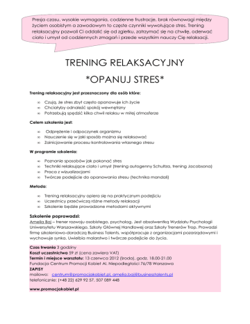 Presja czasu, wysokie wymagania, codzienne frustracje, brak równowagi między życiem osobistym a zawodowym to częste czynniki wywołujące stres. Trening relaksacyjny pozwoli Ci oddalić się od zgiełku, zatrzymać się na chwilę, oderwać ciało i umysł od codziennych zmagań i przede wszystkim nauczy Cię relaksacji. TRENING RELAKSACYJNY *OPANUJ STRES* Trening relaksacyjny jest przeznaczony dla osób które: • • • Czują, że stres zbyt często opanowuje ich życie Chciałyby odnaleźć spokój wewnętrzny Potrzebują spędzić kilka chwil relaksu w miłej atmosferze Celem szkolenia jest: • • • Odprężenie i odpoczynek organizmu Nauczenie się w jaki sposób można się relaksować Zainicjowanie procesu kontrolowania własnego stresu W programie szkolenia: • • • • Poznanie sposobów jak pokonać stres Techniki relaksujące ciało i umysł (trening autogenny Schultza, trening Jacobsona) Praca z wizualizacjami Twórcze podejście do opanowania stresu (technika mandali) Metoda: • • • Trening relaksacyjny opiera się na praktycznym podejściu Uczestnicy przećwiczą różne metody relaksacji Szkolenie będzie prowadzone metodami aktywnymi Szkolenie poprowadzi: Amelia Baj – trener rozwoju osobistego, psycholog. Jest absolwentką Wydziału Psychologii Uniwersytetu Warszawskiego, Szkoły Głównej Handlowej oraz Szkoły Trenerów Trop. Prowadzi firmę szkoleniowo-doradczą Business Talents, współpracuje z organizacjami pozarządowymi i wychowuje synka. Uwielbia malarstwo i twórcze podejście do życia. Czas trwania 3 godziny Koszt uczestnictwa 59 zł (cena zawiera VAT) Termin i miejsce warsztatu: 13 czerwca 2012 (środa), godz. 18.00-21.00 Fundacja Centrum Promocji Kobiet Al. Niepodległości 76/78 Warszawa ZAPISY mailowo: [email protected], [email protected] telefonicznie: (+48 22) 629 92 57, 507 089 448 www.promocjakobiet.pl