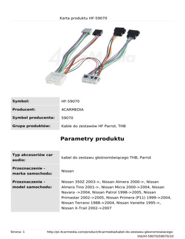 Karta produktu HF-59070 Symbol: HF-59070 Producent: 4CARMEDIA Symbol producenta: 59070 Grupa produktów: Kable do zestawów HF Parrot, THB Parametry produktu Typ akcesoriów car audio: Przeznaczenie marka samochodu: kabel do zestawu głośnomówiącego THB, Parrot Nissan Przeznaczenie - Nissan 350Z 2003->, Nissan Almera 2000->, Nissan model samochodu: Almera Tino 2001->, Nissan Micra 2000->2004, Nissan Navara ->2004, Nissan Patrol 1998->2005, Nissan Primastar 2002->2005, Nissan Primera (P11) 1999->2004, Nissan Terrano 1988->2004, Nissan Vanette 1995->, Nissan X-Trail 2002->2007 Strona: 1 http://pl.4carmedia.com/product/4carmedia/kabel-do-zestawu-glosnomowiacegothb/hf-59070/59070/10 Karta produktu HF-59070 Informacje dodatkowe Masa brutto: Strona: 2 0,098 kg http://pl.4carmedia.com/product/4carmedia/kabel-do-zestawu-glosnomowiacegothb/hf-59070/59070/10