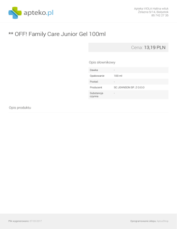 Apteka VIOLA Halina wiluk Żelazna 9/14, Białystok 85 742 27 35 ** OFF! Family Care Junior Gel 100ml Cena: 13,19 PLN Opis słownikowy Dawka - Opakowanie 100 ml Postać - Producent SC JOHNSON SP. Z O.O.O Substancja czynna - Opis produktu Plik wygenerowano: 07-03-2017 Powered by TCPDF (www.tcpdf.org) Oprogramowanie sklepu: AptusShop