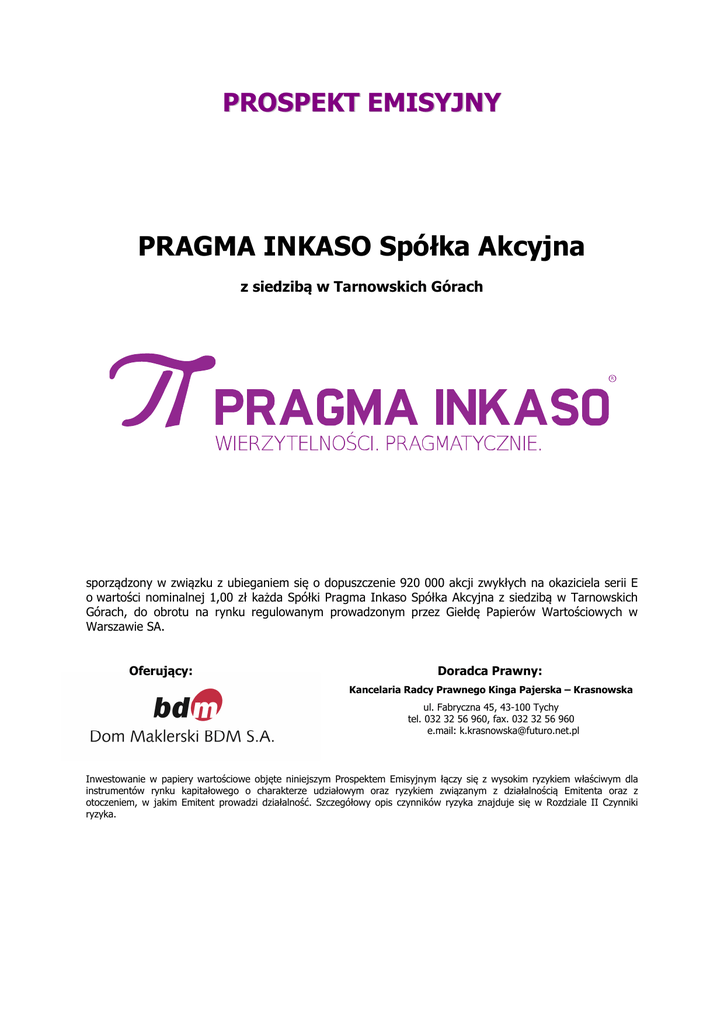 PROSPEKT EMISYJNY PRAGMA INKASO Spółka Akcyjna z siedzibą w Tarnowskich Górach sporządzony w związku z ubieganiem się o dopuszczenie 920 000 akcji zwykłych na okaziciela serii E o wartości nominalnej 1,00 zł każda Spółki Pragma Inkaso Spółka Akcyjna z siedzibą w Tarnowskich Górach, do obrotu na rynku regulowanym prowadzonym przez Giełdę Papierów Wartościowych w Warszawie SA. Oferujący: Doradca Prawny: Kancelaria Radcy Prawnego Kinga Pajerska – Krasnowska ul. Fabryczna 45, 43-100 Tychy tel. 032 32 56 960, fax. 032 32 56 960 e.mail: [email protected] Inwestowanie w papiery wartościowe objęte niniejszym Prospektem Emisyjnym łączy się z wysokim ryzykiem właściwym dla instrumentów rynku kapitałowego o charakterze udziałowym oraz ryzykiem związanym z działalnością Emitenta oraz z otoczeniem, w jakim Emitent prowadzi działalność. Szczegółowy opis czynników ryzyka znajduje się w Rozdziale II Czynniki ryzyka. Niniejszy Prospekt Emisyjny został sporządzony w związku z dopuszczeniem do obrotu na rynku regulowanym na Giełdzie Papierów Wartościowych w Warszawie Akcji serii E Spółki. Niniejszy Prospekt Emisyjny został sporządzony zgodnie z przepisami Rozporządzenia Komisji (WE) nr 809/2004 oraz innymi przepisami regulującymi rynek kapitałowy na terytorium Rzeczypospolitej Polskiej, w szczególności Ustawą o Ofercie Publicznej. Komisja Nadzoru Finansowego zatwierdziła Prospekt Emisyjny w dniu 17 czerwca 2011 roku. Niniejszy Prospekt został sporządzony zgodnie z najlepszą wiedzą i przy dołożeniu należytej staranności, a zawarte w nim informacje są zgodne ze stanem na dzień jego zatwierdzenia. Możliwe jest, że od chwili udostępnienia Prospektu do publicznej wiadomości zajdą zmiany dotyczące sytuacji Emitenta. W takiej sytuacji informacje o wszelkich zdarzeniach lub okolicznościach, które mogłyby w sposób znaczący wpłynąć na ocenę Akcji, zostaną podane do publicznej wiadomości w formie aneksu lub aneksów do niniejszego Prospektu, w trybie Art. 51 ust. 5 Ustawy o Ofercie. Zalecana jest staranna analiza informacji zawartych w Rozdziale II Czynniki ryzyka, niniejszego Prospektu, który zawiera omówienie czynników ryzyka i niepewności związanych z inwestycją w akcje dopuszczane do obrotu na rynku regulowanym. Prospekt emisyjny SPIS TREŚCI CZĘŚĆ I PODSUMOWANIE .................................................................................................................... 6 1. INFORMACJE O OSOBACH ZARZĄDZAJĄCYCH, OSOBACH NADZORUJĄCYCH ORAZ DORADCACH I BIEGŁYCH REWIDENTACH ........................................................................................................................................6 1.1. Organy zarządzające i nadzorujące Emitenta ....................................................................................6 1.2. Podmiot Oferujący..........................................................................................................................6 1.3. Doradca Prawny .............................................................................................................................7 1.4. Biegły Rewident .............................................................................................................................7 2. PODSTAWOWE INFORMACJE O SPÓŁCE .................................................................................................7 2.1. Historia i rozwój Emitenta ...............................................................................................................8 2.2. Ogólny zarys działalności ................................................................................................................9 2.3. Informacje finansowe ................................................................................................................... 10 2.4. Strategia rozwoju ......................................................................................................................... 12 2.5. Kapitał zakładowy ........................................................................................................................ 13 2.6. Środki trwałe ............................................................................................................................... 13 3. CZYNNKI RYZYKA ............................................................................................................................... 14 4. ZNACZĄCY AKCJONARIUSZE I TRANSAKCJE Z PODPMIOTAMI POWIĄZANYMI ......................................... 15 5. INFORMACJE O PAPIERACH WARTOŚCIOWYCH DOPUSZCZANYCH DO OBROTU ...................................... 16 6. INFORMACJE DODATKOWE ................................................................................................................. 16 CZĘŚĆ II CZYNNIKI RYZYKA .............................................................................................................. 17 1. CZYNNIKI RYZYKA .............................................................................................................................. 17 1.1. CZYNNIKI RYZYKA ZWIĄZNE Z DZIAŁALNOŚCIĄ EMITENTA I JEGO GRUPY KAPITAŁOWEJ ................ 17 1.2. CZYNNIKI RYZYKA ZWIĄZANE Z OTOCZENIEM, W JAKIM EMITENT PROWADZI DZIAŁALNOŚĆ .......... 19 2. CZYNNIKI RYZYKA O ISTOTNYM ZNACZENIU DLA DOPUSZCZANYCH DO OBROTU PAPIERÓW WARTOŚCIOWYCH ................................................................................................................................. 21 2.1. CZYNNIKI RYZYKA ZWIĄZANE Z RYNKIEM KAPITAŁOWYM .............................................................. 21 CZĘŚĆ III DOKUMENT REJESTRACYJNY ............................................................................................. 25 1. OSOBY ODPOWIEDZIALNE ZA INFORMACJE ZAWARTE W PROSPEKCIE EMISYJNYM ................................ 25 1.1. Wskazanie oraz oświadczenia wszystkich osób odpowiedzialnych za in