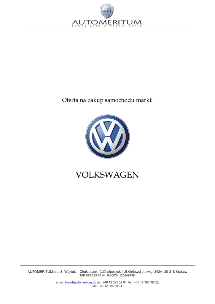 Oferta na zakup samochodu marki: VOLKSWAGEN AUTOMERITUM s.c. S. Wojdak – Chałupczak, C.Chałupczak | Ul.Królowej Jadwigi 243A, 30-218 Kraków NIP 679 299 78 44, REGON 120849159 email: [email protected], tel.: +48 12 395 39 04, tel.: +48 12 395 39 02, fax: +48 12 395 39 01 Załącznik do Umowy Informacje podstawowe: Marka: Volkswagen Model: Passat 2.0 TDI ALLTRACK 4Motion Rodzaj nadwozia: Kombi Numer VIN: WVWZZZ3CZDE051052 Pierwsza rejestracja: 01.10.2012r. Przebieg: 127 091 km Rodzaj silnika: 2.0 TDI Moc silnika: 125 kW / 170 KM Rodzaj skrzyni biegów: Automatyczna DSG Kolor nadwozia: Black Oak Metallic Ostatni serwis: 123 871 km (25.08.2015r.) inspekcja serwisowa Historia pojazdu: Bezwypadkowy, Oryginalny przebieg, Pisemna gwarancja. Wyposażenie m.in. Napęd 4Motion Elektryczny hamulec postojowy ALLTRACK – tryb Off Road Asystent ruszania ze wzniesienia Automatyczna skrzynia biegów DSG Multimediasystem AM/FM Łopatki przy kierownicy Multimediasystem CD, AUX Reflektory biksenonowe Końcówki wydechu chromowane Światła do jazdy dziennej w tech. LED Pakiet chrom System doświetlania zakrętów Odzyskiwanie energii z hamowania Komfortowe fotele przednie Ochrona progów z nierdzewnej stali Tapicerka Alcantara/Welurowa Tempomat Podgrzewane fotele przednie Interfejs Bluetooth Wyświetlacz między zegarami Plus System wykrywania zmęczenia kierowcy Kamera cofania Felgi Aluminiowe Nawigacja kolorowa RNS 315 Komputer pokładowy Klimatyzacja automatyczna dwustrefowa Poduszki powietrzne Czujnik deszczu Czujniki ciśnienia w oponach Czujnik zmierzchu Coming Home & Leaving Home Czujniki parkowania przód oraz tył Centralny zamek System audio DYNAUDIO Roleta bagażnika Multifunkcyjna kierownica Wspomaganie kierownicy AUTOMERITUM s.c. S. Wojdak – Chałupczak, C.Chałupczak | Ul.Królowej Jadwigi 243A, 30-218 Kraków NIP 679 299 78 44, REGON 120849159 email: [email protected], tel.: +48 12 395 39 04, tel.: +48 12 395 39 02, fax: +48 12 395 39 01 Załącznik do Umowy Skórzana trójramienna kierownica Pakiet zimowy Elektryczne szyby przód oraz tył Podłokietnik przód/tył Elektrycznie regulowane lusterka Immobiliser Podgrzewane lusterka ESP Składana i dzielona kanapa tylna ABS Komplet kluczyków (2 piloty) Książka serwisowa AUTOMERITUM s.c. S. Wojdak – Chałupczak, C.Chałupczak | Ul.Królowej Jadwigi 243A, 30-218 Kraków NIP 679 299 78 44, REGON 120849159 email: [email protected], tel.: +48 12 395 39 04, tel.: +48 12 395 39 02, fax: +48 12 395 39 01 Załącznik do Umowy AUTOMERITUM s.c. S. Wojdak – Chałupczak, C.Chałupczak | Ul.Królowej Jadwigi 243A, 30-218 Kraków NIP 679 299 78 44, REGON 120849159 email: [email protected], tel.: +48 12 395 39 04, tel.: +48 12 395 39 02, fax: +48 12 395 39 01 Załącznik do Umowy AUTOMERITUM s.c. S. Wojdak – Chałupczak, C.Chałupczak | Ul.Królowej Jadwigi 243A, 30-218 Kraków NIP 679 299 78 44, REGON 120849159 email: [email protected], tel.: +48 12 395 39 04, tel.: +48 12 395 39 02, fax: +48 12 395 39 01 Załącznik do Umowy AUTOMERITUM s.c. S. Wojdak – Chałupczak, C.Chałupczak | Ul.Królowej Jadwigi 243A, 30-218 Kraków NIP 679 299 78 44, REGON 120849159 email: [email protected], tel.: +48 12 395 39 04, tel.: +48 12 395 39 02, fax: +48 12 395 39 01 Załącznik do Umowy www.automeritum.pl Nasi partnerzy: AUTOMERITUM s.c. S. Wojdak – Chałupczak, C.Chałupczak | Ul.Królowej Jadwigi 243A, 30-218 Kraków NIP 679 299 78 44, REGON 120849159 email: [email protected], tel.: +48 12 395 39 04, tel.: +48 12 395 39 02, fax: +48 12 395 39 01