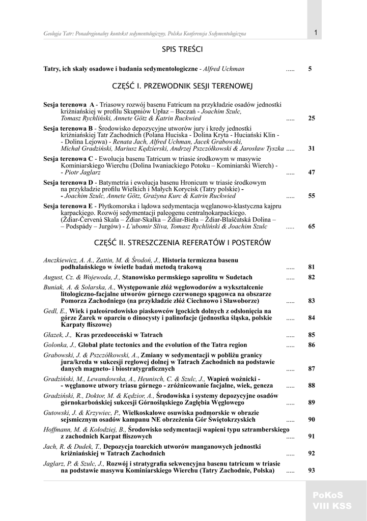 1 Geologia Tatr: Ponadregionalny kontekst sedymentologiczny. Polska Konferencja Sedymentologiczna SPIS TREŚCI Tatry, ich skały osadowe i badania sedymentologiczne - Alfred Uchman ..... 5 CZĘŚĆ I. PRZEWODNIK SESJI TERENOWEJ Sesja terenowa A - Triasowy rozwój basenu Fatricum na przykładzie osadów jednostki kriżniańskiej w profilu Skupniów Upłaz – Boczań - Joachim Szulc, Tomasz Rychliński, Annete Götz & Katrin Ruckwied ..... 25 Sesja terenowa B - Środowisko depozycyjne utworów jury i kredy jednostki kriżniańskiej Tatr Zachodnich (Polana Huciska - Dolina Kryta - Huciański Klin - Dolina Lejowa) - Renata Jach, Alfred Uchman, Jacek Grabowski, Michał Gradziński, Mariusz Kędzierski, Andrzej Pszczółkowski & Jarosław Tyszka ..... 31 Sesja terenowa C - Ewolucja basenu Tatricum w triasie środkowym w masywie Kominiarskiego Wierchu (Dolina Iwaniackiego Potoku – Kominiarski Wierch) - Piotr Jaglarz ..... 47 Sesja terenowa D - Batymetria i ewolucja basenu Hronicum w triasie środkowym na przykładzie profilu Wielkich i Małych Korycisk (Tatry polskie) - Joachim Szulc, Annete Götz, Grażyna Kurc & Katrin Ruckwied ..... 55 Sesja terenowa E - Płytkomorska i lądowa sedymentacja węglanowo-klastyczna kajpru karpackiego. Rozwój sedymentacji paleogenu centralnokarpackiego. (Ždiar-Červená Skala – Ždiar-Skalka – Ždiar-Biela – Ždiar-Blaščatská Dolina – – Podspády – Jurgów) - L’ubomir Sliva, Tomasz Rychliński & Joachim Szulc ..... 65 CZĘŚĆ II. STRESZCZENIA REFERATÓW I POSTERÓW Anczkiewicz, A. A., Zattin, M. & Środoń, J., Historia termiczna basenu podhalańskiego w świetle badań metodą trakową ..... 81 August, Cz. & Wojewoda, J., Stanowisko permskiego saprolitu w Sudetach ..... 82 Buniak, A. & Solarska, A., Występowanie złóż węglowodorów a wykształcenie litologiczno-facjalne utworów górnego czerwonego spągowca na obszarze Pomorza Zachodniego (na przykładzie złóż Ciechnowo i Sławoborze) ..... 83 Gedl, E., Wiek i paleośrodowisko piaskowców lgockich dolnych z odsłonięcia na górze Żarek w oparciu o dinocysty i palinofacje (jednostka śląska, polskie Karpaty fliszowe) ..... 84 Głazek, J., Kras przedeoceński w Tatrach ..... 85 Golonka, J., Global plate tectonics and the evolution of the Tatra region ..... 86 Grabowski, J. & Pszczółkowski, A., Zmiany w sedymentacji w pobliżu granicy jura/kreda w sukcesji reglowej dolnej w Tatrach Zachodnich na podstawie danych magneto- i biostratygraficznych ..... 87 Gradziński, M., Lewandowska, A., Heunisch, C. & Szulc, J., Wapień woźnicki - węglanowe utwory triasu górnego - zróżnicowanie facjalne, wiek, geneza ..... 88 Gradziński, R., Doktor, M. & Kędzior, A., Środowiska i systemy depozycyjne osadów górnokarbońskiej sukcesji Górnośląskiego Zagłębia Węglowego ..... 89 Gutowski, J. & Krzywiec, P., Wielkoskalowe osuwiska podmorskie w obrazie sejsmicznym osadów kampanu NE obrzeżenia Gór Świętokrzyskich ..... 90 Hoffmann, M. & Kołodziej, B., Środowisko sedymentacji wapieni typu sztramberskiego z zachodnich Karpat fliszowych ..... 91 Jach, R. & Dudek, T., Depozycja toarckich utworów manganowych jednostki kriżniańskiej w Tatrach Zachodnich ..... 92 Jaglarz, P. & Szulc, J., Rozwój i stratygrafia sekwencyjna basenu tatricum w triasie na podstawie masywu Kominiarskiego Wierchu (Tatry Zachodnie, Polska) ..... 93 Materiały konferencyjne: Przewodnik sesji terenowych PoKoS VIII KSS 2 Geologia Tatr: Ponadregionalny kontekst sedymentologiczny. Polska Konferencja Sedymentologiczna Jasionowski, M., Diageneza wapienia cechsztyńskiego (Ca1) na wyniesieniu wolsztyńskim ..... 94 Jędrys, J., Krajewski, M. & Matyszkiewicz, J., Założenia strukturalne rozwoju górnojurajskich budowli węglanowych na Wyżynie Krakowsko-Wieluńskiej ..... 95 Jurewicz, E. & Nejbert, K., Konkrecje żelaziste w osadach retyku wierchowego Tatr ..... 96 Kędzierski, M., Zmiany zespołów nannoplanktonu wapiennego jako wskaźnik zmian paleośrodowiska na przykładzie czarnych łupków batonu ..... 97 Kozłowska-Deuszkiewicz, M., Środowiska sedymentacji liasowych warstw snochowickich (zachodnie obrzeżenie Gór Świętokrzyskich) ..... 98 Krajewski, M. & Matyszkiewicz, J., Rozwój późnojurajskiej sedymentacji węglanowej w SW części Wyżyny Krakowskiej ..... 99 Krobicki, M., Czepiec, I. & Studencka, B., Sedymentacja wapieni ostrygowych i utworów pedogenicznych w Tyńcu koło Krakowa ..... 100 Kwolek, K., Protas, A. & Wolnowski, T., Geological characteristics and oil - gas potential of the main dolomite (Ca2) in western Poland ..... 101 Leszczyński, S., Rozmieszczenie utworów gruboklastycznych dolnego–środkowego eocenu płaszczowiny magurskiej (Karpaty Polskie): zapis ewolucji basenu czy zapis rozwoju sedymentacji ..... 102 Leszczyński, S., Sedymentacja w basenie resztkowym na przykładzie z płaszczowiny magurskiej (Karpaty Polskie) ..... 103 Leszczyński, S. & Kołodziej, B., Silikoklastyczno–węglanowe osady we fliszu Karpat zewnętrznych: przykład z warstw istebniańskich w Melsztynie (płaszczowina śląska, paleocen?) ..... 104 Lefeld, J., Nakładanie się trzech typów depozycji o zwiększającej się prędkości depozycji w dolnej kredzie reglowej Tatr Wschodnich (zarys problematyki) ..... 105 Łuczyński, P., Domieszka terygeniczna w wapieniach formacji ze Smolegowej i z Krupianki w seriach wierchowych Tatr ..... 106 Machaniec, E., Analiza mikropaleontologiczna górnokredowych margli węglowieckich jednostki podśląskiej w polskich Karpatach zewnętrznych ..... 107 Mastalerz K., Wysocka, A., Kasiński, J., Papiernik, B., Krzywiec, P., Ryzner-Siupik, B., Aleksandrowski, P. & Siupik, J., Środowiska depozycji i stratygrafia sekwencji utworów mioceńskich w rejonie zrębu Ryszkowej Woli (zapadlisko przedkarpackie) ..... 108 Matyszkiewicz, J. & Słomka, T., Zespół Lithocodium aggregatum - Bacinella irregularis z egzotyków wapieni cieszyńskich jednostki śląskiej ..... 109 Matyszkie