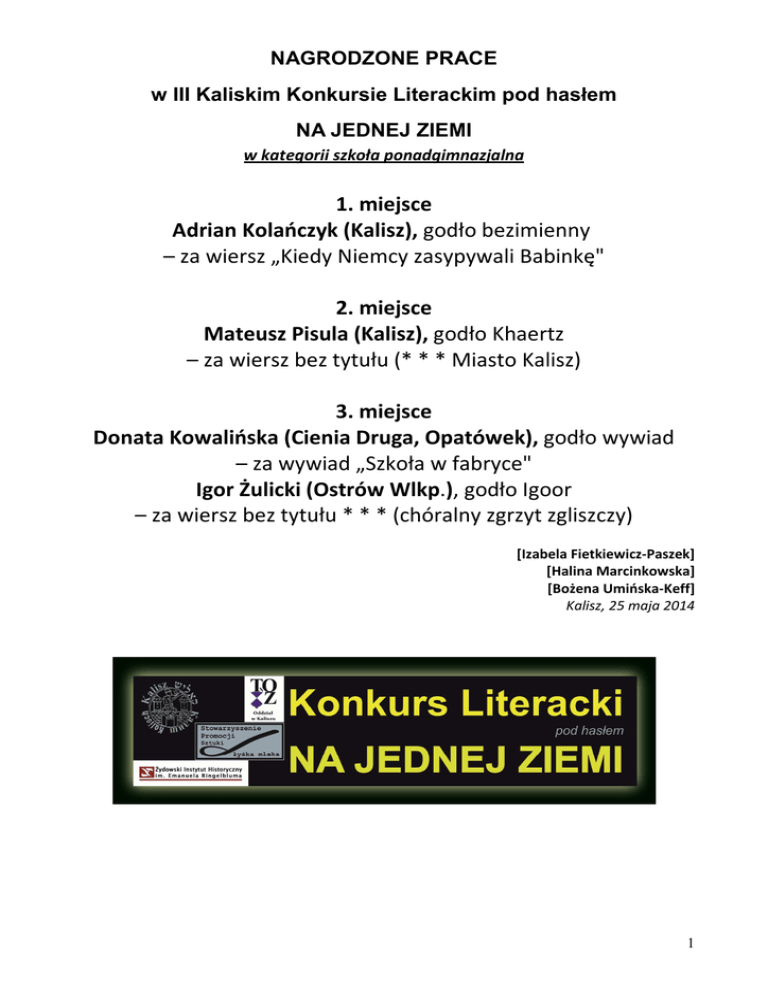 NAGRODZONE PRACE w III Kaliskim Konkursie Literackim pod hasłem NA JEDNEJ ZIEMI w kategorii szkoła ponadgimnazjalna 1. miejsce Adrian Kolańczyk (Kalisz), godło bezimienny – za wiersz „Kiedy Niemcy zasypywali Babinkę" 2. miejsce Mateusz Pisula (Kalisz), godło Khaertz – za wiersz bez tytułu (* * * Miasto Kalisz) 3. miejsce Donata Kowalińska (Cienia Druga, Opatówek), godło wywiad – za wywiad „Szkoła w fabryce" Igor Żulicki (Ostrów Wlkp.), godło Igoor – za wiersz bez tytułu * * * (chóralny zgrzyt zgliszczy) [Izabela Fietkiewicz-Paszek] [Halina Marcinkowska] [Bożena Umińska-Keff] Kalisz, 25 maja 2014 1 Adrian Kolańczyk (Kalisz) Kiedy Niemcy zasypywali Babinkę mój dziadek miał 12 lat. Chciał książkę o Indianch albo o Piratach, ale najbliżej leżał Słownik Wyrazów Obcych Michała Arcta. 25.000 wyrazów, wyrażeń, zwrotów i przysłów cudzoziemskich, używanych w mowie potocznej i w prasie polskiej. Warszawa, 1921 rok. Skórzana brązowa oprawa, złote litery, strony poplamione atramentem. Bałem się – mówi dziadek – pilnujący książek Niemiec stał niedaleko. Schowałem ją, o, tutaj – pokazuje z dumą – i uciekałem co sił w nogach. Byli ze mną koledzy: Idzi Kapłanek, Franek od Hemplów i mój brat, Wacek… Mośka Krenca wtedy już nie było. 2 Mateusz Pisula (Kalisz) Miasto Kalisz miasto z ciekawą przeszłością. Na prawo i lewo, z przodu i z tyłu, a nawet pod ziemią dostrzec można tych, co żyli wcześniej. Kiedyś miasto wielu kultur, dziś zniszczonych cmentarzy. Po ludziach żyjących przed nami zostały tylko ślady. Hala Szrajera to galeria handlowa, a stare macewy są częścią chodnika. Miasto Kalisz, miasto złamanych świec. 3 Igor Żulicki (Ostrów Wlkp.) *** chóralny zgrzyt zgliszczy przestrzelił mi uszy żółty zgrzyt liści zapiszę jak nuty kruchy na Boga wbitego na pal! nocny pasażer jak jean claude van damme krzepkim chodem trzeszczy drzazga miękim przodem nuci fiasco'a a ten cichym paradoksem nuci fiasco'a coraz głośniej! wysiadam psychicznie wchodząc fizycznie teoria freuda znów zacznie piszczeć papieros tak trzeszczy- dysonans mam w ręce! a zgliszcza trzepoczą jak beksiński z pędzlem *** krzyk trzasnął drzwiami wiatr zaczyna smakować słońce dyskretnie powiewa mżawką drzewa chwytają pęknięte chodniki koła samochodów rzeźbią asfaltowe pagórki kamienice - wyrzeźbione kawałki kamienia narożniki kryjące więcej niż światło latarni zjedliśmy własne języki bo zębów było mało latarnia – śruba wkręcona w ziemię 4 Donata Kowalińska (Cienia Druga, Opatówek) Szkoła w fabryce Zanim przy ulicy Wąskiej 13 w Kaliszu powstała szkoła, wcześniej w tym miejscu znajdowała się fabryka włókiennicza NEAPOL należąca do Józefa Madowicza i jego ojca. Manufaktura funkcjonowała aż do początku wojny, czyli 1939 roku. W 1961 roku budynek NEAPOLU został przekazany na potrzeby oświaty i wtedy powstała tutaj szkoła – początkowo zasadnicza zawodowa, teraz Zespół Szkół im. Zesłańców Sybiru. Józef Madowicz po wybuchu wojny wraz z żoną przenieśli się do Stanów Zjednoczonych. Nigdy już nie wrócili do Polski. Józef Madowicz w fabryce NEAPOL 5 Syn Józefa Madowicza – Lenny, podczas zwiedzania szkoły. 1 kwietnia 2014 naszą szkołę odwiedził Lenny Madowicz – syn Józefa, który przybył do nas aż z Nowego Jorku. Miałam okazję porozmawiać z nim na temat celu jego podróży oraz historii budynku. Jest nam niezwykle miło powitać Pana w murach naszej szkoły. Pierwsze pytanie – co Pana sprowadza do Kalisza? Moi rodzice pochodzili z Polski tata z Kalisza, a mama z Łodzi. Oboje juz nie żyją. Zawsze chciałem odwiedzić ich kraj, jestem tu pierwszy raz. Przyjechałem z Long Island w Nowym Jorku. Zawsze 6 chciałem zobaczyć jak wyglądało ich życie, gdzie dorastali, gdzie mieszkali, co robili zanim przyjechali do Izraela i USA. Mój syn jest w tej chwili tutaj w Polsce na szkolnej wycieczce. W Łodzi dołączy do mnie. A dlaczego odwiedza Pan akurat naszą szkołę? Znalazłem list do mojego ojca, który był zaadresowany stąd, z ulicy Wąskiej 13 w Kaliszu. Jak wynika z tego listu, rodzice mojego ojca prowadzili tutaj fabrykę, dokładnie w tym miejscu. Dlaczego dopiero teraz zdecydował Pan się tutaj dotrzeć? Od dawna już planowałem odwiedzić Polskę, ale brak czasu mi na to nie pozwalał. Dopiero teraz, gdy mój syn przyjechał tu na wycieczkę, zdecydowałem że to jest ten czas. Jego wycieczka do Polski okazała się dużą motywacją by w końcu odwiedzić rodzinne strony. Czy inne miasta poza Kaliszem zamierza Pan zwiedzić? Przyjechałem wczoraj, ale zdążyłem już zwiedzić Warszawę, no i dzisiaj Kalisz. Zamierzam jeszcze pojechać do Łodzi, Oświęcimia, Krakowa i kilku innych miast. Czyli najciekawsze miejsca w Polsce. A w Kaliszu zwiedzał Pan coś poza naszą szkołą? Do tej pory tylko nowy Cmentarz Żydowski przy ulicy Podmiejskiej. Zamierzam zwiedzić jeszcze jedno miejsce dom mojego ojca, o którym wspominał w liście. Znajduje się on przy ulicy Górnośląskiej 26. Czy ktoś z rodziny zajmuje się zagadnieniami związanymi z dziewiarstwem, koronkami innymi dziedzinami włókiennictwa? W tym momencie nie, natomiast kiedy ojciec przyjechał do Stanów, pierwszą rzeczą jaką się zajmował było koronkarstwo. rozmawiała Donata Kowalińska Za pomoc w przygotowaniu wywiadu i udzielenie cennych informacji dziękuję Pani Dyrektor Agacie Dziedzic oraz Pani Wicedyrektor Elżbiecie Wilk. 7