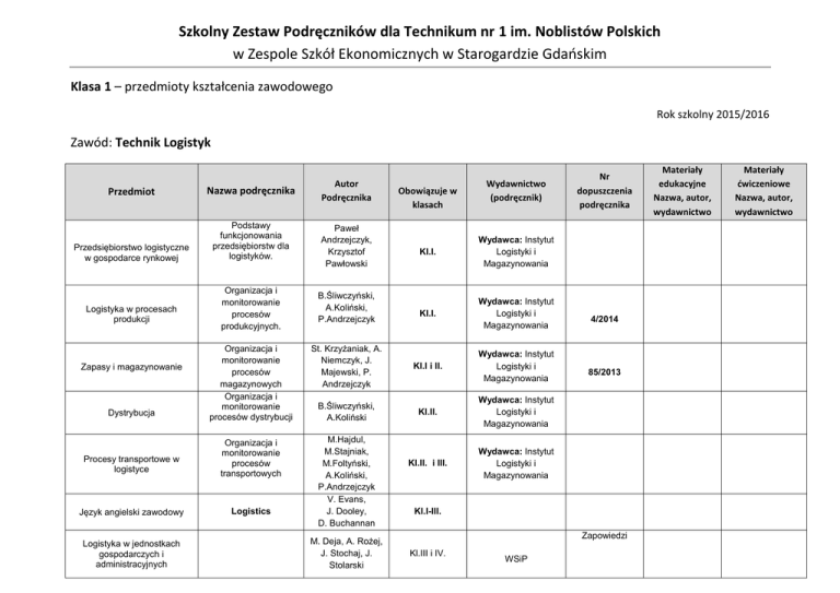 Szkolny Zestaw Podręczników dla Technikum nr 1 im. Noblistów Polskich w Zespole Szkół Ekonomicznych w Starogardzie Gdańskim Klasa 1 – przedmioty kształcenia zawodowego Rok szkolny 2015/2016 Zawód: Technik Logistyk Przedmiot Nazwa podręcznika Autor Podręcznika Przedsiębiorstwo logistyczne w gospodarce rynkowej Podstawy funkcjonowania przedsiębiorstw dla logistyków. Paweł Andrzejczyk, Krzysztof Pawłowski Organizacja i monitorowanie procesów produkcyjnych. B.Śliwczyński, A.Koliński, P.Andrzejczyk Dystrybucja Organizacja i monitorowanie procesów magazynowych Organizacja i monitorowanie procesów dystrybucji Procesy transportowe w logistyce Organizacja i monitorowanie procesów transportowych Język angielski zawodowy Logistics M.Hajdul, M.Stajniak, M.Foltyński, A.Koliński, P.Andrzejczyk V. Evans, J. Dooley, D. Buchannan Logistyka w procesach produkcji Zapasy i magazynowanie Logistyka w jednostkach gospodarczych i administracyjnych Obowiązuje w klasach Wydawnictwo (podręcznik) Kl.I. Wydawca: Instytut Logistyki i Magazynowania Kl.I. Wydawca: Instytut Logistyki i Magazynowania St. Krzyżaniak, A. Niemczyk, J. Majewski, P. Andrzejczyk Kl.I i II. Wydawca: Instytut Logistyki i Magazynowania B.Śliwczyński, A.Koliński Kl.II. Wydawca: Instytut Logistyki i Magazynowania Kl.II. i III. Wydawca: Instytut Logistyki i Magazynowania M. Deja, A. Rożej, J. Stochaj, J. Stolarski Nr dopuszczenia podręcznika 4/2014 85/2013 Kl.I-III. Zapowiedzi Kl.III i IV. WSiP Materiały edukacyjne Nazwa, autor, wydawnictwo Materiały ćwiczeniowe Nazwa, autor, wydawnictwo Szkolny Zestaw Podręczników dla Technikum nr 1 im. Noblistów Polskich w Zespole Szkół Ekonomicznych w Starogardzie Gdańskim W.Matysiak, E. Mizerska-Błasiak, J. Stochaj, J.Śliżewska, P.Śliżewski Organizowanie i monitorowanie przepływu zasobów i informacji w jednostkach gospodarczych Organizowanie i monitorowanie przepływu zasobów i informacji w jednostkach administracyjnych Logistyka zaopatrzenia i produkcji Planowanie produkcji i dystrybucji Laboratorium transportowospedycyjne Obsługa jednostek zewnętrznych Planowanie przepływu zasobów i informacji Język rosyjski w logistyce Język niemiecki w logistyce WSiP Kl.III i IV. Zapowiedzi Marcin Deja, Anna Rożej, Justyna Stochaj, Jarosław Stolarski Kl.III i IV. WSiP Radosław Kacperczyk Kl.II i III. Difin T. Janiak, G. Neumann, M. aus der Mark KL.II-IV Wydawca: Instytut Logistyki i Magazynowania Brak podręcznika Brak podręcznika Laboratorium logistyczno spedycyjne Brak podręcznika Brak podręcznika Meine Logistik. Język niemiecki dla logistyków. Zapowiedzi