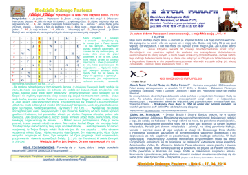 Alleluja! Alleluja! Wykrzykujcie na cześć Pana wszystkie ziemie. (Ps 100) Krzyżówka: 1. „Ja jestem … Pasterzem” 2. „Znam … moje, a moje Mnie znają” 3. Ofiarowane Nam przez Jezusa. 4. „Nikt nie może ich (owiec) … z ręki mego Ojca. 5. „Ojciec mój, który Mi je dał, jest większy od …”. 6. Jan, którego Ewangelię dzisiaj czytamy, był … Jezusa 7. Jezus, będąc jedno z Ojcem, pragnie … komunii z Nim dla każdego z nas 8. „Moje owce … mego głosu” 9. „Ja i Ojciec jedno …” 10. „Ja daję im życie ...” 11. „Nikt nie … ich z mojej ręki”. 12. „Skoro jednak … je (Słowo Boże) i sami uznajecie się za niegodnych życia wiecznego zwracamy się do pogan”. 1 x x x 2 x x x 4 x W 5 W 6 x x 7 x P 8 x x 9 J 3 Z 10 x 11 x 12 O W W A x D O B R Y P A S T E R Z B E W x M x x x x x x x x H x E Ć x E T Ł T D U Ś M J Ą I A E C Y E x x x x x x x x x x E x C Kiedy czytamy o pasterzu i o owcach … domyślamy się, że mowa jest o Panu Jezusie i o nas samych… Nazywamy Jezusa naszym pasterzem, ale czasem tak się zachowujemy, jak owca, która chce iść przed pasterzem, a nie za nim. Owca, która uważa, że jest od pasterza mądrzejsza i chce go prowadzić, bo wie, które pastwisko jest dla niej pożywne … Nigdy nie można być pewnym samego siebie. Święty Piotr był tak pewny, że nigdy nie zgrzeszy, a zgrzeszył. – Powracanie jest najważniejsze: rachunek sumienia, spowiedź, wzruszenia, świąteczny dar łez … [x JT]. - Ile spokoju odnajdujemy w tych słowach Jezusa (z dzisiejszej Ewangelii), kiedy wydaje się nam, że może nas jeszcze nie odrywa, ale oddala od Jezusa nasze zmęczenie, brak czasu, słabość ciała; wtedy kiedy grzeszymy i chcemy powrócić; kiedy oddalamy się od Boga i nie myślimy o powrocie; kiedy wydaje się, że już nie można nam pomóc. Jezus stale kocha, zawsze czeka. Radosna nowina o wierności Boga. Wszystko może, bo jest w Jego rękach cała wszechmoc Boża. Przypomina się św. Paweł z Listu do Rzymian: „Któż nas może odłączyć od miłości Chrystusowej? Utrapienie, ucisk czy prześladowanie, głód czy nagość, niebezpieczeństwo, czy miecz?” (Rz 8,35). … - Wydaje się, że (dzisiaj szczególnie) jest wielu „powyrywanych” z ręki Pasterza. Niektórzy od razu zostali wyrwani gwałtem i hałasem, inni pomalutku, włosek po włosku. Najpierw niteczka, potem cała owieczka. Jak często jednak ci, którzy zostali wyrwani przez modę, koniunkturę, nową ideologię, nagle wracają do Jezusa … - Miłość Jezusa jest tajemnicą. Żeby ją trochę poznać, trzeba poznać miłość na ziemi. Nie można kochać Boga, nie kochając ludzi. Trzeba przeżyć miłość ludzką, żeby dojść do miłości Bożej. … Jeśli dojrzewamy do miłości wzajemnej, to Trójca Święta, miłość Boża nie jest dla nas zagadką … tylko obrazem wzajemnej miłości Boga: Ojciec wszystko daje Synowi, Syn daje wszystko Ojcu. Ojciec wszystko przyjmuje od Syna, Syn wszystko od Ojca przyjmuje. Nad wzajemnością przyjmowania i dawania czuwa Duch Święty. […] [Ks. Jan Twardowski, W świetle Ewangelii, s. 328-330]. Wiedzcie, że Pan jest Bogiem, On sam nas stworzył . (Ps 100) MOJE POSTANOWIENIE: Pomodlę się o kapłańskie i zakonne zwłaszcza z naszej parafii … Kancelaria Parafialna liczne, dobre i święte powołania e-mail : [email protected] http://www.stanislaw-bm.pl/ [gazetka do użytku wewnętrznego Parafii] Stanisława Biskupa na Woli; 01-244 Warszawa; ul. Bema 73/75, Kancelaria Parafialna czynna: poniedziałek – piątek godz. 9:00 - 10:00; 16:00 - 17:30; tel. 22 632 38 00 Ja jestem dobrym Pasterzem i znam owce moje, a moje Mnie znają. (J 10,14) J 10,27-30 Moje owce słuchają mego głosu, a Ja znam je. Idą one za Mną i Ja daję im życie wieczne. Nie zginą one na wieki i nikt nie wyrwie ich z mojej ręki. Ojciec mój, który Mi je dał, jest większy od wszystkich. I nikt nie może ich wyrwać z ręki mego Ojca. Ja i Ojciec jedno jesteśmy. Jezus Chrystus wszedł do chwały zmartwychwstania przez krzyż. Chrześcijanin nie powinien sądzić, że zostanie mu oszczędzone doświadczenie niezrozumienia ze strony innych, a może nawet ucisku czy prześladowania. Jednak żadne tego rodzaju doświadczenia nie są w stanie nas odłączyć od Chrystusa. Wsłuchiwanie się w Jego słowo i trwanie w nim pozwoli nam zachować wierność w czasie próby. [Ks. Maciej Zachara MIC, „Oremus” Okres Wielkanocny 2004, s. 89]. 1050 ROCZNICA CHRZTU POLSKI „Gaude Mater Polonia! Raduj się Matko Polsko!” - Centralne uroczystości 1050-lecia chrztu Polski zostały zainaugurowane w czwartek 14 IV 2016, w Gnieźnie - Zebraniem Plenarnym Konferencji Episkopatu Polski i Ostrowie Lednickim - gdzie [wg. Historyków] odbył się chrzest Mieszka I. Na uroczystościach obecni byli przedstawiciele władz państwa, z prezydentem Andrzejem Dudą na czele. Po południu duchowni kościołów chrześcijańskich wzięli udział w nabożeństwie ekumenicznym, z wystawieniem relikwii św. Wojciecha, pod przewodnictwem prymasa Polski abp. Wojciecha Polaka... - Dziękujemy Panu Bogu za 1050 lat opieki nad polskim narodem, za wszelkie potrzebne łaski jakimi Pan obdarzył naszą ojczyznę. [Więcej informacji: http://www.tvn24.pl; ; http://archidiecezja.warszawa.pl/ Ojciec św. Franciszek - Drodzy Bracia i Siostry! Bardzo pragnę, by w czasie Nadzwyczajnego Jubileuszu Miłosierdzia wszyscy ochrzczeni mogli doświadczyć radości z tego, że należą do Kościoła! I by mogli odkryć na nowo, że powołanie chrześcijańskie, jak również poszczególne powołania rodzą się w łonie ludu Bożego i są darami Bożego miłosierdzia. Kościół jest domem miłosierdzia i „ziemią”, na której powołanie kiełkuje, wzrasta i przynosi owoc. Z tego względu z okazji 53. Światowego Dnia Modlitw o Powołania, zachęcam wszystkich do kontemplowania wspólnoty apostolskiej i do dziękowania za rolę wspólnoty w powołaniowej dro