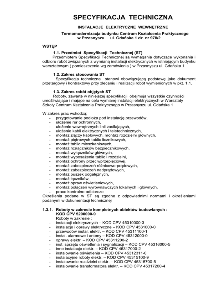 SPECYFIKACJA TECHNICZNA INSTALACJE ELEKTRYCZNE WEWNĘTRZNE Termomodernizacja budynku Centrum Kształcenia Praktycznego w Przasnyszu ul. Gdańska 1 dz. nr 978/2 WSTĘP 1.1. Przedmiot Specyfikacji Technicznej (ST) Przedmiotem Specyfikacji Technicznej są wymagania dotyczące wykonania i odbioru robót związanych z wymianą instalacji elektrycznych w istniejącym budynku warsztatowym ( pomieszczenia wg zamówienia ) w Przasnyszu ul. Gdańska 1 1.2. Zakres stosowania ST Specyfikacja techniczna stanowi obowiązującą podstawę jako dokument przetargowy i kontraktowy przy zlecaniu i realizacji robót wymienionych w pkt. 1.1. 1.3. Zakres robót objętych ST Roboty, zawarte w niniejszej specyfikacji obejmują wszystkie czynności umożliwiające i mające na celu wymianę instalacji elektrycznych w Warsztaty Szkoły Centrum Kształcenia Praktycznego w Przasnyszu ul. Gdańska 1 W zakres prac wchodzą: - przygotowanie podłoża pod instalację przewodów, - ułożenie rur ochronnych, - ułożenie wewnętrznych linii zasilających, - ułożenie kabli elektrycznych i teletechnicznych, - montaż złączy kablowych, montaż rozdzielni głównych, - montaż piętrowych tablic licznikowych, - montaż tablic mieszkaniowych, - montaż rozłączników bezpiecznikowych, - montaż wyłączników głównych, - montaż wyposażenia tablic i rozdzielni, - montaż ochrony przeciwprzepięciowej, - montaż zabezpieczeń różnicowo-prądowych, - montaż zabezpieczeń nadprądowych, - montaż puszek odgałęźnych, - montaż łączników, - montaż opraw oświetleniowych, - montaż połączeń wyrównawczych lokalnych i głównych, - prace kontrolno-odbiorcze Określenia podane w ST są zgodne z odpowiednimi normami i określeniami podanymi w dokumentacji technicznej 1.3.1. Roboty w zakresie kompletnych obiektów budowlanych : KOD CPV 5200000-9 Roboty w zakresie : - instalacji elektrycznych – KOD CPV 45310000-3 - instalacje i oprawy elektryczne – KOD CPV 4531000-0 - przewodów instal. elektr. – KOD CPV 45311100-1 - instal. alarmowe i anteny – KOD CPV 45312000-0 - oprawy elektr. – KOD CPV 45311200-2 - inst. sprzętu oświetlenia i sygnalizacji – KOD CPV 45316000-5 - inne instalacje elektr. – KOD CPV 45317000-2 - instalowanie oświetlenia – KOD CPV 45312311-0 - instalacyjne roboty elektr. – KOD CPV 45315100-9 - instalowanie rozdzielni elektr. – KOD CPV 45315700-5 - instalowanie transformatora elektr. – KOD CPV 45317200-4 1.4. Charakterystyka elementów objętych ST – zagadnienia ogólne Przyłącze – jest to linia elektroenergetyczna łącząca złącze (odbiorcę) z siecią zasilającą. Złącze – z jednej strony jest końcowym elementem sieci zasilającej, zaś z drugiej – początkiem instalacji obiektu budowlanego. Rozdzielnia główna – jest to element instalacji elektrycznej występujący w przypadku, gdy z jednego złącza zasilana jest więcej niż jedna linia zasilającą. W rozdzielnicy głównej usytuowane są zabezpieczenia poszczególnych wewnętrznych linii zasilających. Rozdzielnicę budynku umieszcza się zwykle w pobliżu złącza. Wewnętrzna linia zasilająca (WLZ) – jest to obwód zasilający tablice rozdzielcze (rozdzielnice), z których zasilane są instalacje odbiorcze. Obwód rozdzielczy – jest to obwód zasilający tablice rozdzielcze. W obiektach budowlanych rolę obwodów rozdzielczych pełnią wewnętrzne linie zasilające (WLZ). Obwód odbiorczy (obwód końcowy) – jest to obwód, do którego przyłączone są bezpośrednio odbiorniki energii elektrycznej lub gniazda wtyczkowe. Głównymi elementami obwodu instalacji elektrycznej są przewody (tory prądowe) umożliwiające przesyłanie energii elektrycznej, łączniki umożliwiające załączanie i wyłączanie oraz zabezpieczenia chroniące elementy obwodu przed skutkami zakłóceń. Kable – wyroby składające się z jednej lub większej liczby żył izolowanych, zaopatrzone w powłokę oraz ewentualnie – w zależności od warunków układania i eksploatacji w osłonę i pancerz. Kable przystosowane są do układania bezpośrednio w ziemi, w wodzie lub w kanałach podziemnych, albo też do zawieszania w powietrzu. Przewody – wyroby składające się z jednego lub kilku skręconych drutów albo jednej większej liczby żył izolowanych bez powłoki lub w zależności od warunków, w których mają być zastosowane – zaopatrzone w powłokę niemetalową. Linia kablowa – kabel wielożyłowy lub wiązka kabli jednożyłowych w układzie wielofazowym albo kilka kabli jedno lub wielożyłowych połączonych równolegle łącznie z osprzętem, ułożone na wspólnej trasie i łączące zaciski tych samych dwóch urządzeń elektrycznych jedno lub wielofazowych. Trasa kablowa – pas terenu w którym ułożone są jedna lub więcej linii kablowych. Napięcie znamionowe linii – napięcie międzyprzewodowe, na które linia kablowa została zbudowana. Osprzęt linii kablowej – zbiór elementów przeznaczonych do łączenia, rozgałęzienia lub zakończenia kabli. Przepust kablowy – konstrukcja o przekroju najczęściej okrągłym przeznaczona do ochrony kabla przed uszkodzeniami mechanicznymi, chemicznymi, i działaniem łuku elektrycznego. Dodatkowa ochrona przeciwporażeniowa – ochrona części przewodzących, dostępnych w wypadku pojawienia się na nich napięcia w warunkach zakłóceniowych. Bezpieczniki topikowe – zabezpieczają przed przetężeniami, przede wszystkim przed skutkami zwarć. Na działanie , parametry i jakość bezpiecznika wpływają wszystkie jego części składowe, ale decydujący wpływ mają: topik, gasiwo i korpus wkładki. 2. MATERIAŁY 2.1. Ogólne wymagania Ogólne wymagania dotyczące materiałów technicznej. podano w dokumentacji 2.2. Przewody elektroenergetyczne Typy przewodów stosować zgodnie z dokumentacją techniczną i specyfikacją dokumentacji technicznej. Do wykonania instalacji elektrycznych w budynkach stosować przewody izolowane do układ