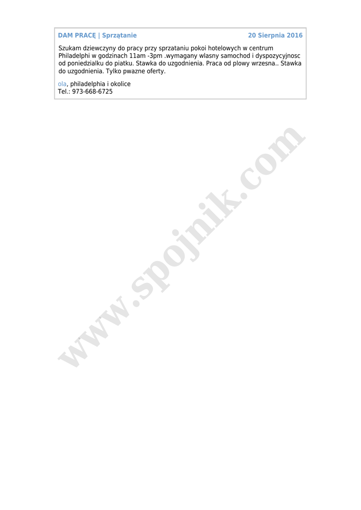 DAM PRACĘ | Sprzątanie 20 Sierpnia 2016 Szukam dziewczyny do pracy przy sprzataniu pokoi hotelowych w centrum Philadelphi w godzinach 11am -3pm .wymagany wlasny samochod i dyspozycyjnosc od poniedzialku do piatku. Stawka do uzgodnienia. Praca od plowy wrzesna.. Stawka do uzgodnienia. Tylko pwazne oferty. w w w .s po jn ik .c o m ola, philadelphia i okolice Tel.: 973-668-6725