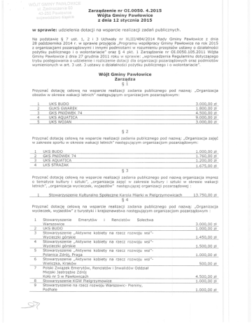 Zarządzenie nr 01.0050. 4.2015 Wójta Gminy Pawłowice z dnia 12 stycznia 2015 w sprawie: udzielenia dotacji na wsparcie realizacji zadań publicznych. Na podstawie § 7 ust. l, 2 i 3 Uchwały nr XLIII/484/2014 Rady Gminy Pawłowice z dnia 28 października 2014 r. w sprawie przyjęcia "Programu współpracy Gminy Pawłowice na rok 2015 z organizacjami pozarządowymi i innymi podmiotami w rozumieniu przepisów ustawy o działalności pożytku publicznego i o wolontariacie" oraz § 4 pkt. 1 Zarządzenie nr 01.0050.105.2011 Wójta Gminy Pawłowice z dnia 27 grudnia 2011 roku w sprawie: "wprowadzenia Regulaminu dotyczącego trybu postępowania o udzielenie i rozliczenie dotacji dla organizacji pozarządowych oraz podmiotów wymienionych wart. 3 ust. 3 ustawy o działalności pożytku publicznego i o wolontariacie". Wójt Gminy Pawłowice Zarządza §1 Przyznać dotację celową na wsparcie realizacji zadania publicznego pod nazwą: obozów w okresie wakacji letnich" następującym organizacjom pozarządowym: 1 2 3 4 5 UKS BUDO GUKS GWAREK GKS PNIOWEK 74 UKS AQUATICA UKS WOJAN "Organizacja 3.000 00 1.800 00 4.500 00 9.000,00 3.00000 zł zł zł zł zł §2 Przyznać dotację celową na wsparcie realizacji zadania publicznego pod nazwą: "Organizacja w zakresie sportu w okresie wakacji letnich" następującym organizacjom pozarządowym: 1 2 3 4 zajęć 1.000 00 zł 1.760 00 zł 1.200,00 zł UKS BUDO GKS PNIOWEK 74 UKS AQUATICA LKS STRAŻAK 1.675 00 zł §3 Przyznać dotację celową na wsparcie realizacji zadania publicznego pod nazwą organizacja imprez o tematyce kultury i sztuki", "organizacja zajęć w zakresie kultury i sztuki w okresie wakacji letnich", "organizacja wycieczek, wyjazdów" następującej organizacji pozarządowej: 1 Stowarzyszenie Kulturalno Społeczne Karola Miarki w Pielgrzymowicach §4 13.750,00 zł Przyznać dotację celową na wsparcie realizacji zadania publicznego pod nazwą: "Organizacja wycieczek, wyjazdów" z turystyki i krajoznawstwa następującym organizacjom pozarządowym: 1 2 3 4 5 6 7 8 9 Stowarzyszenie Emerytów Rencistów Sołectwa Warszowice UKS BUDO Stowarzyszenie "Aktywne kobiety na rzecz rozwoju wsi"Wycieczki górskie Stowarzyszenie "Aktywne kobiety na rzecz rozwoju wsi"Wycieczki górskie Stowarzyszenie "Aktywne kobiety na rzecz rozwoju wsi"Polanica Zdrój, Praga Stowarzyszenie "Aktywne kobiety na rzecz rozwoju wsi"Wieliczka Kraków Polski Związek Emerytów, Rencistów i Inwalidów Oddział Miejski Jastrzębie Zdrój Koło nr 5 w Pawłowicach Stowarzyszenie KGW Pielgrzymowice Stowarzyszenie na rzecz rozwoju Warszowic- Pieniny, Podhale 3.000 00 zł 1.000 00 zł 1.450,00 zł 1.500,00 zł 1.000,00 zł 500 00 zł 4.500 00 zł 1.000,00 zł 1.000 00 zł §5 Przyznać dotację celową na wsparcie realizacji zadania publicznego imprez sportowych" następującym organizacjom pozarządowym: 1 2 3 4 5 6 7 8 9 10 11 12 13 14 15 16 17 18 19 pod nazwą: Stowarzyszenie Aktywne kobiety na rzecz rozwoju wsi "Organizacja imprez sportowych"- rajd górski GUKS GWAREK "IV Ogólnopolski Turniej Koszykówki Dziewcząt" Stowarzyszenie Szachowe Gminy Pawłowice "XVI Międzynarodowy Otwarty Nocny Maraton Szachowy o Puchar Przewodniczącego Rady Gminy Pawłowice" GKS PNI6wEK 74 "Turnieje Piłkarskie GKS PNIÓWEK 74" UKS AQUATICA "Dzień Dziecka" UKS AQUATICA "VI miting Pływacki" LKS STRAŻAK "Turniej Gminnej Ligi Skata Sportowego" KRS TKKF ROZW6J "Gminna Liga Tenisa Stołowego" KRS TKKF ROZW6J "Gminny Turniej Piłki Nożnej Halowej Oldbojów" KRS TKKF ROZW6J "Wiosenny Gminny Turniej Piłki Nożnej Amatorów" KRS TKKF ROZW6J "Gminny Turniej Piłki Nożnej Halowej z Okazji Święta Niepodległości" KRS TKKF ROZW6J "Gminny Turniej Piłki Siatkowej Mężczyzn" KRS TKKF ROZW6J "Gminny Turniej Piłki Siatkowej Plażowej Mężczyzn" UKS WOJAN "Puchar Wojan CUP" GKS FUTSAL "Turniej futsalu" GKS FUTSAL "Turniej o puchar regionów w futsalu" GKS FUTSAL "Halowy Puchar Polski" GKS FUTSAL "Puchar Ligi PLF, Mecz o Superpuchar" GKS FUTSAL "Młodzieżowe Mistrzostwa Polski U-18" "Organizacja 1.800,00 zł 4.800,00 zł 7.300,00 zł 4.800 00 zł 2.000,00 zł 2.010,00 zł 1.610,00 zł 2.000,00 zł 1.100,00 zł 1.980,00 zł 1.820,00 zł 4.400,00 zł 800,00 zł 800,00 zł 2.000,00 zł 1.870,00 zł 15.000 00 zł §6 Kontrolę realizacji zadań publicznych wymienionych Organizacyjnego i Informatyki. w § 1-5 sprawuje pracownik Referatu §7 Wykonanie zarządzenia powierzam Sekretarzowi Gminy. §8 Zarządzenie wchodzi w życie z dniem podjęcia. WÓJT\" Frp?O;'~' Rozdzielnik: 1. Rejestr zarządzeń 2. Referat Organizacyjny i Informatyki