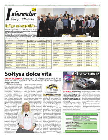 www.olesnica24.com PANORAMA GMIN 16-22 marca 2016 I Panorama Oleśnicka nr 11 nr PANORAMA GMIN w w w.olesnic a 24.c om 17 23 nformator Gminy Oleśnica Sołtys na zagrodzie... Informator Samorządowy nr 2 kwiecień 2015 Sołtysów w gminie Oleśnica jest 29. Osiem pań. 9 osób debiutuje w tej kadencji na tym stanowisku. 6 sołtysów jest także radnymi Rady Gminy. Ich kadencja (a także współdziałających z nimi rad sołeckich) odpowiada kadencji Rady Gminy, licząc od dnia jej wyboru. Sołtys otrzymuje comiesięczną dietę - 350 zł - z Sołtysi pełnią ważną rolę w lokalnym środowisku tytułu pełnienia funkcji. DOBROSZYCE - Dobre życie Oni uwierzyli w siebie! Sołectwo Gminny Ośr Imię Nazwisko Służbowy stacjonarny nr tel. Służbowy komórkowy nr tel. Kadencja Sołectwo Imię Nazwisko Służbowy stacjonarny nr tel. Służbowy komórkowy nr tel. Kadencja Bogusławice Tomasz Domal - 531 693 689 I Osada Leśna Sławomir Żuraw 71 3140355 535 878 192 V Boguszyce Jadwiga Bodo 71 3140244 535 878 258 II Osiedle Boguszyce Elżbieta Wichtowska 71 3140245 535 878 117 III Brzezinka Krzysztof Sztochel 71 3140354 535 878 142 I Ostrowina Jan Żarecki 71 3140267 535 878 154 I Bystre Marta Barska - 534 655 504 II Piszkawa Janina Bednarska 71 3140352 535 878 162 III Cieśle Stanisław Mamrot 71 3140268 535 878 172 V Poniatowice Andrzej Gołębiowski 71 3140247 535 878 207 I NASZ BIERUTÓW Dąbrowa Stanisław Bartosik 71 3140341 535 878 107 II Smardzów Agnieszka Podobińska 71 3992692 535 878 257 I Gręboszyce Zdzisław Chrzanowski 71 3140340 535 878 148 III Smolna Marian Słotnicki 71 3140265 535 878 158 VI Szczepan Pietras Informator Samorządowy nr 4 71 3140356 535 878 294 maj 2015 III Sokołowice Wiesław Bełza 71 3140248 535 878 136 I II Spalice Marcin Korzępa - 534 655 501 II Jenkowice Krzeczyn Grzegorz Klat - 534 655 510 Ligota Mała Grzegorz Szymański - 534 655 589 I Świerzna Łukasz Sosiński 71 3140381 535 878 146 I Ligota Polska Józef Stefaniak 71 3143620 535 878 210 II Wszechświęte Waldemar Uba 71 3140351 535 878 168 IV Ligota Wielka Justyna Batog 71 3140353 535 878 118 II Wyszogród Sławomir Zadka 71 3140350 535 878 189 II Nieciszów Wiktoria Migalska 71 3140357 535 878 251 I Zarzysko Andrzej Szymański 71 3140269 535 878 170 III Nowa Ligota Marzena Gardzilewicz 71 3140359 535 878 160 IV Zimnica Ryszard Hungier 71 3140358 535 878 129 IV Nowoszyce Andrzej Hamarowski - 534 655 557 II Drogi, czyli złoty środek Zaledwie 1 Sołtysa dolce vita Astra w rowie Dzień Sołtysa to coroczne polskie święto obchodzone w większości przypadków na terenie kraju 11 marca (lokalnie można napotkać inne daty). Pochodzenie nie jest znane, jednak w ostatnich latach święto staje się coraz popularniejsze w gminach wiejskich. Również w Urzędzie Gminy odbyło się kolejny raz spotkanie wójta z sołtysami w dniu ich święta. - Życzę wam wytrwałości oraz dobrych relacji z mieszkańcami mówił do zebranych sołtysów wójt Marcin Kasina. A niespodzianką był okolicznościowy tort. W gminie Oleśnica jest 29 22 gospodarzy wsi, w tym 8 pań. Wszyscy przyszli na spotkanie. Dziewięcioro to nowicjusze. Są to: Tomasz Domal z Bogusławic, Krzysztof Sztochel z Brzeziniki, Grzegorz Szymański z Ligoty Małej, Wiktoria Migalska z Niecizowa, Jan Żarecki z Ostrowiny, Andrzej Gołębiowski z Poniatowic, Agnieszka Podobińska ze Smardzowa, Wiesław Bełza z Sokołowic, Łukasz Sosiński ze Świerznej. M a r i a n S ło t n ic k i sołtysuje w Smolnej od 4 stycznia 1995 r. Czyli już 20 lat. Tworzy wioskową tradycję. A z koli w Nieciszowie po ojcu tradycję sołtysowania przejęła przed rokiem 19-letnia wówczas Wiktoria Migalska. - Każdy ma prawo wziąć udział w wyborach, a u nas ludzie za mną poszli i mnie wybrali. Coś nowego we wsi... uśmiecha się najmłodsza w gminie sołtyska. Ona wie, że w razie chwilę, po prostu nie da się. Zajakichś problemów zawsze może wsze jest coś, przy każdym wyjliczyć na życzliwą radę ojca... ściu z domu, czy wizycie gościa. Wszyscy sołtysi mają ko- Nie ma chyba sołtysa, który miałmórkowe telefony służ- by określone godziny urzędowania bowe, 23 sołtysów te- - uważa Jadwiga Bodo z Boguszyc, lefony na dwie karty wyróżniona w wojewódzkim kondual SIM (dawny nu- kursie Sołtys Roku 2014. Panorama 20 mer stacjonarny i nr Oleśnicka A w nr konkursie Sołtys Roku 2015 komórkowy). Kontakt pamiątkowy dyplom otrzymała Urzędu Gminy z soł- Justyna Batóg z Ligoty Wielkiej. tysami zapewnia Konkurs promuje za działalność system smso- i osiągnięcia w takich obszarach, wy (SISMS). jak: zaangażowanie w sprawy spoS o ł t y s e m łeczne, organizację inicjatyw zwiąj e s t s i ę 2 4 zanych z aktywizacją mieszkańgo d z i ny n a ców, działalność na rzecz wsparcia dobę. - Soł- kultury i miejscowego folkloru. Do tysem prak- konkursu zgłoszono ponad 90 kantycznie jest dydatur. Podczas uroczystości, któs ię c a ł y ra odbyła się w Sali Kolumnowej w c z a s, t o Dolnośląskim Urzędzie Wojewódzn i e j e s t kim, wojewoda Paweł Hreniak pofunkcja, o wiedział do zgromadzonych, że k t ó r e j sołectwa stanowią ważną część m o ż n a z a - samorządowego życia Polek i Pola(hag, ror) p o m n i e ć n a ków. Fot. Grzegorz Huk GMINA OLEŚNICA. Słodkie życie? No, różnie to jednak bywa. Ale ten dzień - 11 marca - mieli słodki. W Urzędzie Gminy władze samorządowe podjęły ich tortem. OSTROWINA Trzy poszko- nie nad autem i w rowie wylądodowane osoby, mieszkańcy wał jego opel astra. powiatu oleśnickiego, zostały Trzy poszkodowa ne osoby, odwiezione do szpitala. Auto mieszkańcy powiatu oleśnickiego. zostało poważnie uszkodzone. zostały odwiezione do szpitala. Kierujący próbował ratować się, Astra została poważnie uszkodzobo auto w poboczu wyryło głę- na. Kierujący próbował ratować się, boką bruzdę. bo auto w poboczu wyryło głęboką Do wypadku doszło w piątek bruzdę. oko