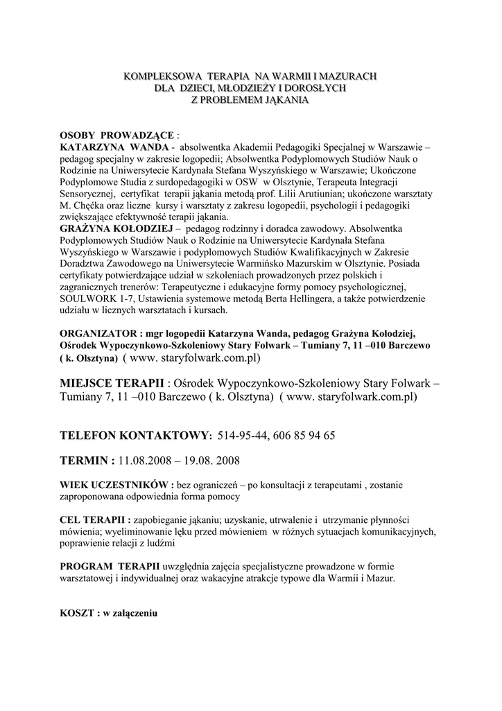 K KO OM MPPLLEEK KSSO OW WA A TTEER RA APPIIA AN NA AW WA AR RM MIIII II M MA AZZU UR RA AC CH H D L A D Z I E C I , M Ł O D Z I E ś Y I D O R O S Ł Y C H DLA DZIECI, MŁODZIEśY I DOROSŁYCH ZZ PPR RO OB BLLEEM MEEM M JJĄ ĄK KA AN NIIA A OSOBY PROWADZĄCE : KATARZYNA WANDA - absolwentka Akademii Pedagogiki Specjalnej w Warszawie – pedagog specjalny w zakresie logopedii; Absolwentka Podyplomowych Studiów Nauk o Rodzinie na Uniwersytecie Kardynała Stefana Wyszyńskiego w Warszawie; Ukończone Podyplomowe Studia z surdopedagogiki w OSW w Olsztynie, Terapeuta Integracji Sensorycznej, certyfikat terapii jąkania metodą prof. Lilii Arutiunian; ukończone warsztaty M. Chęćka oraz liczne kursy i warsztaty z zakresu logopedii, psychologii i pedagogiki zwiększające efektywność terapii jąkania. GRAśYNA KOŁODZIEJ – pedagog rodzinny i doradca zawodowy. Absolwentka Podyplomowych Studiów Nauk o Rodzinie na Uniwersytecie Kardynała Stefana Wyszyńskiego w Warszawie i podyplomowych Studiów Kwalifikacyjnych w Zakresie Doradztwa Zawodowego na Uniwersytecie Warmińsko Mazurskim w Olsztynie. Posiada certyfikaty potwierdzające udział w szkoleniach prowadzonych przez polskich i zagranicznych trenerów: Terapeutyczne i edukacyjne formy pomocy psychologicznej, SOULWORK 1-7, Ustawienia systemowe metodą Berta Hellingera, a takŜe potwierdzenie udziału w licznych warsztatach i kursach. ORGANIZATOR : mgr logopedii Katarzyna Wanda, pedagog GraŜyna Kołodziej, Ośrodek Wypoczynkowo-Szkoleniowy Stary Folwark – Tumiany 7, 11 –010 Barczewo ( k. Olsztyna) ( www. staryfolwark.com.pl) MIEJSCE TERAPII : Ośrodek Wypoczynkowo-Szkoleniowy Stary Folwark – Tumiany 7, 11 –010 Barczewo ( k. Olsztyna) ( www. staryfolwark.com.pl) TELEFON KONTAKTOWY: 514-95-44, 606 85 94 65 TERMIN : 11.08.2008 – 19.08. 2008 WIEK UCZESTNIKÓW : bez ograniczeń – po konsultacji z terapeutami , zostanie zaproponowana odpowiednia forma pomocy CEL TERAPII : zapobieganie jąkaniu; uzyskanie, utrwalenie i utrzymanie płynności mówienia; wyeliminowanie lęku przed mówieniem w róŜnych sytuacjach komunikacyjnych, poprawienie relacji z ludźmi PROGRAM TERAPII uwzględnia zajęcia specjalistyczne prowadzone w formie warsztatowej i indywidualnej oraz wakacyjne atrakcje typowe dla Warmii i Mazur. KOSZT : w załączeniu KOMPLEKSOWA TERAPIA JĄKANIA NA WARMII I MAZURACH TERAPIA POŁĄCZONA Z WYPOCZYNKIEM DLA CAŁEJ RODZINY MIEJSCE TERAPII JĄKANIA : Ośrodek Wypoczynkowo-Szkoleniowy Stary Folwark – Tumiany 7, 11 –010 Barczewo ( k. Olsztyna) ( www. staryfolwark.com.pl) TERMIN TERAPII : 11.08.2008 – 19.08 2008 CENNIK : USŁUGA CENA ZAJĘCIA TERAPEUTYCZNE 850 zł w czasie trwania turnusu NOCLEG ZA DOBĘ OD 1 OSOBY 30 ZŁ MOśNA WYKUPIĆ Śniadanie za 1 osobę 10 zł Obiad za 1 osobę 20 zł kolację 15 zł UWAGA ! Do udziału w zajęciach terapeutycznych zachęcamy osoby z problemem jąkania z osobami towarzyszącymi ( przyjaciółmi, rodzicami, rodzeństwem, opiekunami lub z innymi członkami rodziny ). Dzięki temu uczestnicy będą mieli zapewniony lepszy komfort psychiczny i wsparcie najbliŜszych po zakończonym turnusie. Regulamin zgłoszenia i wpłat: 1. Decyzję o udziale w terapii naleŜy potwierdzić, wysyłając do 31.05.2008r. załączone zgłoszenie na adres: Katarzyna Wanda ul. Kościuszki 38 B 11-010 Barczewo 2. Warunkiem udziału w zajęciach jest wpłacenie do 01 lipca 2008 zaliczki w wysokości 100 zł na konto : PKO BP O/ Olsztyn 43 1020 3541 0000 5002 0040 5837. KATARZYNA WANDA ul. Kościuszki 38 B 11-010 Barczewo. Z DOPISKIEM : ZALICZKA .TERAPIA JĄKANIA 2008 3. Pozostałą kwotę naleŜy wpłacić gotówką 11.08.2008 bezpośrednio u organizatorów. 4. W razie odwołania zajęć z winy organizatora , zaliczka w pełnej wysokości zostanie zwrócona na podane przez uczestnika konto lub adres. 5. Przy rezygnacji uczestnika z terapii wpłacona zaliczka nie zostanie zwrócona w związku z koniecznością pokrycia kosztów organizacyjnych. 6. W związku z tym, Ŝe ilość miejsc jest ograniczona o udziale w zajęciach decyduje kolejność zgłoszeń potwierdzonych wpłatą w podanym terminie. 7. Uczestnik moŜe brać udział w terapii nie wykupując noclegów w Ośrodku Wypoczynkowo-Szkoleniowym Stary Folwark – Tumiany 7, 11 –010 Barczewo ( k. Olsztyna), 8. JeŜeli uczestnik jest zainteresowany noclegiem w Ośrodku WypoczynkowoSzkoleniowym Stary Folwark – Tumiany 7, 11 –010 Barczewo ( k. Olsztyna), to powinien wypełnić załączony formularz zgłoszenia. Akceptuję podane warunki w regulaminie zgłoszenia i wpłat oraz wyraŜam zgodę na przetwarzanie danych osobowych dla celów organizacyjnych. Data .......................... Podpis ................ Jeden egzemplarz regulaminu proszę podpisać i wysłać na adres: Katarzyna Wanda ul. Kościuszki 38 „ B” 11-010 Barczewo BliŜsze informacje – Katarzyna Wanda, telefon 606 85 94 65, ( 089 ) 514 95 45 e-mail kkwanda @ wp.pl ----------------------------------------------------------------------------------------------------------------- ZGŁOSZENIE UDZIAŁU W KOMPLEKSOWEJ TERAPII JĄKANIA. Formularz wypełnia rodzic/opiekun lub uczestnik pełnoletni. Zgłaszam udział w kompleksowęj terapii jąkania, która odbędzie się w terminie .................. • Uczestnik terapii: ……………………………….......... ( imię i nazwisko ) .................... ( data urodzenia ) • osoba towarzysząca uczestnikowi terapii : ………………… ……................ ................ ( imię i nazwisko ) ( pokrewieństwo ) (wiek ) • osoba towarzysząca uczestnikowi terapii : ………………… ……................ ................ ( imię i nazwisko ) ( pokrewieństwo ) (wiek ) • osoba towarzysząca uczestnikowi terapii : ………………… ……................ ................ ( imię i nazwisko ) ( pokrewieństwo ) (wiek ) Adres uczestnika: ………………………………………………………………………
