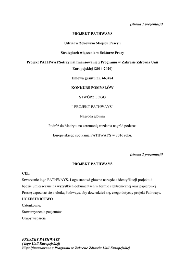 [strona 1 prezentacji] PROJEKT PATHWAYS Udział w Zdrowym Miejscu Pracy i Strategiach włączenia w Sektorze Pracy Projekt PATHWAYSotrzymał finansowanie z Programu w Zakresie Zdrowia Unii Europejskiej (2014-2020) Umowa grantu nr. 663474 KONKURS POMYSŁÓW STWÓRZ LOGO “ PROJEKT PATHWAYS” Nagroda główna Podróż do Madrytu na ceremonię rozdania nagród podczas Europejskiego spotkania PATHWAYS w 2016 roku. [strona 2 prezentacji] PROJEKT PATHWAYS CEL Stworzenie logo PATHWAYS. Logo stanowi główne narzędzie identyfikacji projektu i będzie umieszczane na wszystkich dokumentach w formie elektronicznej oraz papierowej Proszę zapoznać się z ulotką Pathways, aby dowiedzieć się, czego dotyczy projekt Pathways. UCZESTNICTWO Członkowie: Stowarzyszenia pacjentów Grupy wsparcia PROJEKT PATHWAYS [ logo Unii Europejskiej] Współfinansowane z Programu w Zakresie Zdrowia Unii Europejskiej [strona 3 prezentacji] WIDOCZNOŚĆ LOGO W: Grupy wsparcia Stowarzyszenia pacjentów Decydenci polityczni Związki Handlowe i stowarzyszenia pracodawców Organizacje międzynarodowe (np. Międzynarodowa Organizacja Pracy; Światowa organizacja Zdrowia; Unia Europejska, Organizacja Bezpieczeństwa i Współpracy w Europie, Bank Światowy...) Projekty Europejskie, Komisja Europejska, Parlament Europejski Media, prasa, blogi Społeczeństwo [strona 4 prezentacji] SZCZEGÓŁY Profesjonalne, atrakcyjne wizualnie, stylowe, eleganckie. Kolor pomarańczowy (RGB 255,102,0) oraz niebieski (RGB 51,51,153) zgodnie z projektem ulotki. Minimalny rozmiar 30 mm. [strona 5 prezentacji] SUBSKRYPCJA Konkurs jest otwarty dla wszystkich bez ograniczeń wiekowych. PROJEKT PATHWAYS [ logo Unii Europejskiej] Współfinansowane z Programu w Zakresie Zdrowia Unii Europejskiej Prześlij SWOJE LOGO na adres [email protected] do 15 PAŹDZIERNIKA 2015 i załącz: •Logo w formacie JPEG •Koncepcje logo • Krótkie CV [strona 6 prezentacji] NAGRODA: Logotypy 3 finalistów zostaną opublikowane na stronie WWW Pathways (www.pathways.eu). Zwycięzca wyłoniony zostanie przez partnerów projektu PATHWAYS oraz Rade Doradczą. Przewodniczącą komisji konkursowej jest Matilde Leonardi, koordynator projektu. Zwycięzca otrzyma zaproszenie na ceremonię wręczenia nagród, która odbędzie się w Madrycie 10 i 11 marca 2016 r. [strona 6 prezentacji] Czekamy na Twoją propozycję Na LOGO PATHWAYS… Zostań zwycięzcą tego Konkursu! Powodzenia! Konsorcjum Pathways PROJEKT PATHWAYS [ logo Unii Europejskiej] Współfinansowane z Programu w Zakresie Zdrowia Unii Europejskiej