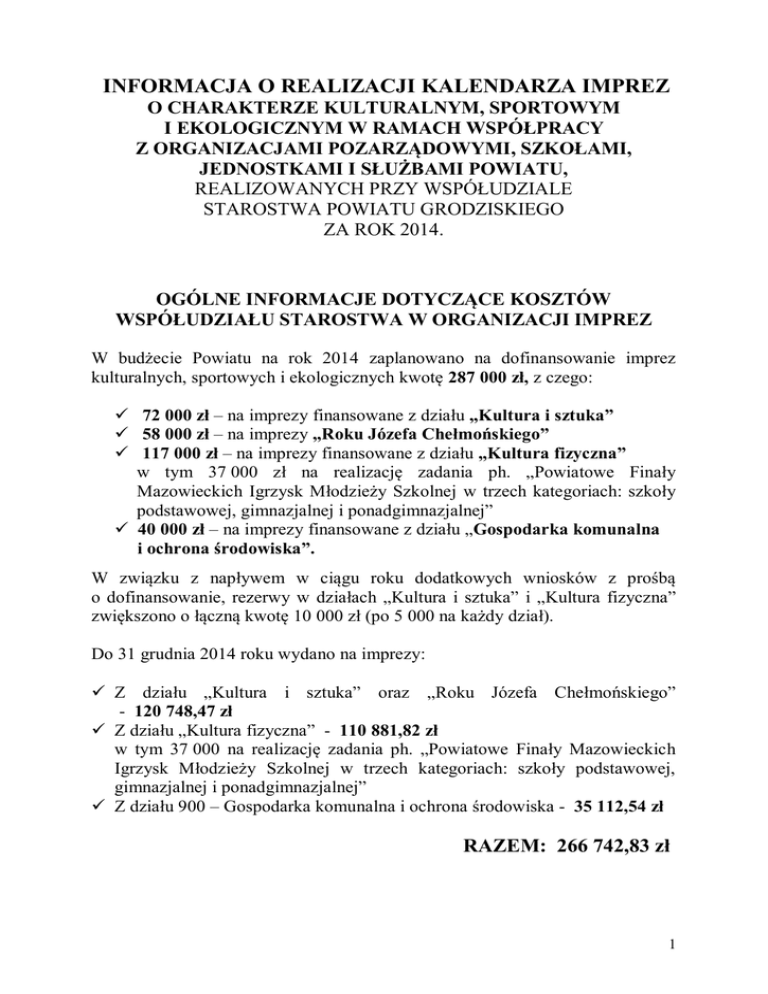 INFORMACJA O REALIZACJI KALENDARZA IMPREZ O CHARAKTERZE KULTURALNYM, SPORTOWYM I EKOLOGICZNYM W RAMACH WSPÓŁPRACY Z ORGANIZACJAMI POZARZĄDOWYMI, SZKOŁAMI, JEDNOSTKAMI I SŁUŻBAMI POWIATU, REALIZOWANYCH PRZY WSPÓŁUDZIALE STAROSTWA POWIATU GRODZISKIEGO ZA ROK 2014. OGÓLNE INFORMACJE DOTYCZĄCE KOSZTÓW WSPÓŁUDZIAŁU STAROSTWA W ORGANIZACJI IMPREZ W budżecie Powiatu na rok 2014 zaplanowano na dofinansowanie imprez kulturalnych, sportowych i ekologicznych kwotę 287 000 zł, z czego: 72 000 zł – na imprezy finansowane z działu „Kultura i sztuka” 58 000 zł – na imprezy „Roku Józefa Chełmońskiego” 117 000 zł – na imprezy finansowane z działu „Kultura fizyczna” w tym 37 000 zł na realizację zadania ph. „Powiatowe Finały Mazowieckich Igrzysk Młodzieży Szkolnej w trzech kategoriach: szkoły podstawowej, gimnazjalnej i ponadgimnazjalnej” 40 000 zł – na imprezy finansowane z działu „Gospodarka komunalna i ochrona środowiska”. W związku z napływem w ciągu roku dodatkowych wniosków z prośbą o dofinansowanie, rezerwy w działach „Kultura i sztuka” i „Kultura fizyczna” zwiększono o łączną kwotę 10 000 zł (po 5 000 na każdy dział). Do 31 grudnia 2014 roku wydano na imprezy: Z działu „Kultura i sztuka” oraz „Roku Józefa Chełmońskiego” - 120 748,47 zł Z działu „Kultura fizyczna” - 110 881,82 zł w tym 37 000 na realizację zadania ph. „Powiatowe Finały Mazowieckich Igrzysk Młodzieży Szkolnej w trzech kategoriach: szkoły podstawowej, gimnazjalnej i ponadgimnazjalnej” Z działu 900 – Gospodarka komunalna i ochrona środowiska - 35 112,54 zł RAZEM: 266 742,83 zł 1 Przyznane środki finansowe zostały wykorzystane między innymi na zakup różnego rodzaju nagród (m. in.: książek, artykułów plastycznych, drobnych przyborów sportowych, akcesoriów rowerowych, artykułów odblaskowych, drobnych gadżetów elektronicznych) pucharów, dyplomów, medali oraz pokrycie kosztów związanych z poczęstunkiem dla uczestników. REALIZACJA IMPREZ Z ZAPLANOWANYCH IMPREZ W 2014 ROKU ZREALIZOWANO: 36 imprez z działu „Kultura i sztuka” (zaplanowanych zostało 37 imprez) 12 imprez „Roku Józefa Chełmońskiego”(zaplanowanych zostało 12) 41 imprez z działu „Kultura fizyczna” (zaplanowanych zostało 44 imprez) 8 imprez z działu 900 – Gospodarka komunalna i ochrona środowiska (zaplanowanych zostało 10 imprez) 45 40 35 30 25 zaplanowano zrealizowano 20 15 10 5 0 Kultura i Sztuka Rok J. Chełmońskigo Gospodarka Kultura Fizyczna komunalna i ochrona środowiska Stan na 31 grudnia 2014 r. 2 Ponadto Zarząd Powiatu Grodziskiego dofinansował z zaplanowanej rezerwy kilka przedsięwzięć zgłoszonych we wnioskach, napływających sukcesywnie w ciągu roku. W związku z powyższym dodatkowo odbyły się między innymi: XVI Rajd Szlakami Walk Grupy „Kampinos” AK – Hufiec Jaktorów, Konwent Młodzieży z Powiatu Grodziskiego – Młodzieżowa Rada Gminy Baranów, Piknik demokracji - Stowarzyszenie 4 Czerwca, Koncert z okazji Święta Niepodległości – Akcja Katolicka przy Parafii Matki Bożej Nieustającej Pomocy, Jubileuszowe Obchody 50-lecia istnienia klubu Honorowych Dawców Krwi- Polski Czerwony Krzyż im. Jana Kustosza przy Gedeon Richter Polska Sp. z o. o., Piknik Demokracji – Stowarzyszenie 4 Czerwca, I Turniej Squosha – Klub ASTRA Andrzej Słowiński, Rowerowy Rajd Wolności – Podkowiańskie Towarzystwo Biegowe. W imprezach planowanych w kalendarzu na rok 2014 udział brali uczniowie szkół podstawowych, gimnazjalnych i ponadgimnazjalnych z Powiatu Grodziskiego oraz osoby dorosłe i dzieci z przedszkoli. Wiele imprez znajdujących się w Powiatowym Kalendarzu miało charakter ponad powiatowy a także ogólnopolski. W imprezach finansowanych z działu „Kultura i sztuka” uczestniczyło ok. 8000 osób W imprezach „Roku Józefa Chełmońskiego” ok. 1700 osób W imprezach finansowanych z działu „Kultura fizyczna” ok. 8000 osób W imprezach finansowanych z działu 900 – Gospodarka komunalna i ochrona środowiska ok. 4000 osób Realizacja zadań planowanych w Kalendarzu Imprez była jednym z podstawowych elementów programu poprawy stanu bezpieczeństwa dzieci i młodzieży w szkołach Powiatu Grodziskiego na lata 2011 – 2014 pod hasłem „ŚWIADOMI, AKTYWNI, BEZPIECZNI” 3 Powiatowy kalendarz imprez o charakterze kulturalnym, sportowym i ekologicznym na rok 2014 (realizacja) I. L.p. 1. IMPREZY WSPÓŁFINANSOWANE Z DZIAŁU KULTURA I SZTUKA Główny organizator Sekcja emerytów przy ZNP w Grodzisku Mazowieckim 2. Starostwo Powiatu Grodziskiego 3. 5. Zespół Szkół Nr 2 im. gen. J. Bema w Milanówku Fundacja Krzewienia Kultury i Nauki „PROMOTOR” Polski Związek Niewidomych 6. Starostwo Powiatu Grodziskiego 4. 7. Chór „CANTATA” 8. Zespół Szkół Nr 2 Tech. i Lic. w Grodzisku Maz. Zespół Szkół Nr 2 im. gen. J. Bema w Milanówku Towarzystwo Przyjaciół Dzieci 9. 10. 11. 12. 13. 14. 15. 16. 17. 18. Zespół Szkół Nr 2 Tech. i Lic. w Grodzisku Maz. Muzeum im. A. i J. Iwaszkiewiczów w Stawisku Zespół Szkół Nr 1 w Milanówku Zespół Szkół im. H. Szczerkowskiego w Grodzisku Mazowieckim Zespół Szkół Nr 2 Tech. i Lic. w Grodzisku Maz. Zespół Szkół Nr 2 im. gen. J. Bema w Milanówku Nowa Prywatna Szkoła Podstawowa w Milanówku Szkoła Podstawowa im. dra M. Chełmońskiego w Adamowiźnie Nazwa imprezy Noworoczne spotkanie dla nauczycieli emerytów i emerytowanych pracowników oświaty Spotkanie noworoczne dla dzieci z rodzin zastępczych „Twórcza Noc” Przedstawienie „Mały Książe” Imprezy Polskiego Związku Niewidomych – członków z Powiatu Grodziskiego wg Kalendarza PZN Spotkania integracyjne nauczycieli i uczniów ze szkoły polskiej we Lwowie i Nowym Rozdole z nauczycielami i uczniami szkół Powiatu Grodziskiego Imprezy Chóru „CANTATA” Grodziski Przegląd Piosenki z Tekstem „Kręci mnie ten świat” VII Powiatowy konkurs ort